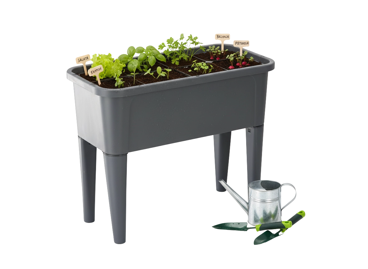 Det robuste korpus i holdbar PP klarer omskiftelige forhold året rundt, og den antracitgrå farve passer til moderne udendørsområder. Højden på 83 cm skåner ryggen og gør vanding og vedligeholdelse lettere – uanset om du dyrker på terrasse, altan eller ved højbede.