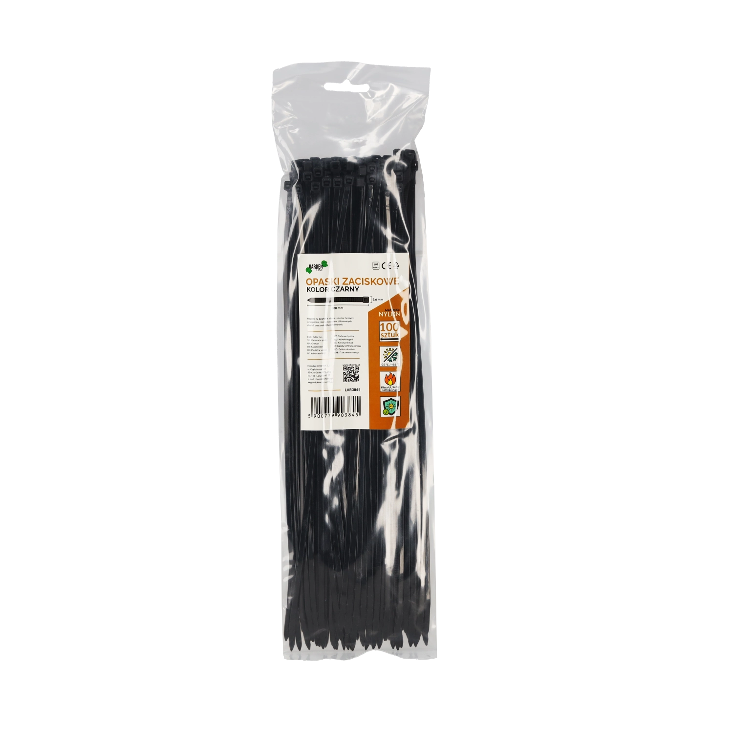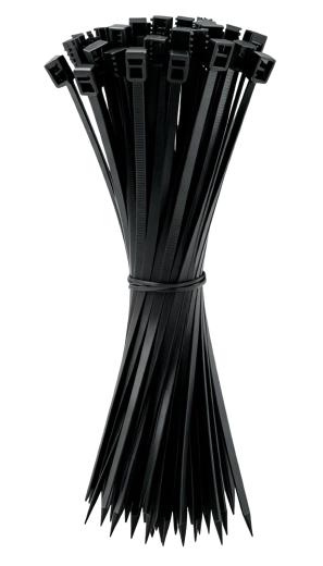 Praktisk sæt sorte kabelbindere i størrelsen 3,6 × 300 mm til alsidig brug i hjemmet, værkstedet og industrien. Fremstillet af kvalitetsnylon med selvslukkende klassificering UL 94 V2, UV-bestandighed og et bredt temperaturområde for brug. Båndene er resistente over for olie, smøremidler, benzin og detergenter, og pakken indeholder 100 stk.