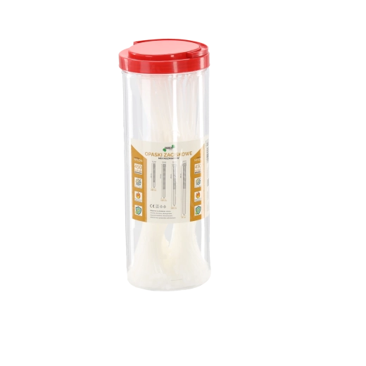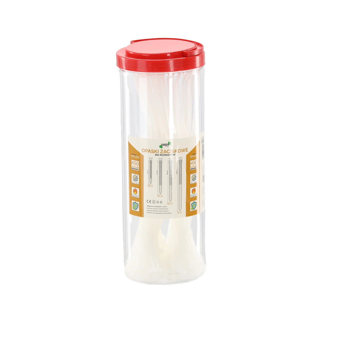 Det praktiske rør indeholder i alt 450 stk nylon-kabelbindere i forskellige størrelser til alsidig brug i hjemmet, værkstedet og industrien. Båndene er selvslukkende (UL 94 V2), har et bredt temperaturområde og takket være en speciel UV-bestandig sammensætning tåler de krævende forhold. De er resistente over for olier, smøremidler, benzin og andre kemikalier.