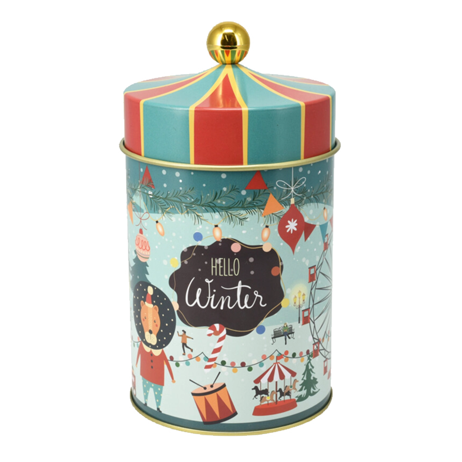 Denne runde metaldåse kombinerer praktisk opbevaring med et imponerende vinterdesign. Det robuste udførsel i holdbart metal og det tætsluttende låg beskytter lækkerier mod fugt og luft, så de forbliver sprøde og velduftende længere. De kompakte mål gør den let at placere på køkkenbord, hylde eller i skab.