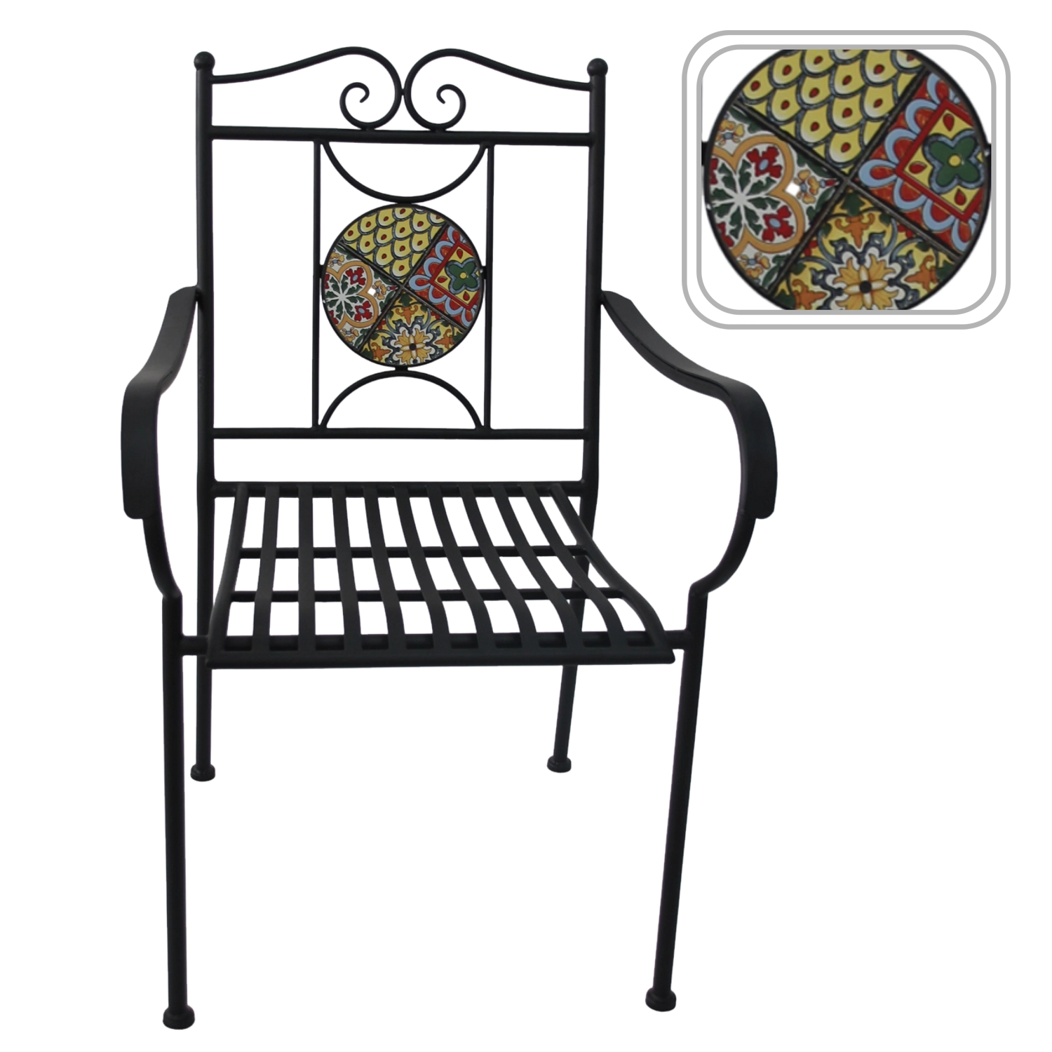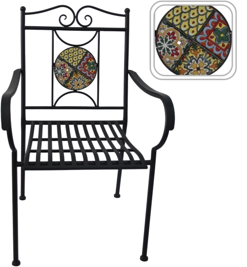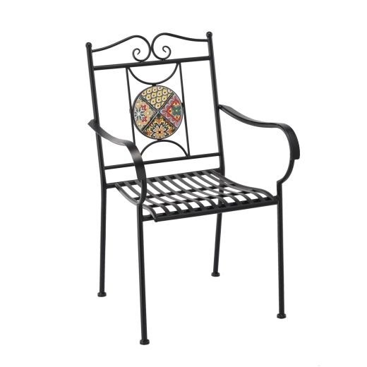 Den runde mosaikmedaljon i ryglænet giver stolen et markant udtryk og bliver et smukt blikfang i enhver udendørs siddegruppe.