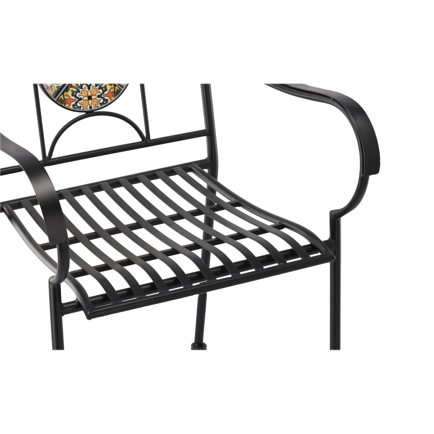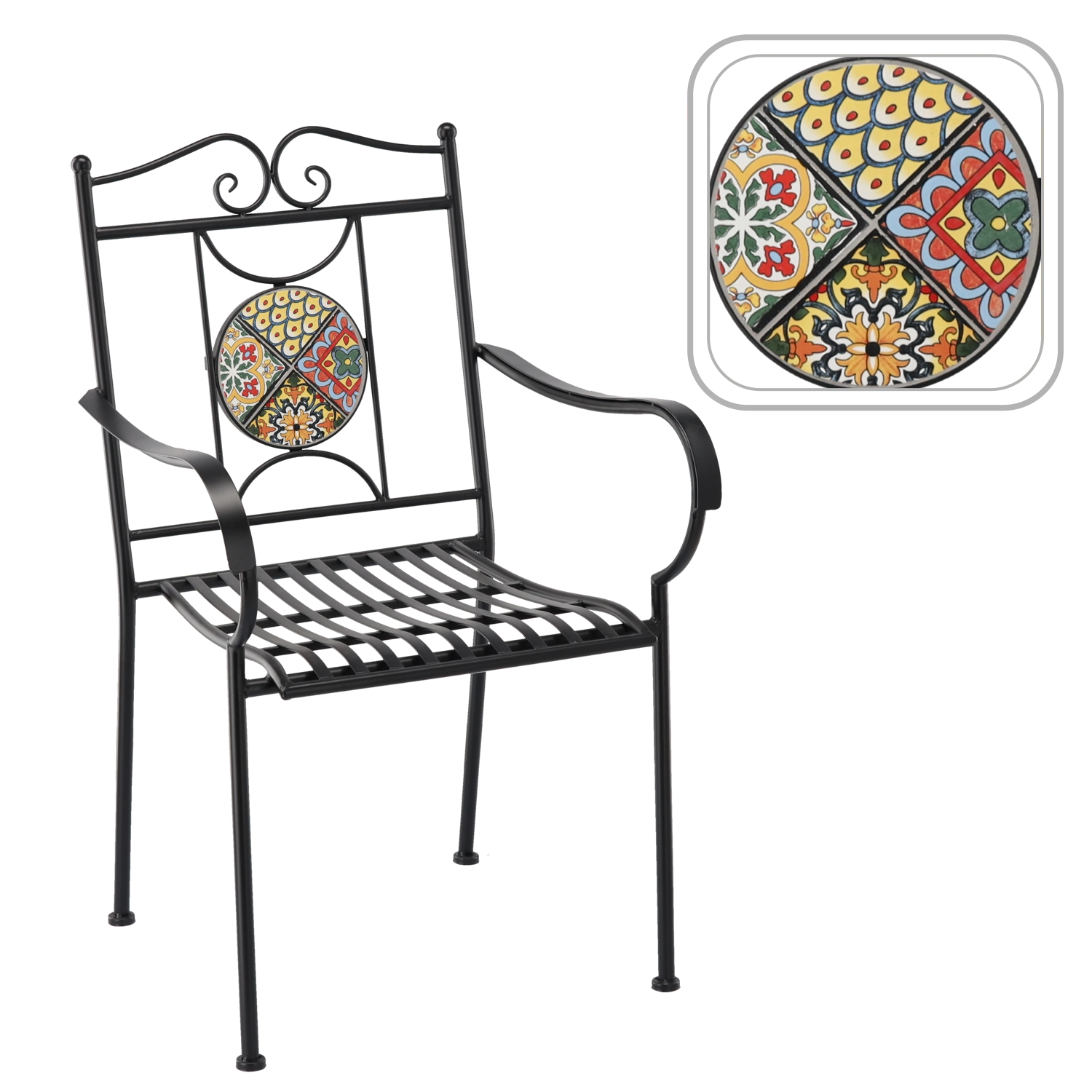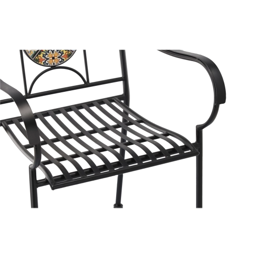 Metal havestol med mosaik imponerer med en effektfuld rund medaljon i ryglænet og en tidløs sort ramme. Takket være den faste svejsede konstruktion og det lamelformede sæde egner den sig til udendørs brug gennem hele sæsonen og er let at vedligeholde – vandet løber naturligt af.