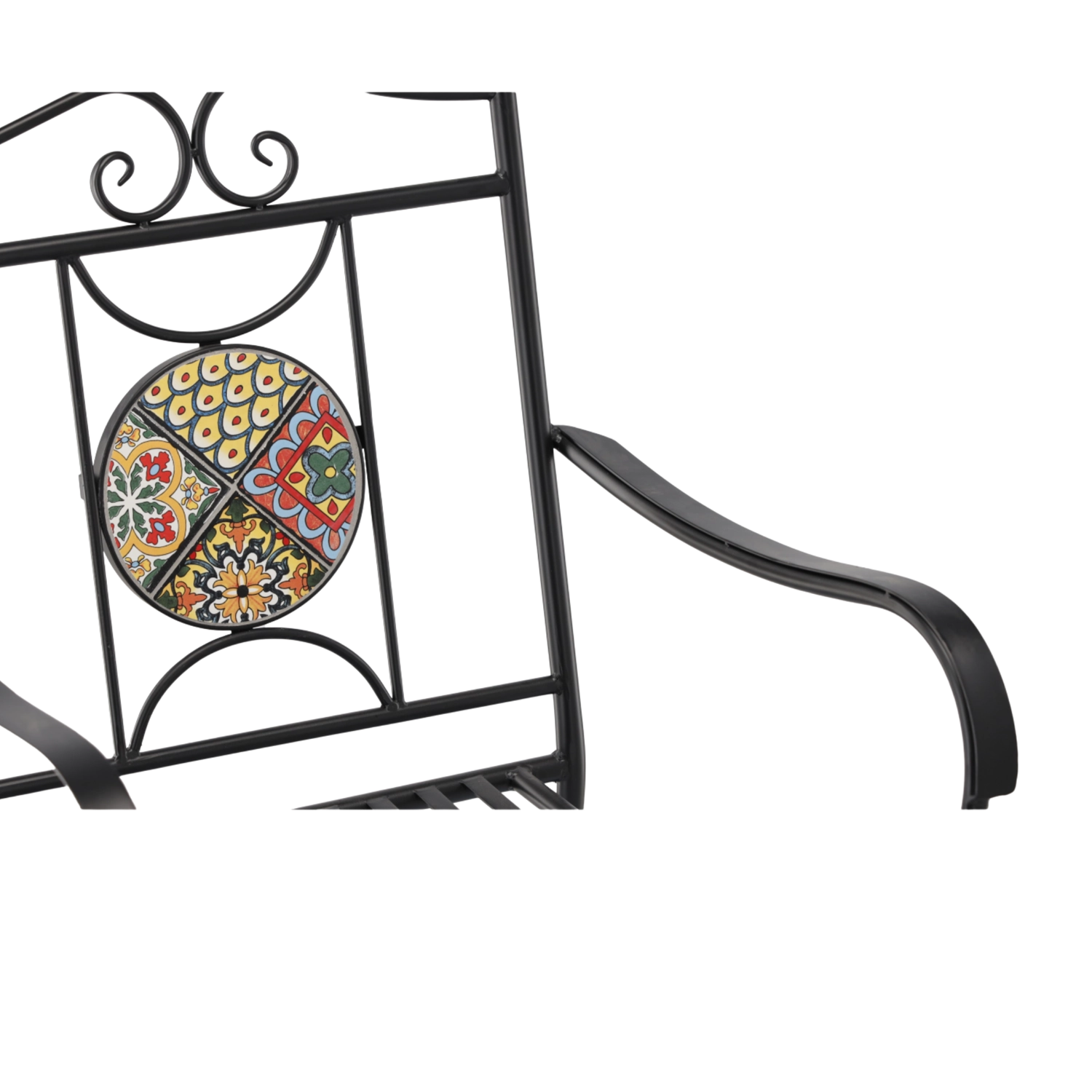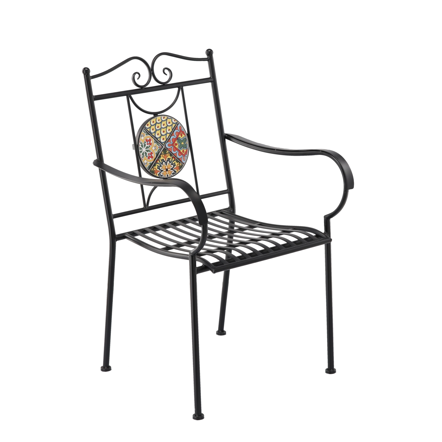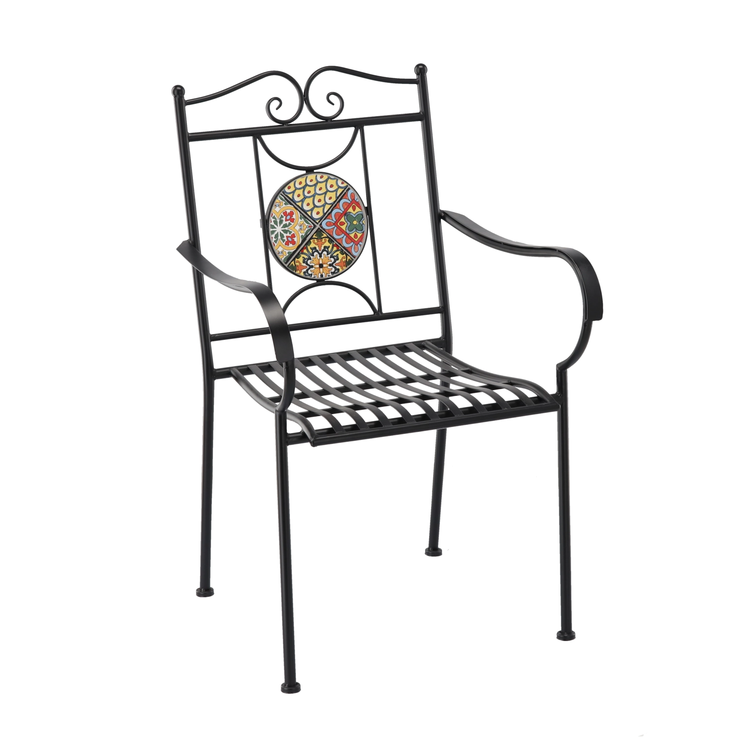 Metal havestol med mosaik imponerer med en effektfuld rund medaljon i ryglænet og en tidløs sort ramme. Takket være den faste svejsede konstruktion og det lamelformede sæde egner den sig til udendørs brug gennem hele sæsonen og er let at vedligeholde – vandet løber naturligt af.