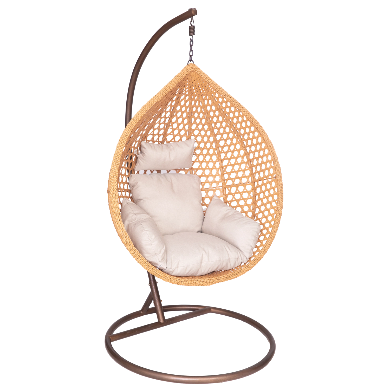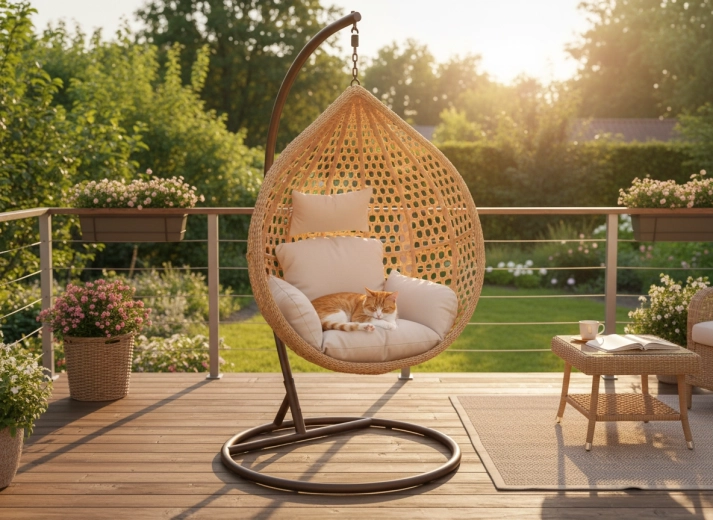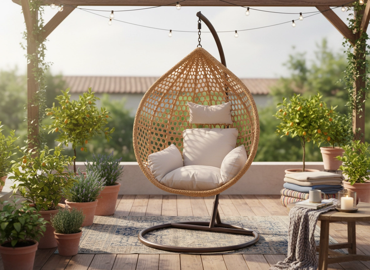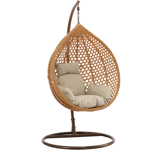 Oplev komfort og stil i ét – den æggeformede hængestol med rummelig kurv giver en hyggelig siddeplads til daglig afslapning. Det naturlige fletudtryk matcher perfekt både moderne og klassiske ude- og indemiljøer, mens det bløde polster støtter både ryg og hoved.