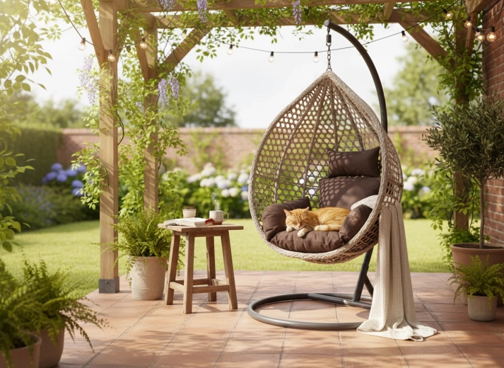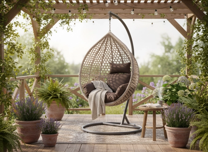 Tykke sæder og ryglæn skaber en hyggelig “rede” til læsning, afslapning og hygge i frisk luft.