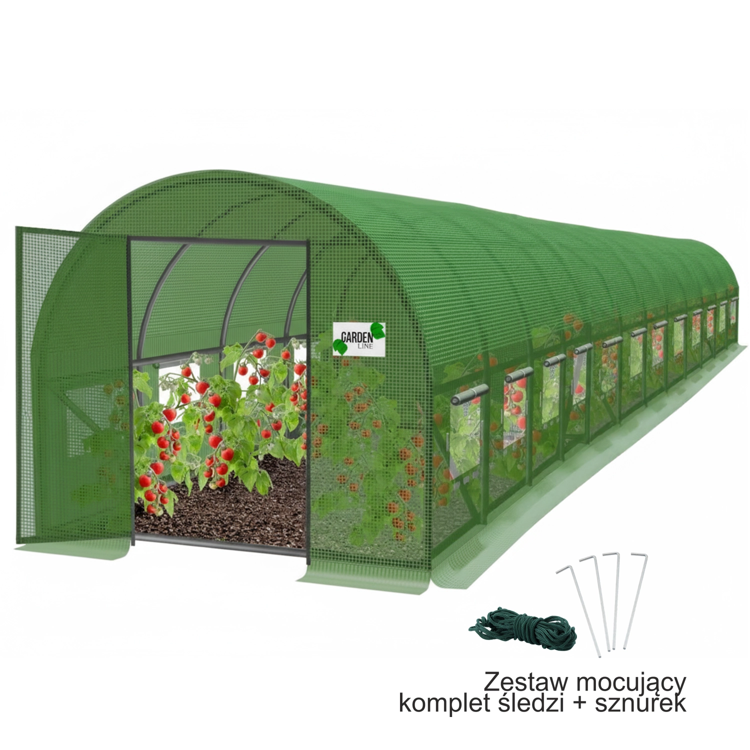 Stærk galvaniseret ramme af rør Ø 25 mm (tykkelse 0,65 mm) med jordkant og pløkker i pakken sikrer stabilitet. 24 ventilationsvinduer med myggenet gør det muligt at regulere luftstrømmen, reducere fugt og beskytte mod insekter. Ekstra overliggende stænger gør det nemt at lede klatreplanter (tomater, agurker, ærter).
