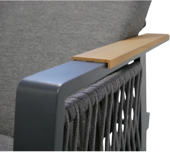 8 cm hynder, træarmlæn og sideflet i reb giver høj komfort og et moderne udtryk.