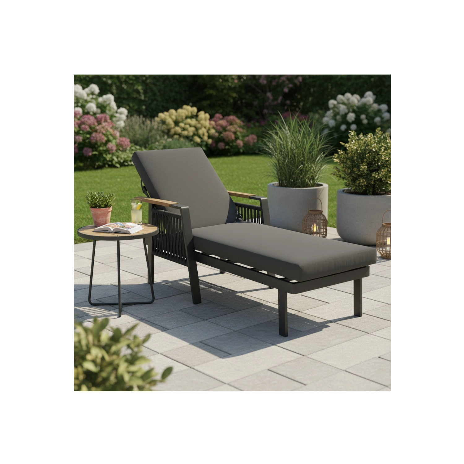 Nyd den perfekte afslapning i det fri med Skopje have-liggestolen. Takket være den stærke aluminiumsramme, det justerbare ryglæn og de kraftige 8 cm hynder får du maksimal komfort på både terrasse og i have. Det elegante grå design med træarmlæn og sideflet af reb fuldender et moderne udendørsmiljø.
