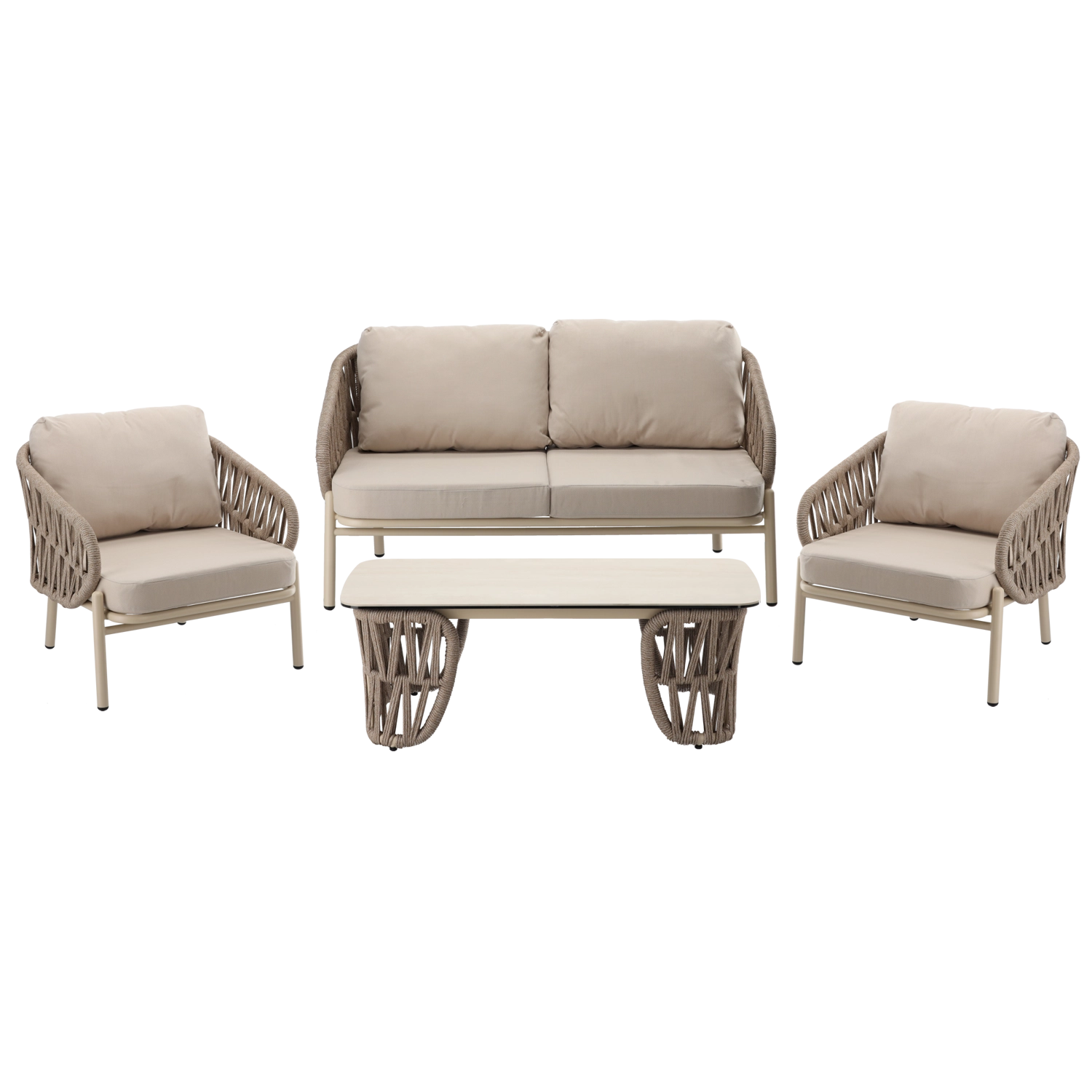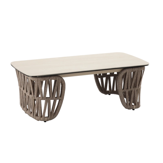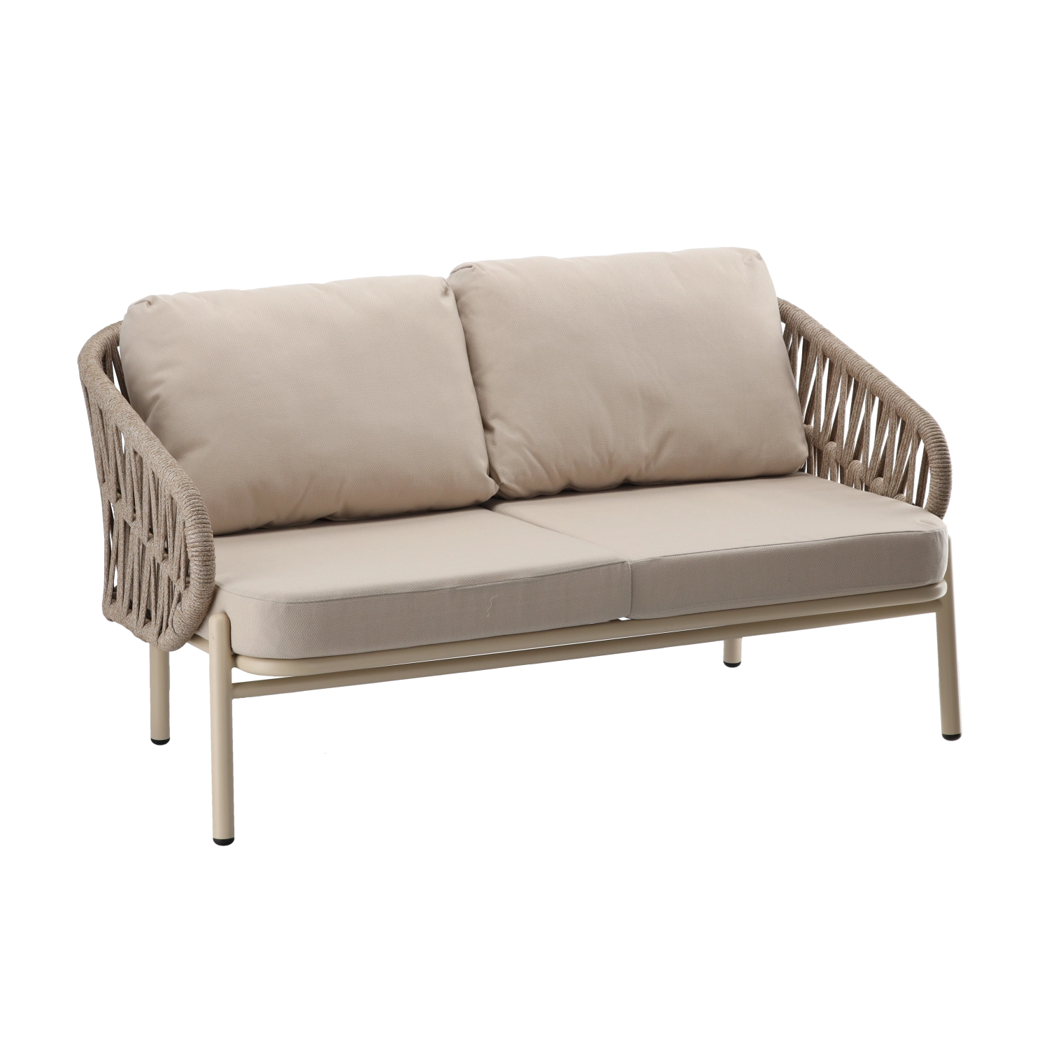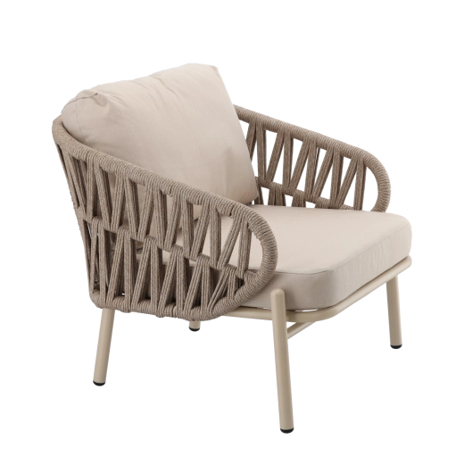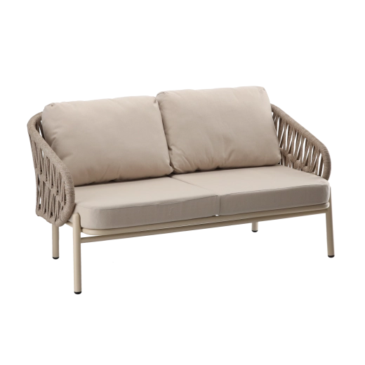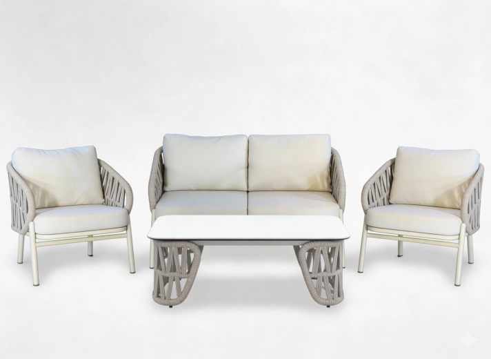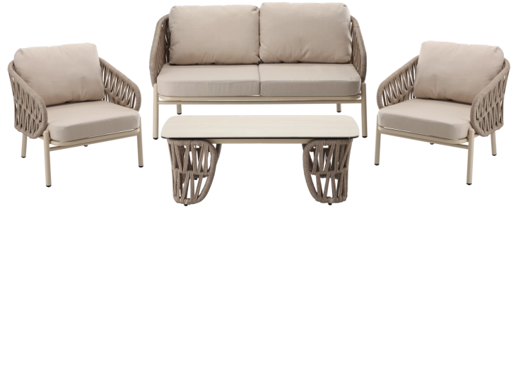 Sættet indeholder en tosædet sofa, 2 komfortable lænestole og et rummeligt sofabord. Den lette, men stærke aluminiums-konstruktion med pulverlakering er vejr- og korrosionsbestandig, så sættet uden problemer klarer sæson efter sæson. Den neutrale beige farve og de flettede sidepaneler giver et tidløst elegant udtryk.