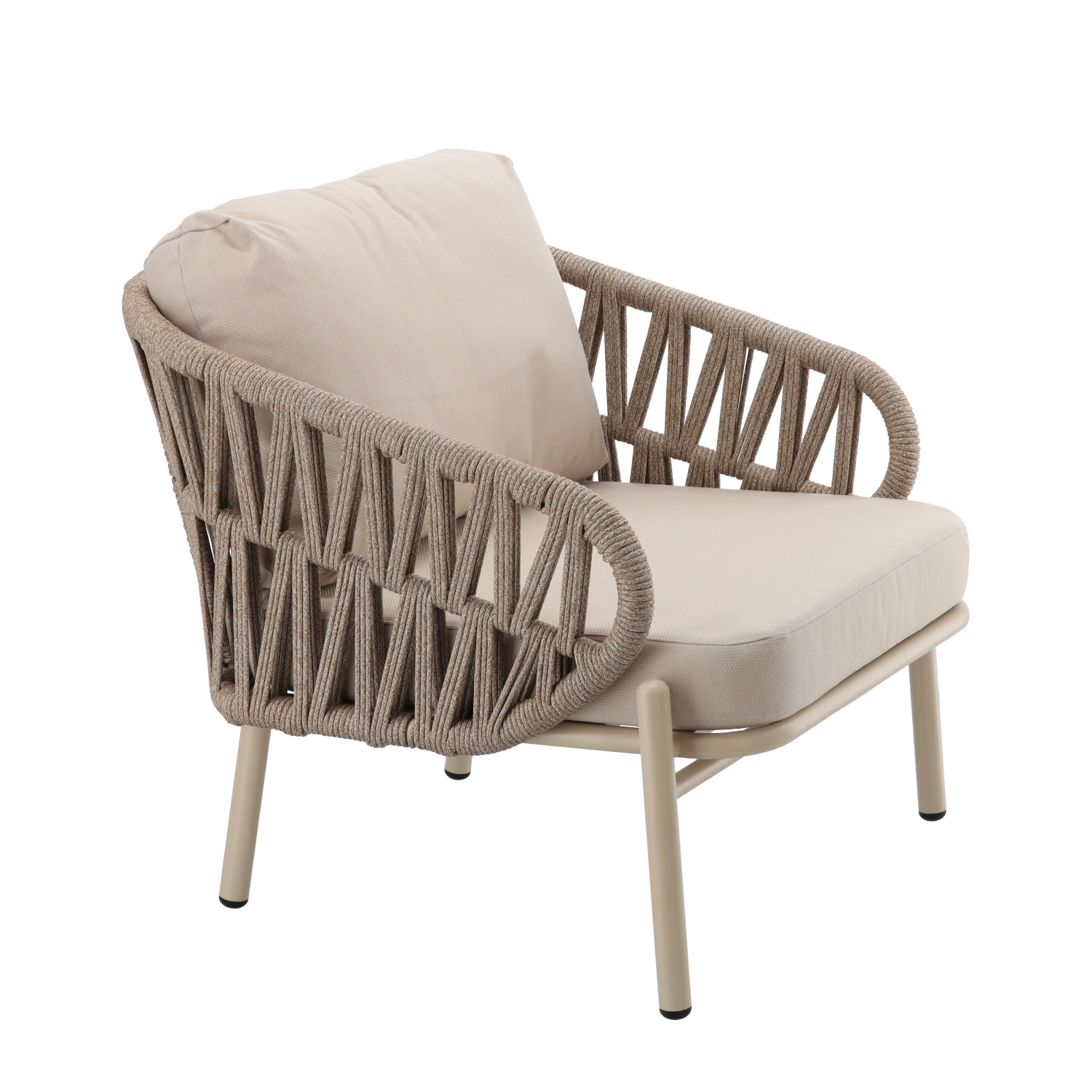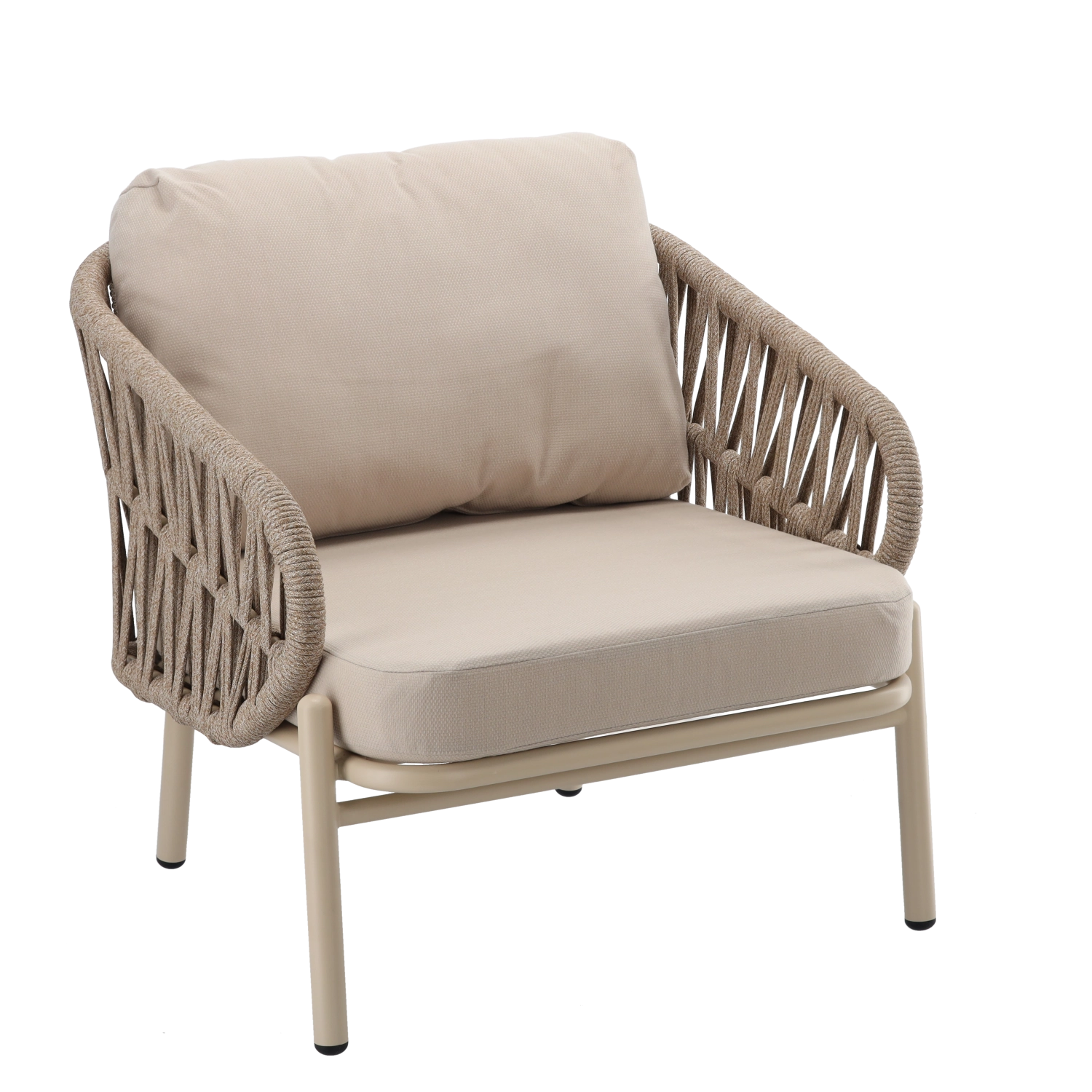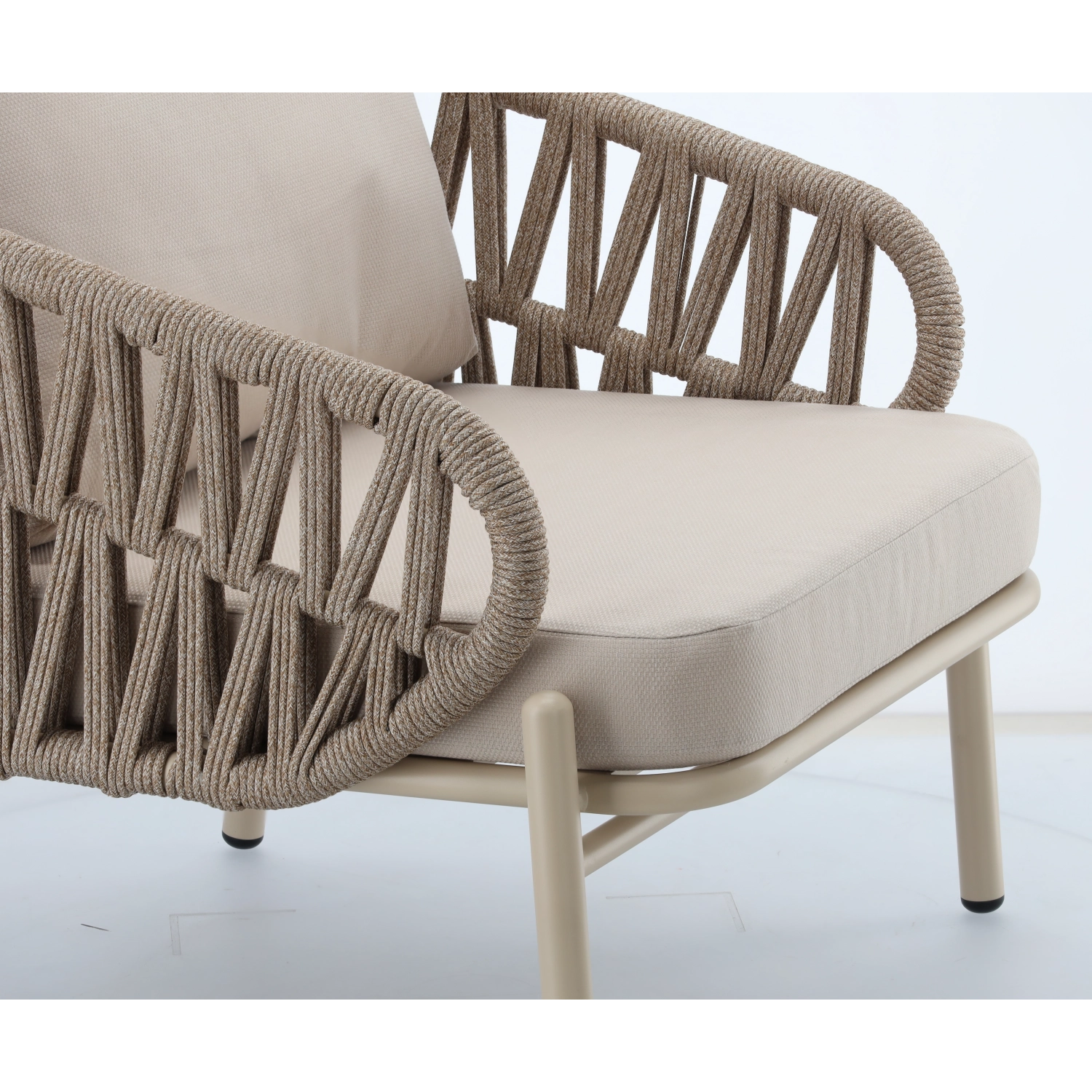 Sættet indeholder en tosædet sofa, 2 komfortable lænestole og et rummeligt sofabord. Den lette, men stærke aluminiums-konstruktion med pulverlakering er vejr- og korrosionsbestandig, så sættet uden problemer klarer sæson efter sæson. Den neutrale beige farve og de flettede sidepaneler giver et tidløst elegant udtryk.
