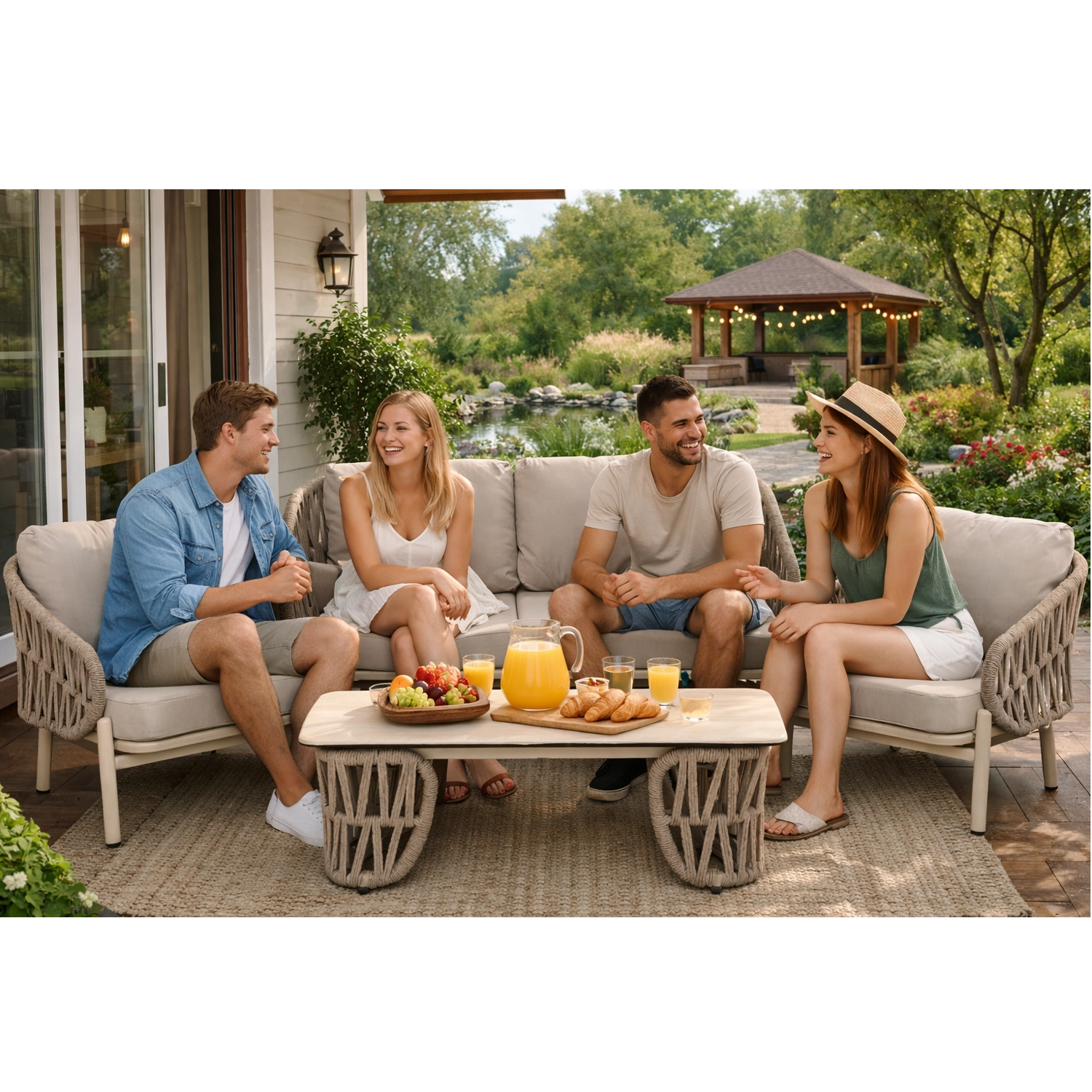 De kraftige 10 cm hynder i Olefin-stof med holdbar fyldning giver enestående komfort til samvær med familie og venner. Det stabile bord med dekorativt, luftigt understel og slidstærk bordplade giver rigelig plads til kaffe og servering.