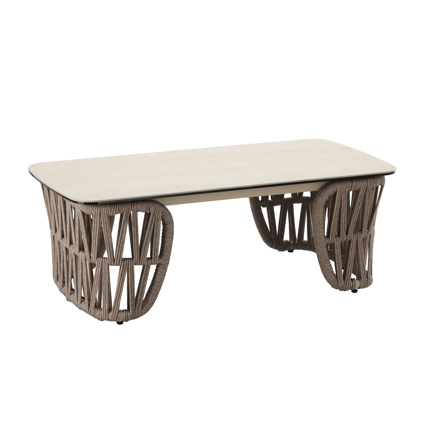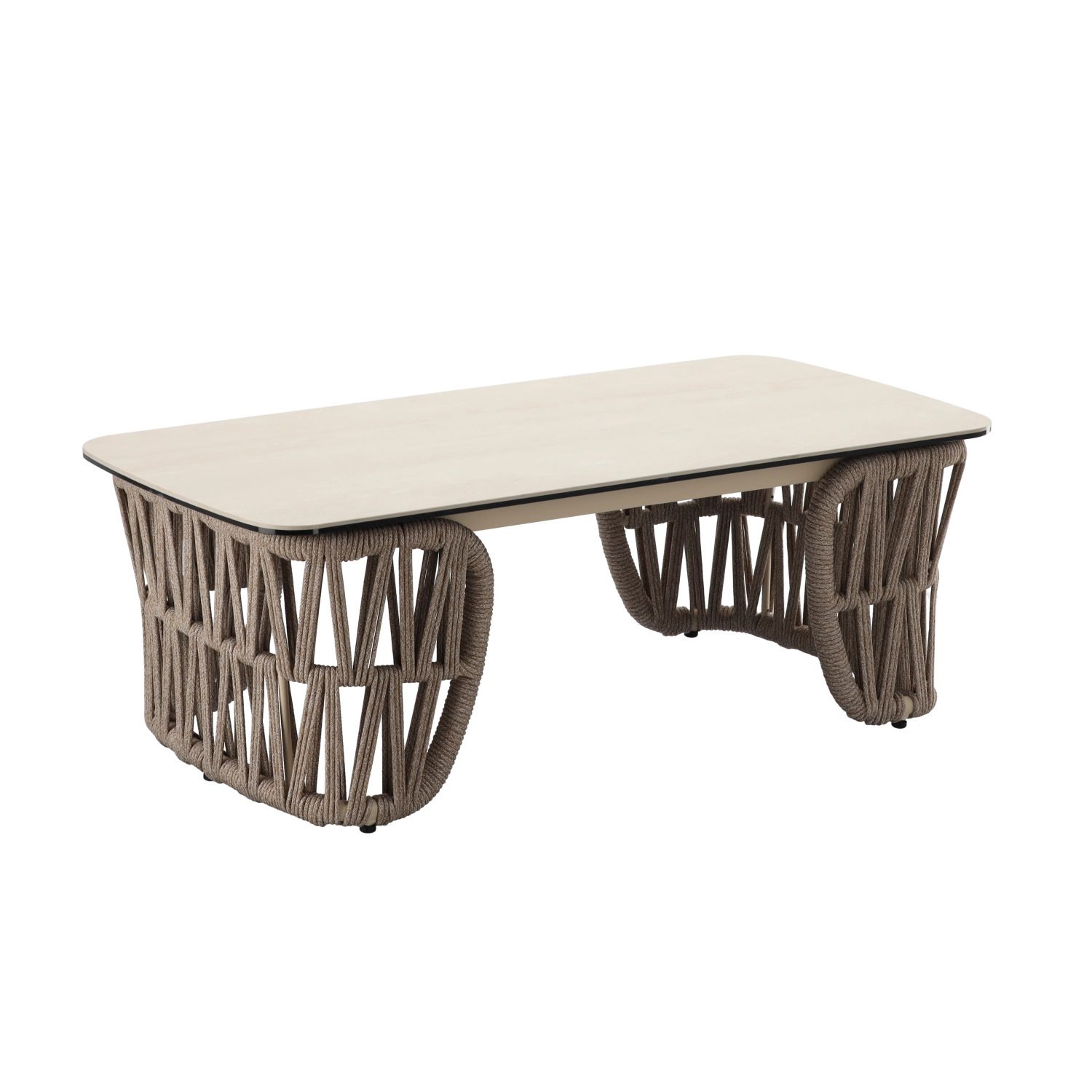 En rummelig bordplade med elegant flettet understel tilbyder en stabil afsætningsflade til drikkevarer, dekorationer og snacks.