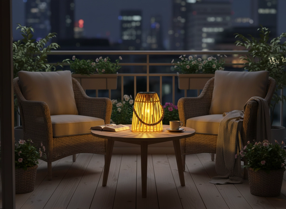 Det varme gule lys skaber en hyggelig stemning til hyggestunder på altanen, terrassen eller i haven – ideelt til afslapning med en bog eller et glas.