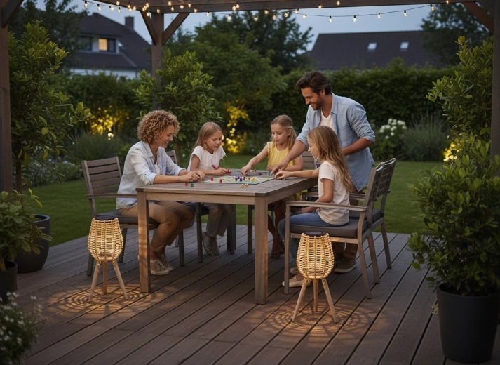 Takket være trådløs drift kan du nemt placere den hvor som helst – på træterrassen, langs havestien eller på altanen. Det flettede rattanlook giver rummet et moderne boho-præg, og træbenene sikrer stabilitet og et elegant udtryk.