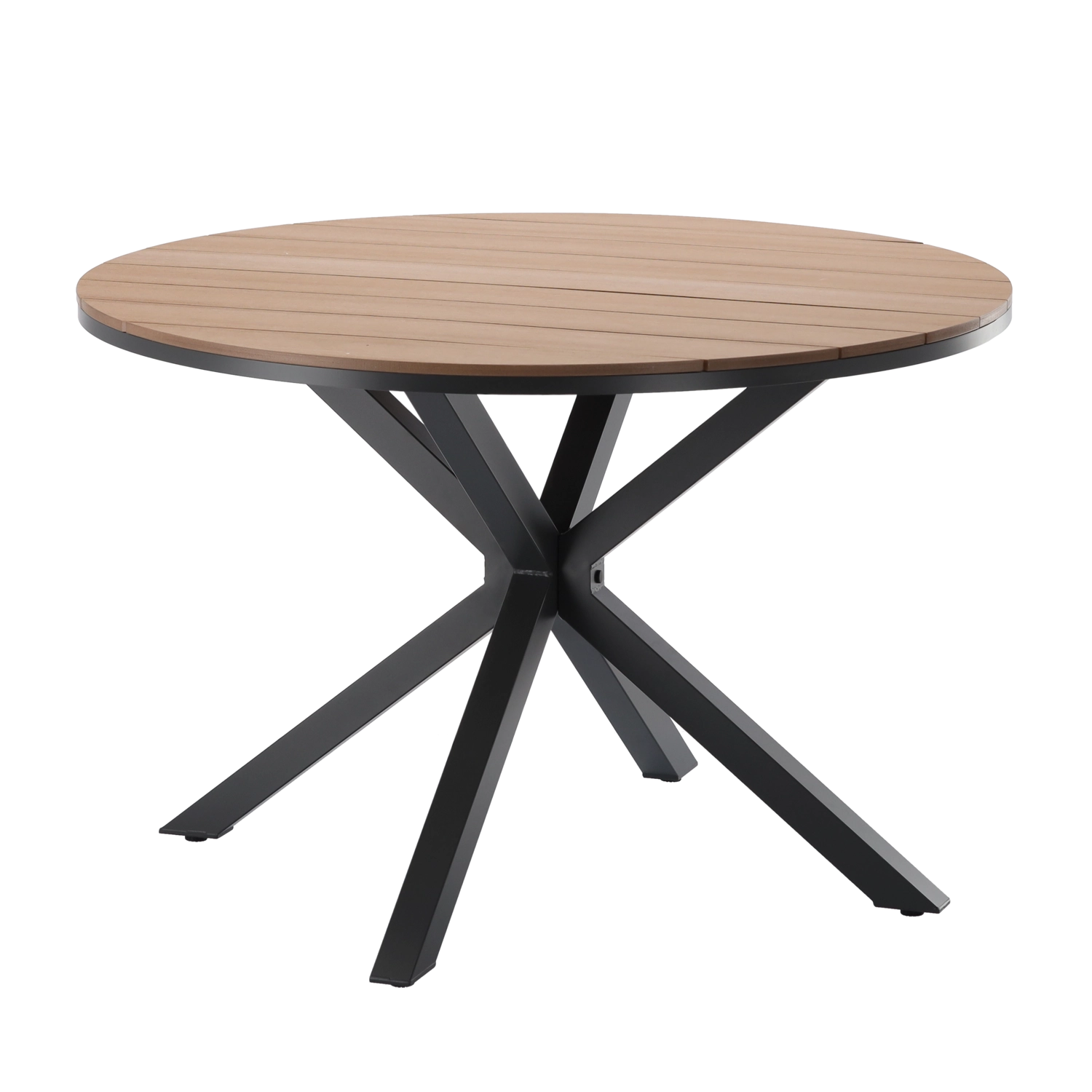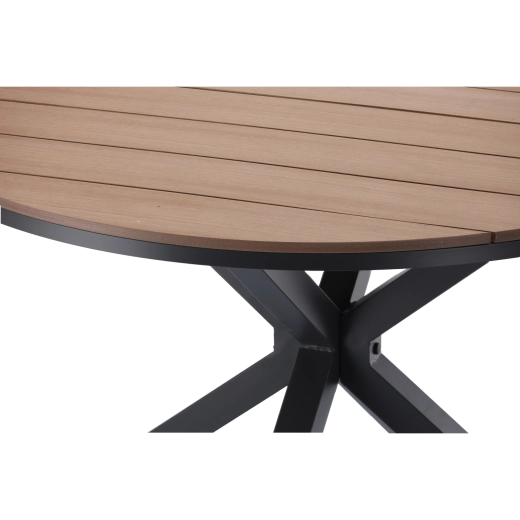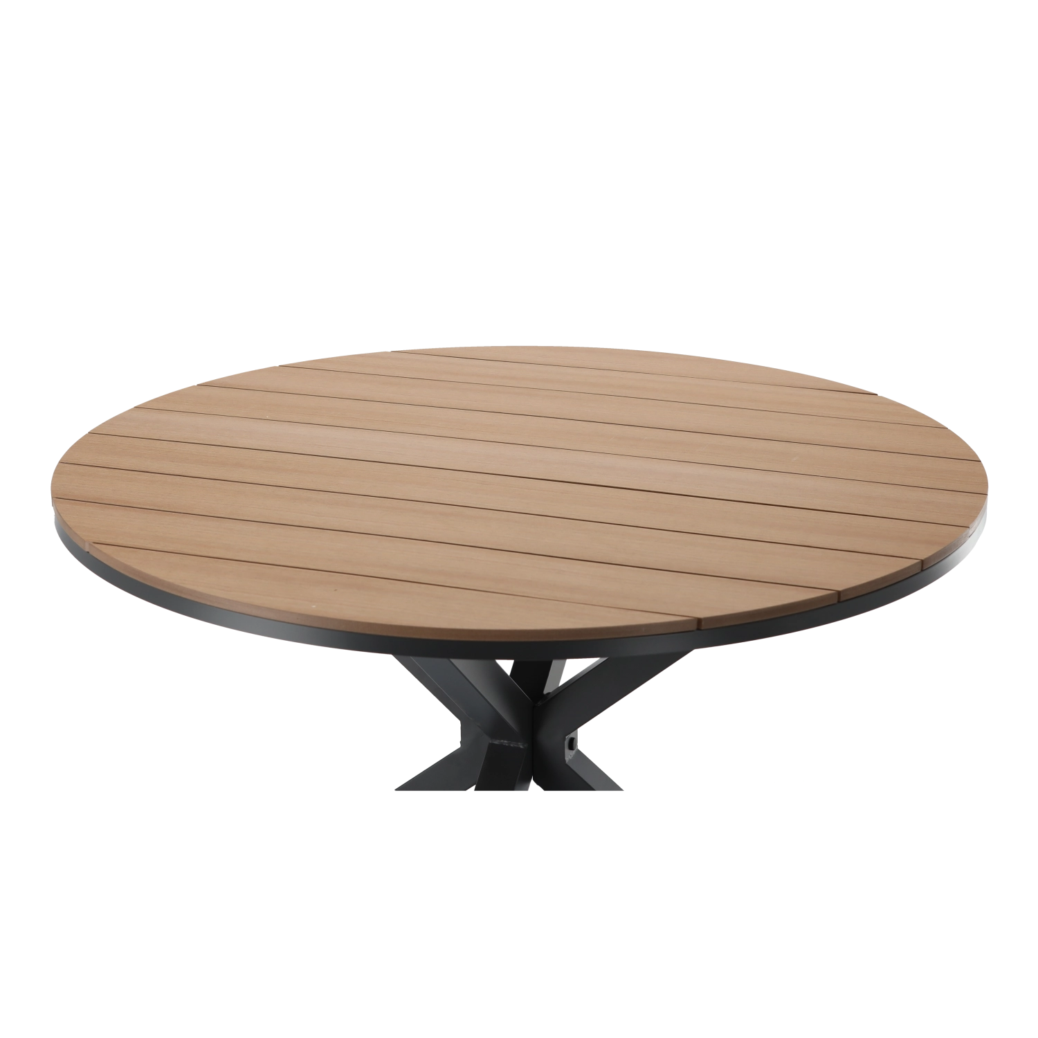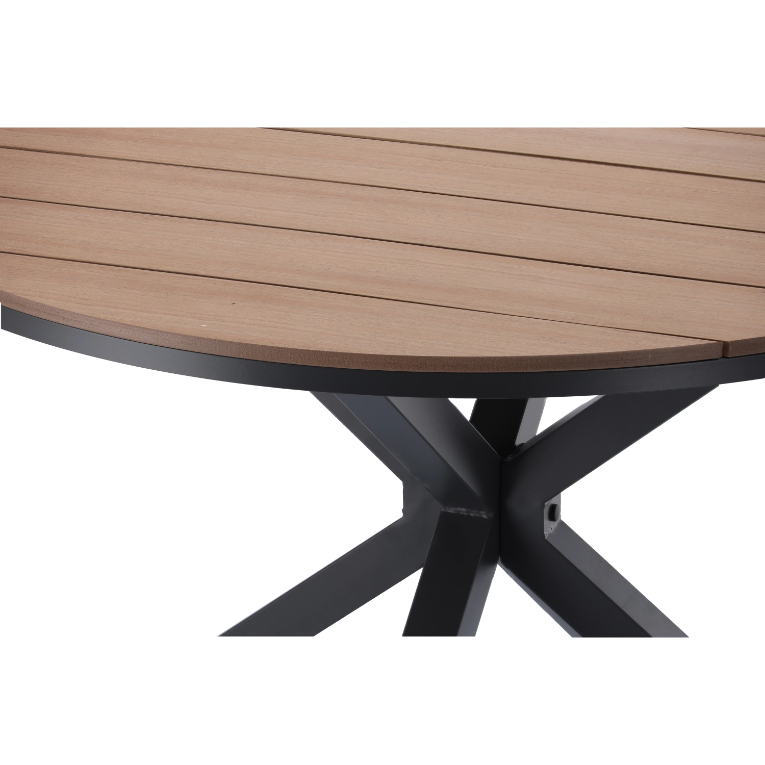 Dette runde udendørsbord tilbyder den ideelle balance mellem stil og funktionalitet. Den pulverlakerede aluminiumsramme sikrer høj korrosionsbestandighed og lav vægt for nem håndtering. Polywood-bordpladen med planke-look giver et naturligt træudtryk uden krævende vedligeholdelse.