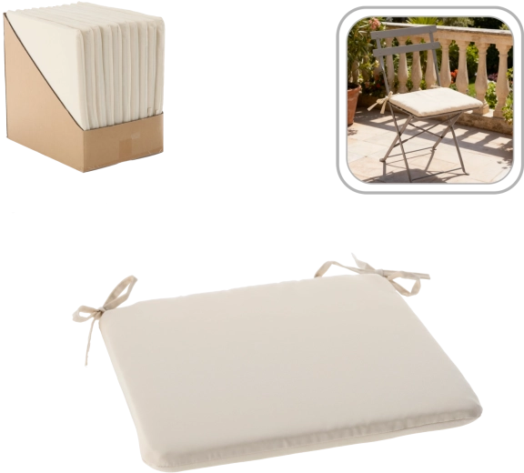 Den elegante beige stolepude imponerer med sit universelle udseende og praktiske detaljer. Bløde polyesterfibre sørger for komfort i hverdagen, mens det slidstærke polyesterbetræk med let beskyttelse mod dråber bedre håndterer hverdagens små uheld i køkkenet og udendørs.
