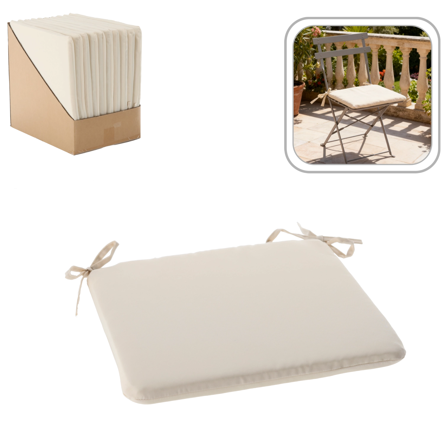 Giv dine stole og udendørs siddepladser mere komfort og stil med en beige sædepude 40 × 40 × 3 cm. Takket være den bløde fyldning tilbyder den behagelig siddekomfort, praktiske bindesnore til fastgørelse holder puden på plads, og lynlåsen muliggør nem vedligeholdelse. Materialet har let modstandsdygtighed mod stænk og er ideelt både indendørs og på terrassen.