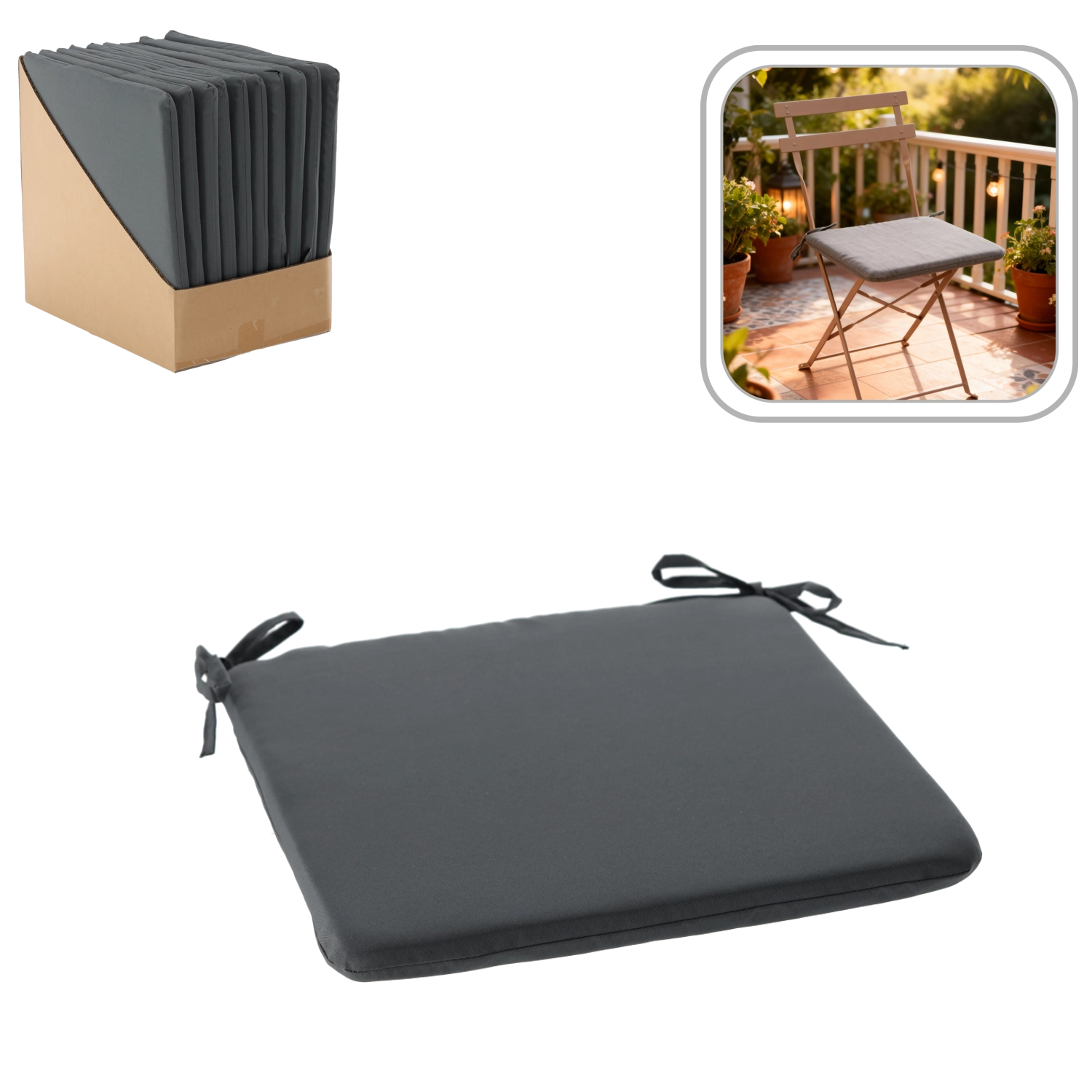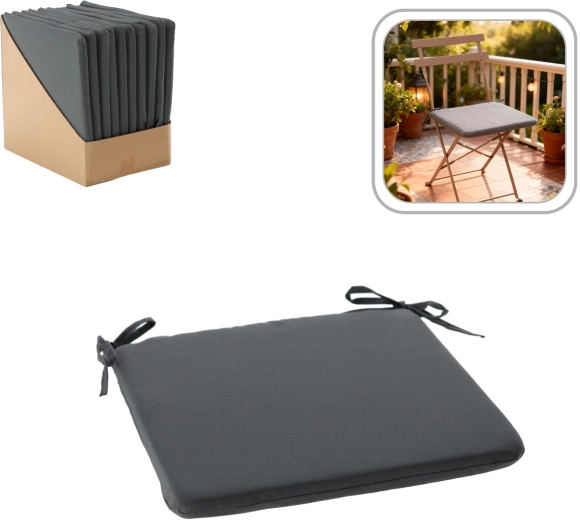 Denne komfortable sædepude i størrelsen 40 × 40 × 3 cm gør siddestillingen blødere og beskytter samtidig stolen. Den er tynd, men behageligt polstret og giver komfort ved daglig brug både inde og ude. Den mørkegrå nuance er tidløs, let at kombinere og virker elegant.