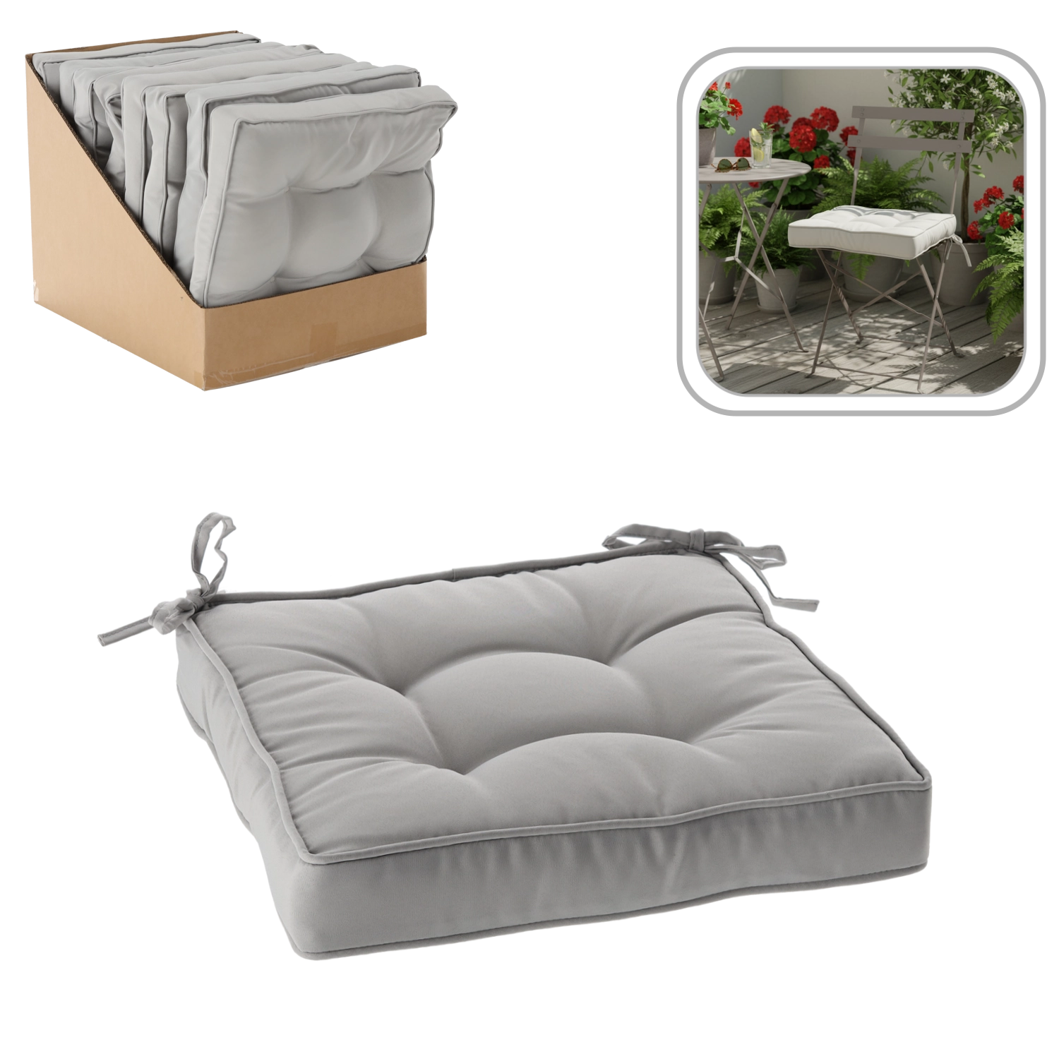 En stilfuld lysegrå stolehynde i målene 40 × 40 × 6 cm, der giver komfortabel siddeplads både hjemme og i haven. Takket være blød polyesterfyld og slidstærkt betræk holder den formen, føles behagelig at røre ved og er nem at vedligeholde. Bindebånd sikrer stabilitet på stolen, og dekorative stikninger giver et elegant udtryk i enhver indretning.