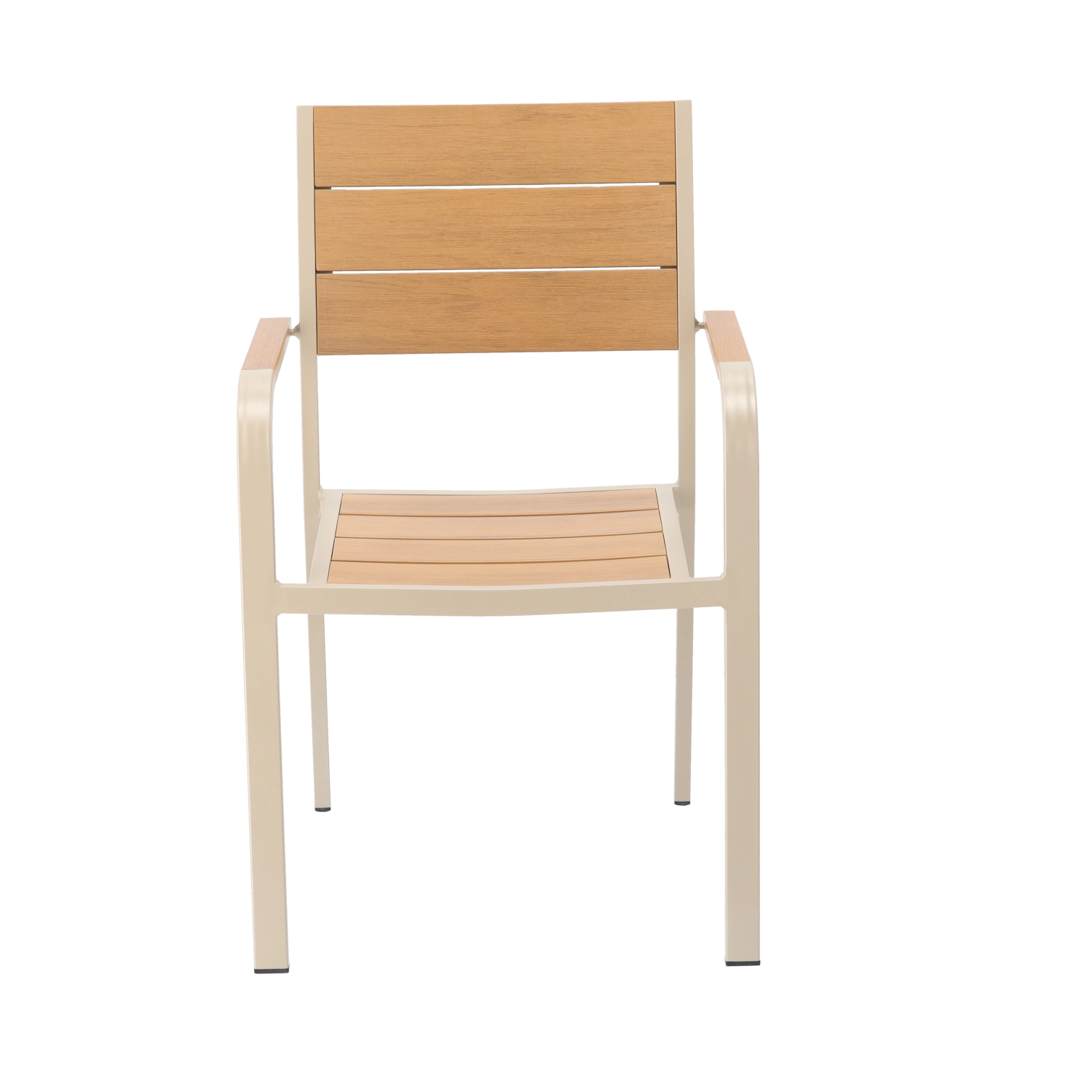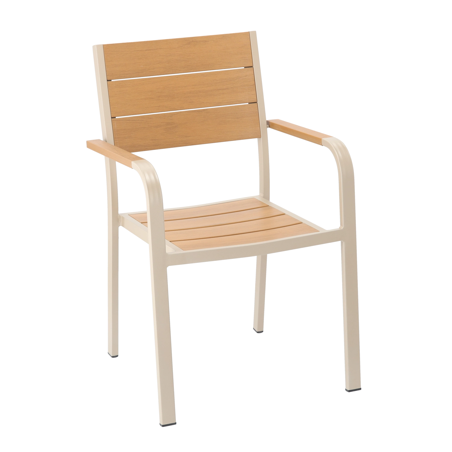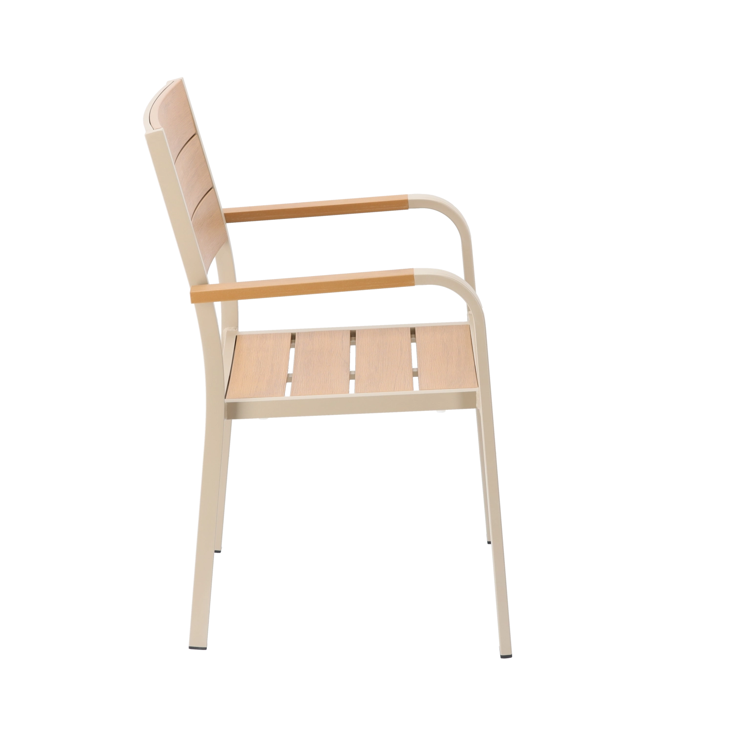 Den elegante beige havestol kombinerer et let aluminiumschassis med lameller i trædekor for et naturligt udtryk uden krævende vedligeholdelse. Takket være pulverlakeringen modstår den fugt, sol og daglig brug og passer perfekt til både moderne og klassiske udemiljøer.