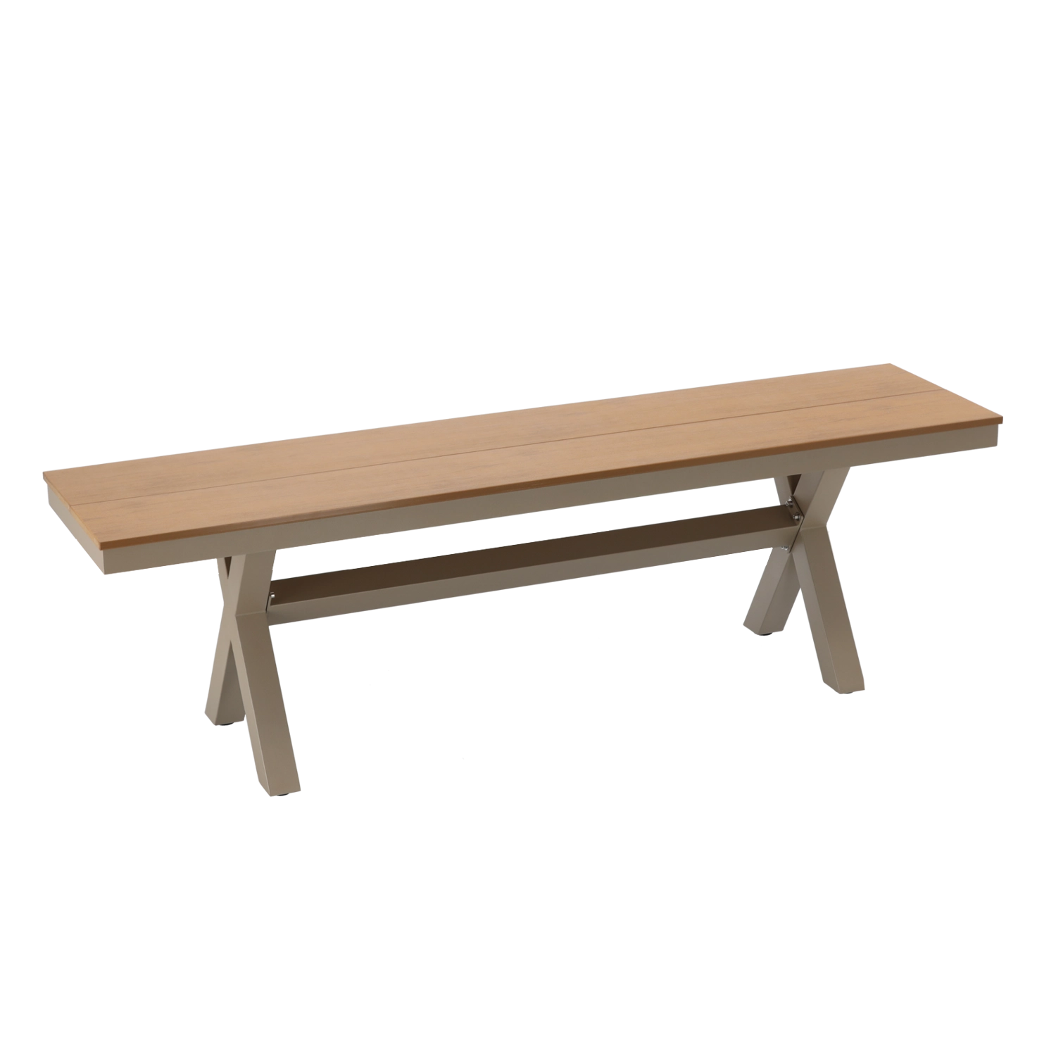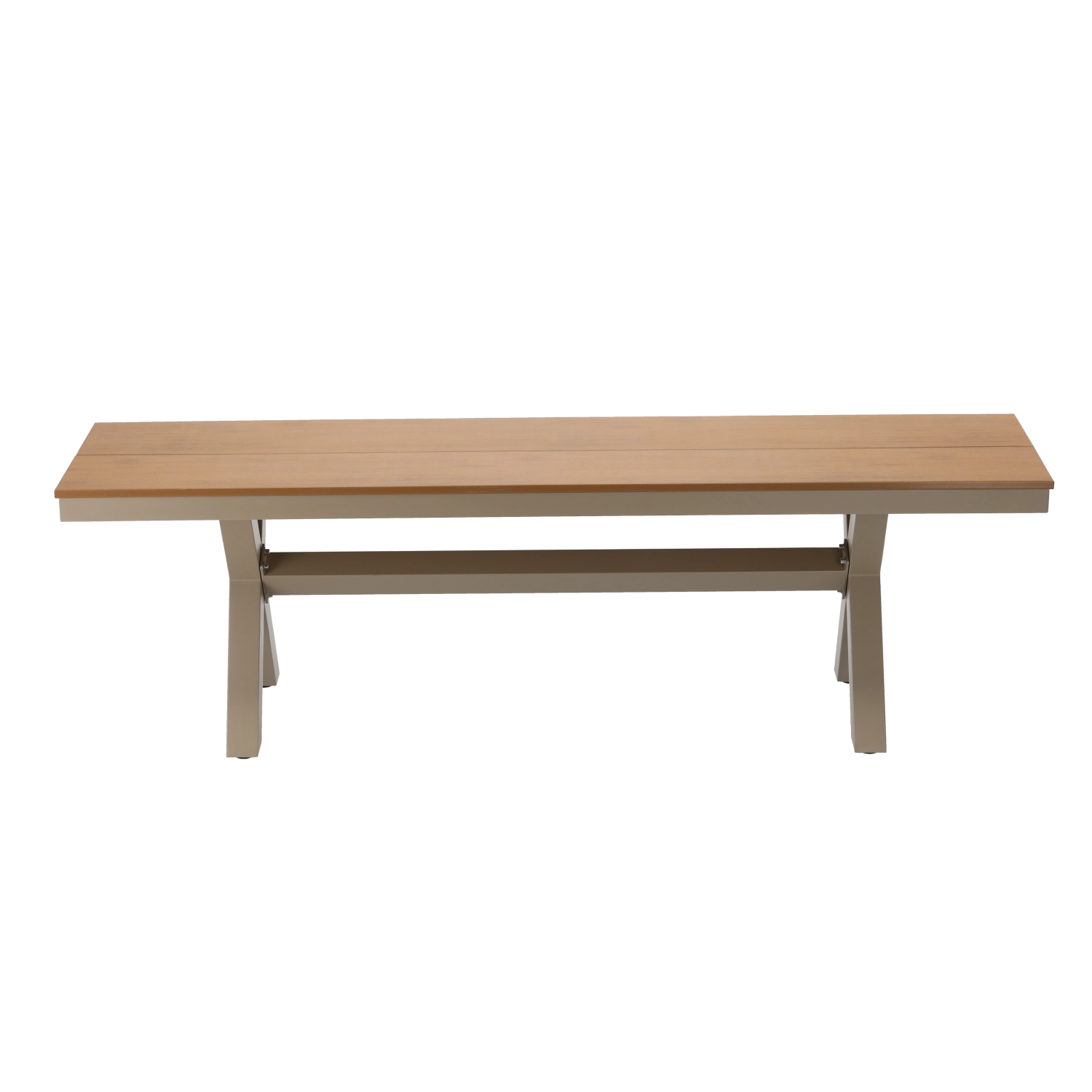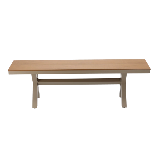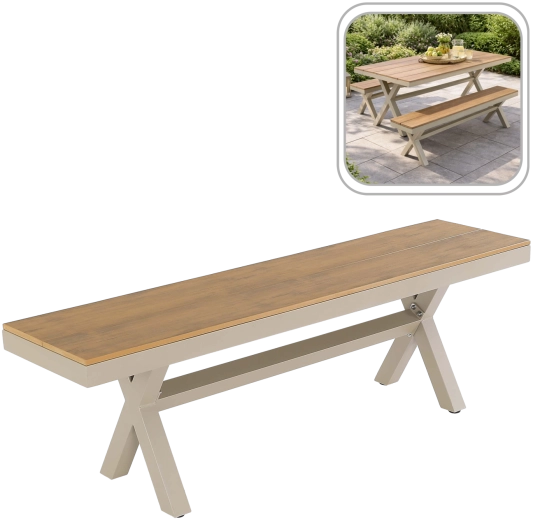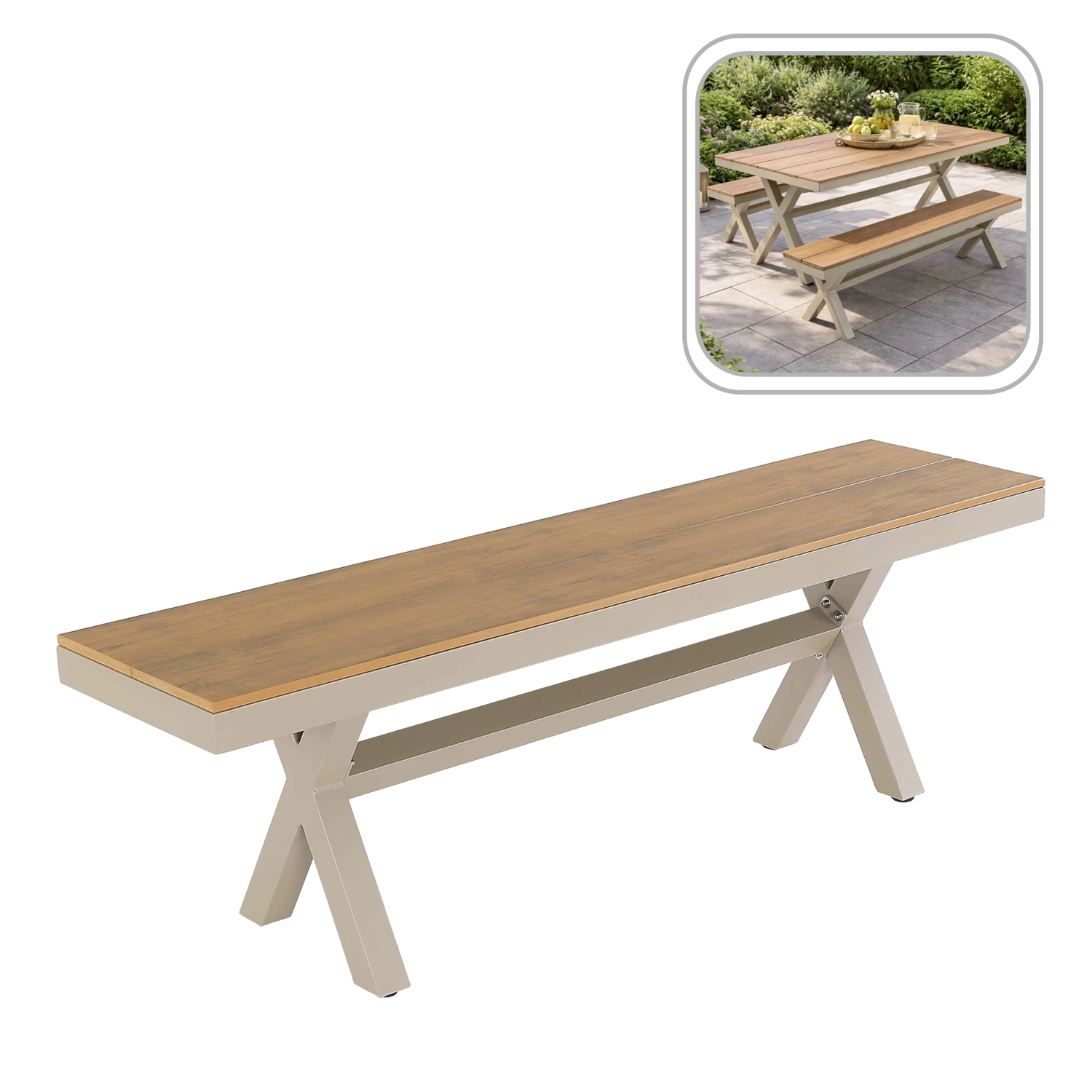 Elegant aluminiums-havebænk i beige, der kombinerer moderne minimalistisk design, lav vægt og stabilitet samt høj vejrbestandighed. Takket være sæde med træ-look kræver den minimal vedligeholdelse og passer perfekt på terrasse, i have og ved husets indgang.