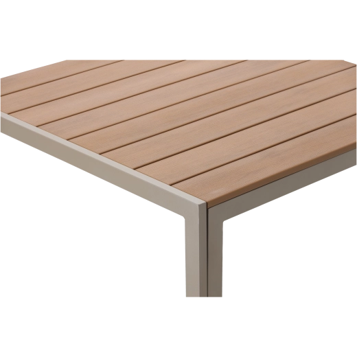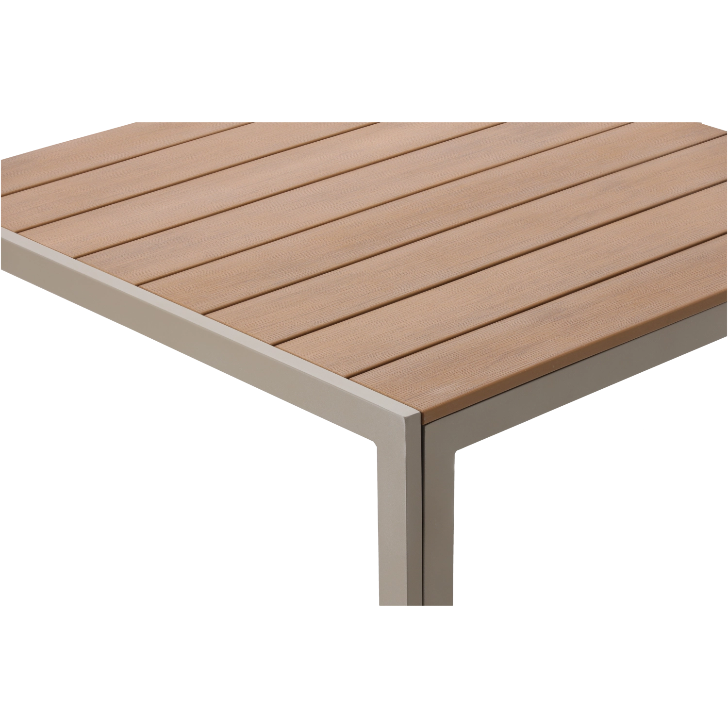 Det moderne aluminiumsbord med bordplade af WPC-lameller tilbyder et tidløst udtryk af naturligt træ uden krævende vedligeholdelse. Overfladen er pulverlakeret, så den modstår fugt, UV-stråling og korrosion. Den neutrale beige farve er let at kombinere med forskellige møbelstile og tilbehør.