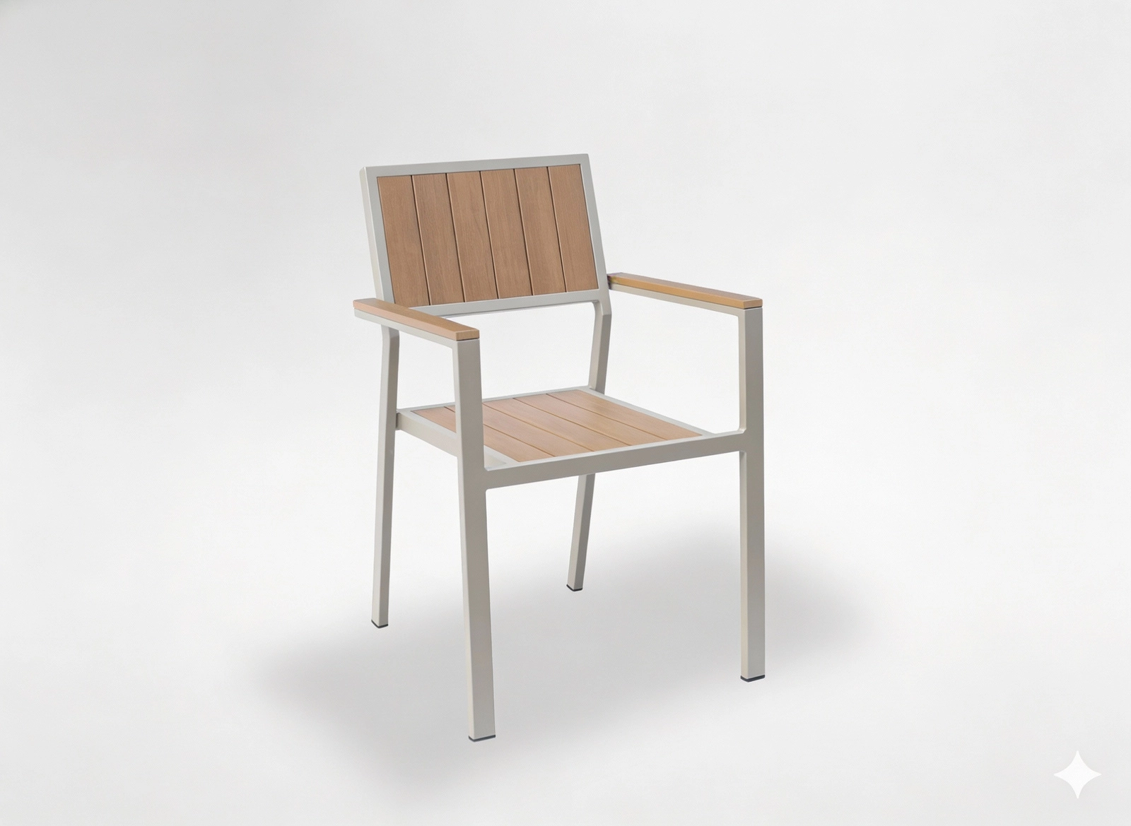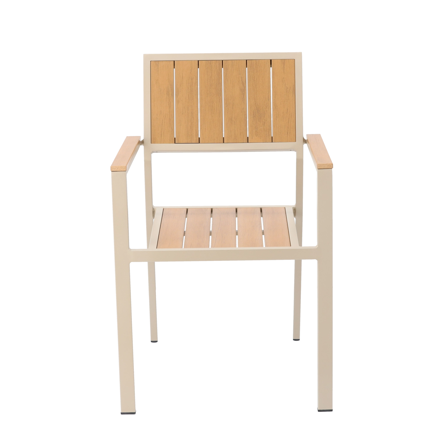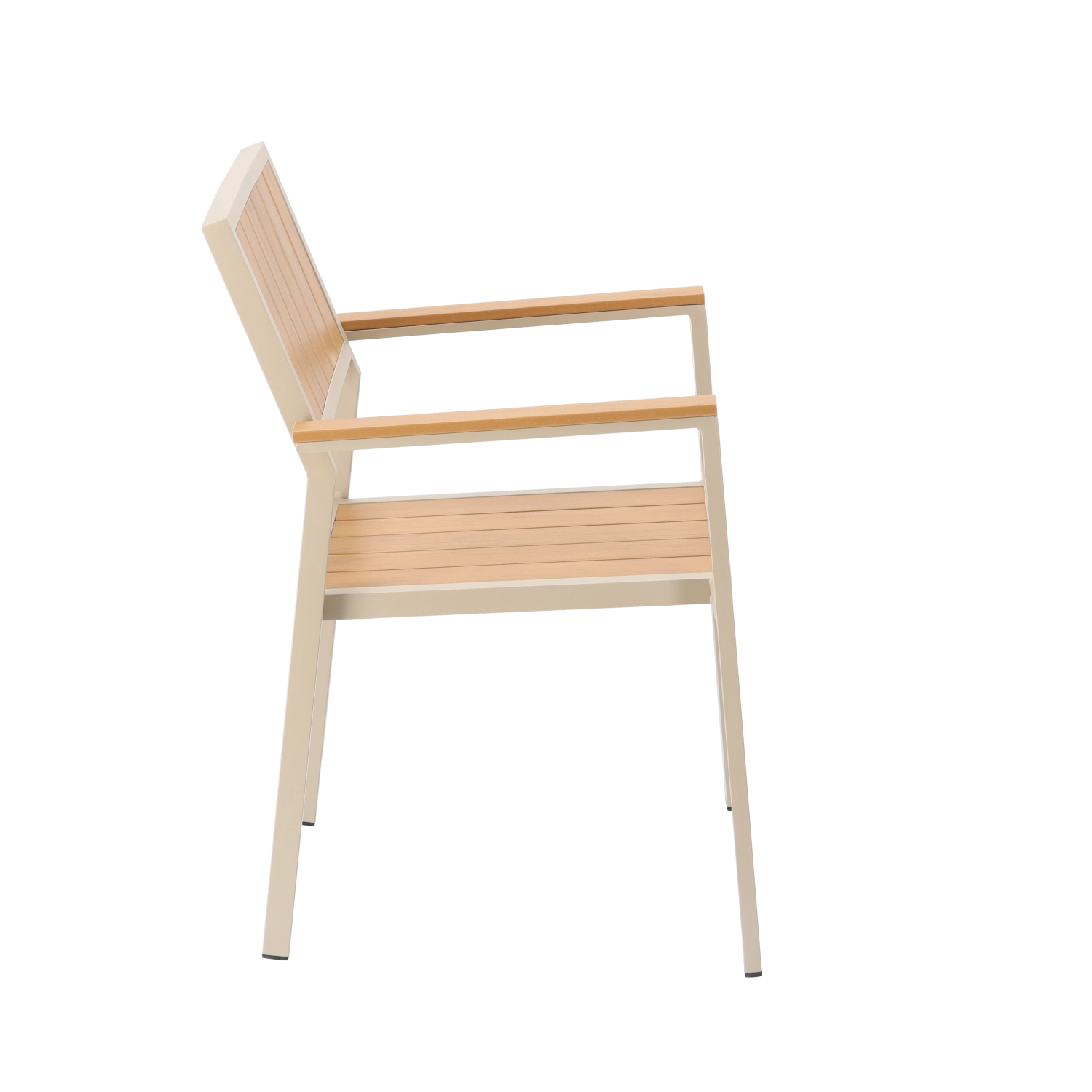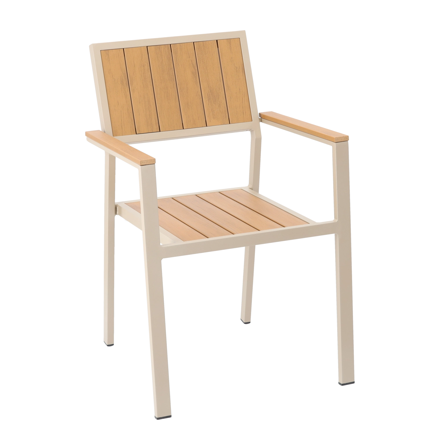 Den stilfulde aluminiums-havestol i beige er et ideelt valg til udendørs ophold. Den pulverlakerede ramme modstår både fugt og sol, mens lamellerne i trælook giver et naturligt udtryk uden behov for regelmæssig vedligeholdelse. Takket være den gennemtænkte konstruktion med armlæn tilbyder stolen høj komfort i daglig brug.