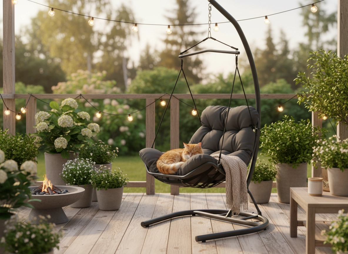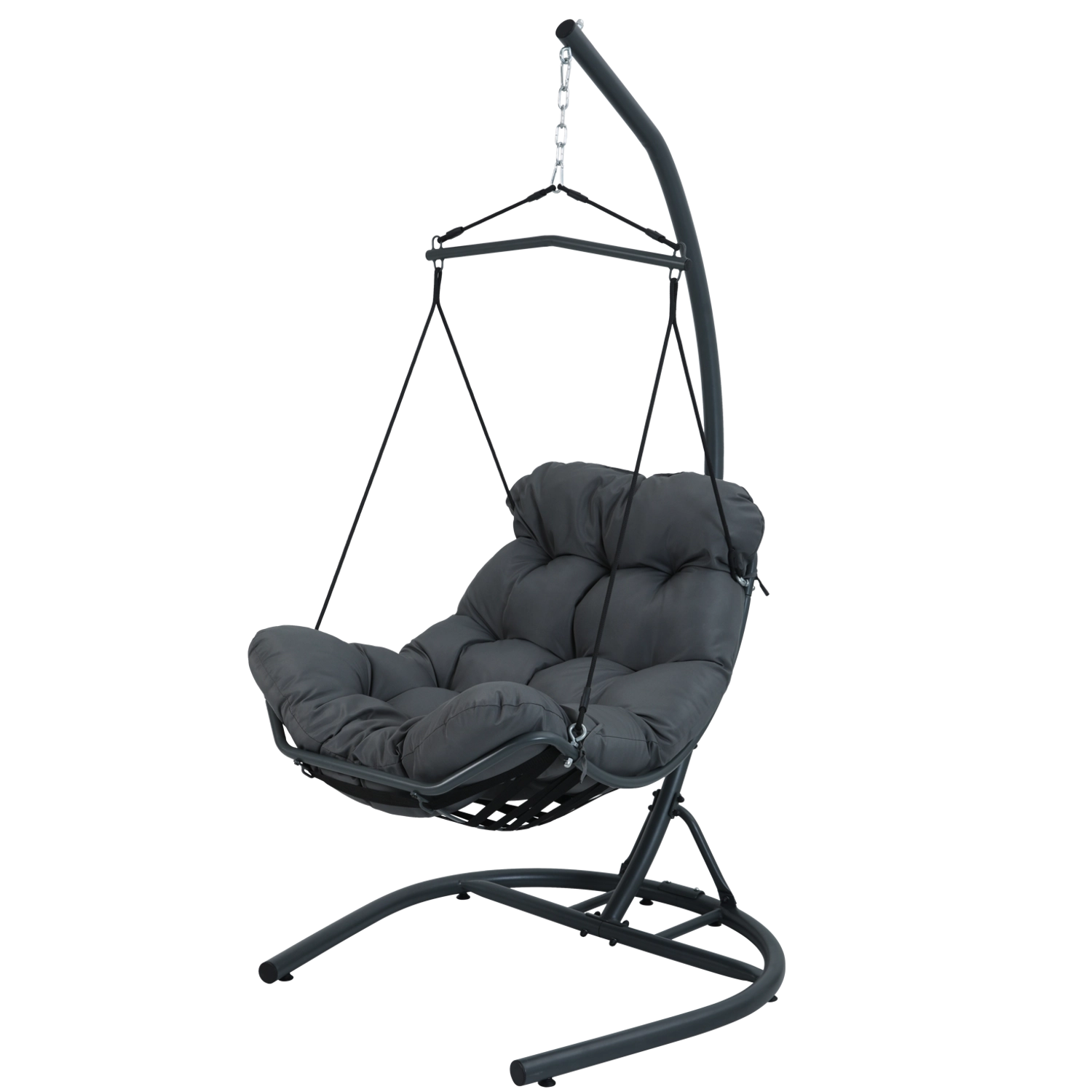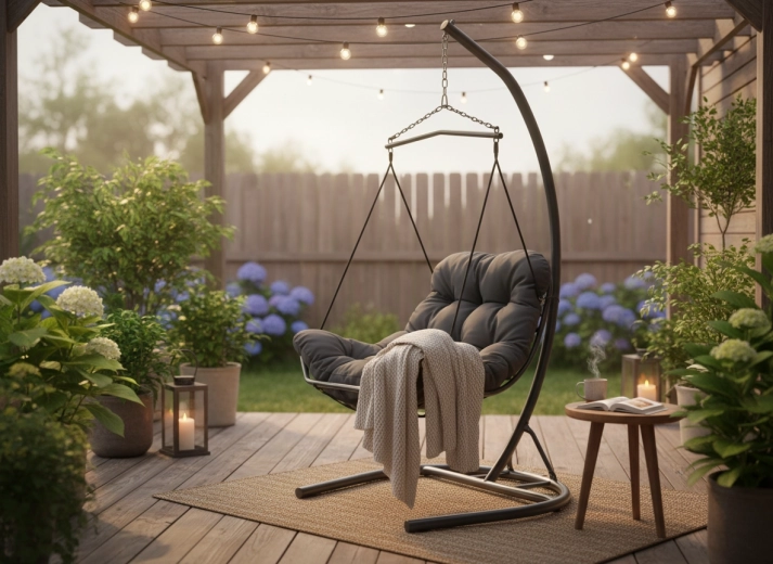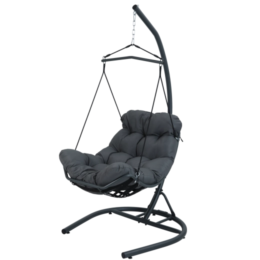 Hængestolen Tumber er et stilfuldt valg til afslapning både inde og ude. Dens robuste stålstativ med stabil base sikrer sikker gyngning og lang levetid, mens den plysede pude med skumkerne indbyder til uforstyrret hvile.