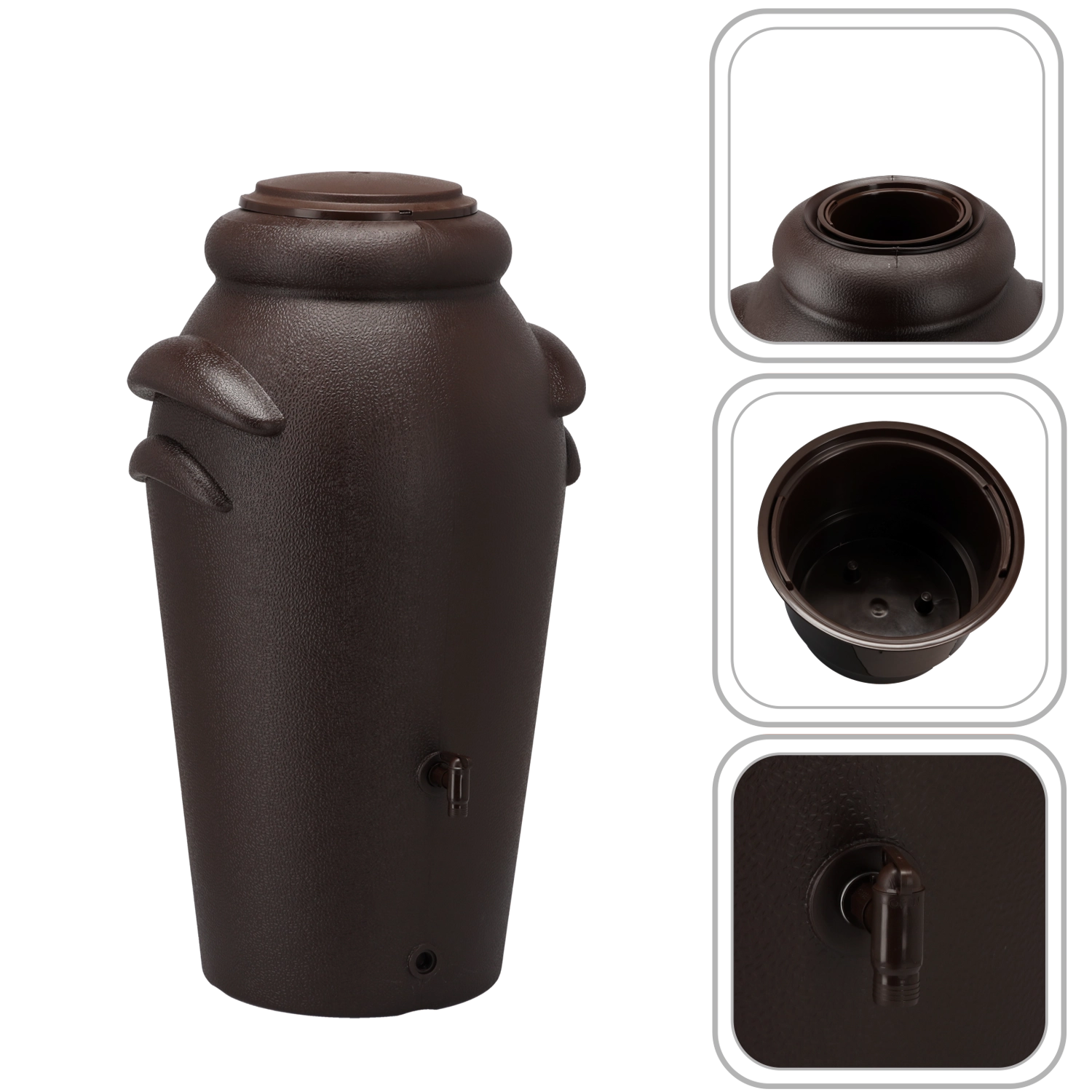 Saml og udnyt regnvand på en smart måde. VIRGA-beholderen med en kapacitet på 200 liter tilbyder den ideelle størrelse til almindelige haveopgaver, og takket være det holdbare plast og den frostbestandige konstruktion tåler den brug året rundt. Det brune, dekorative design i amfora-look passer naturligt til både hus og pergola.