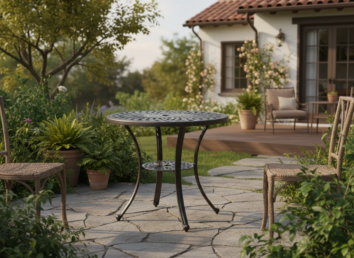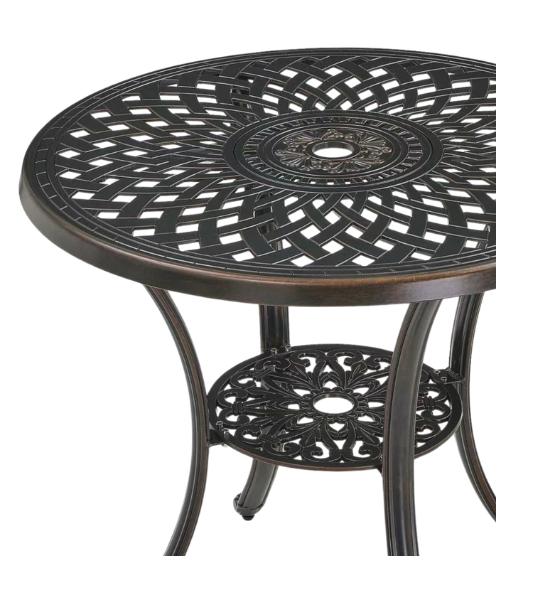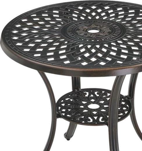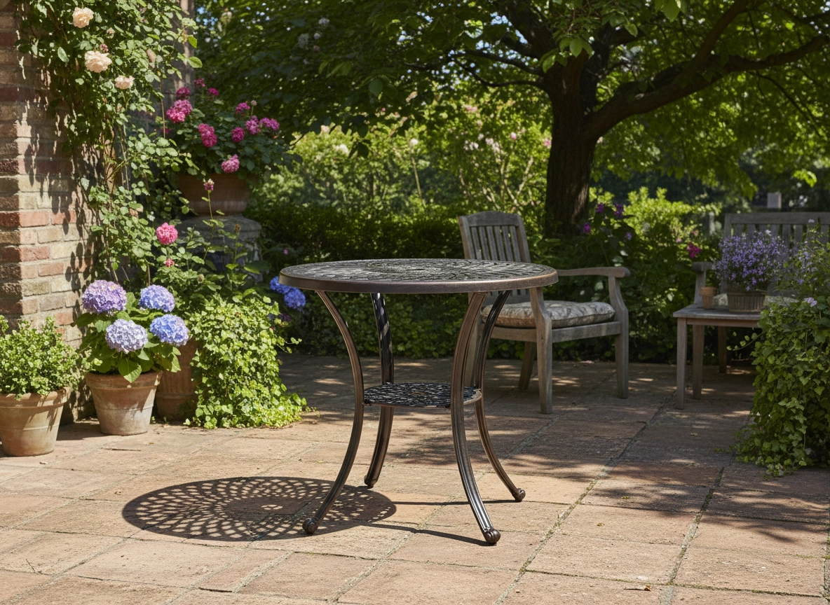 Den dekorative runde bordplade og bronzefinishen giver terrasse eller have et unikt præg og tidløs elegance.