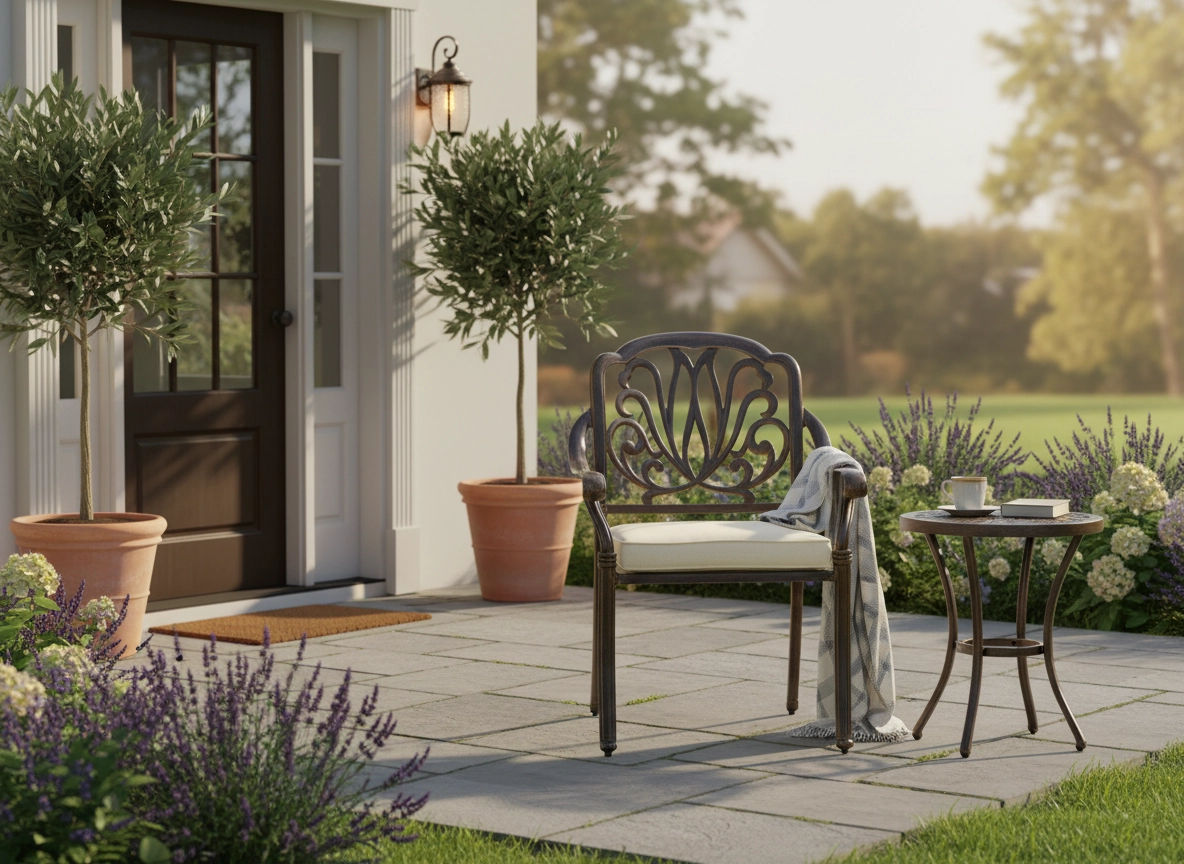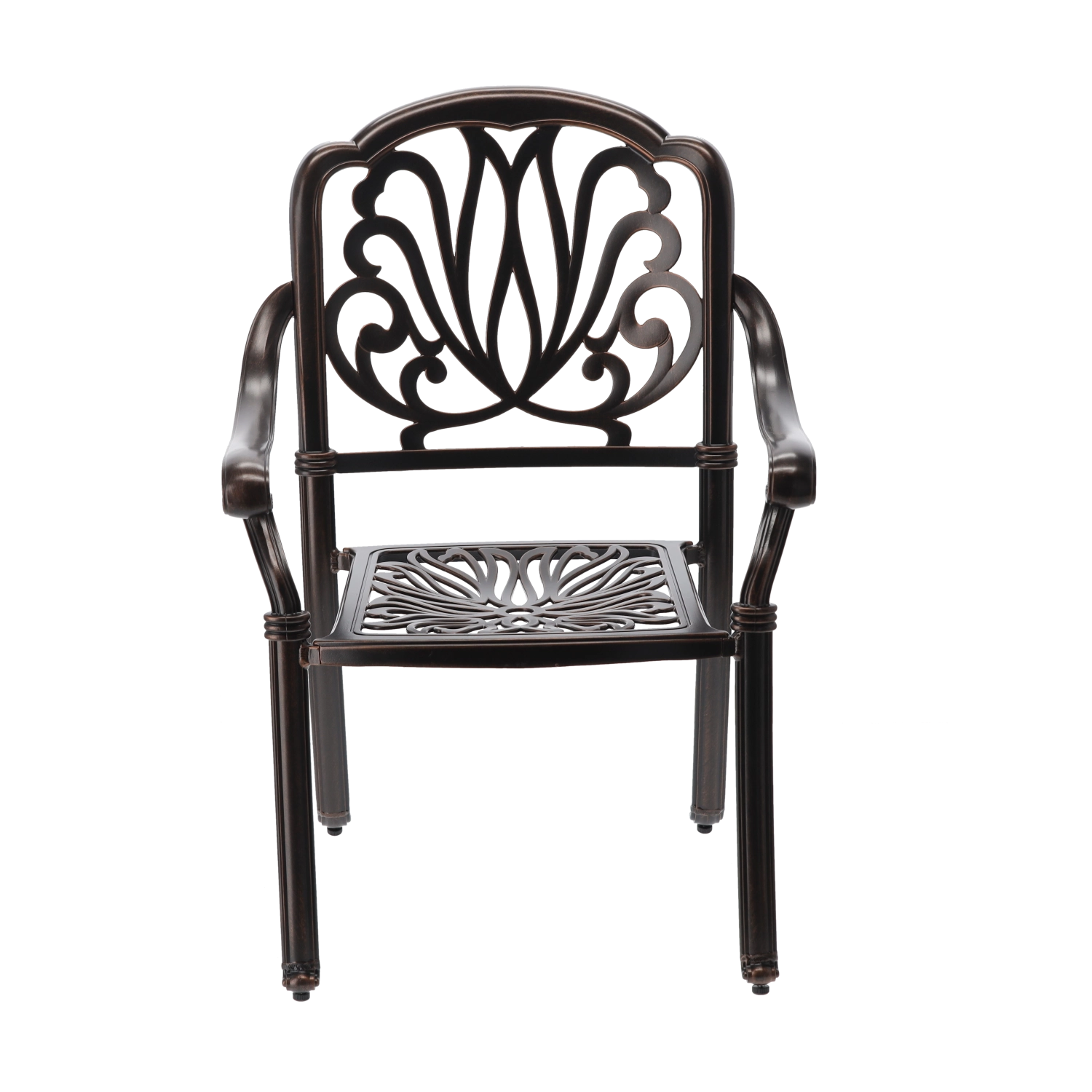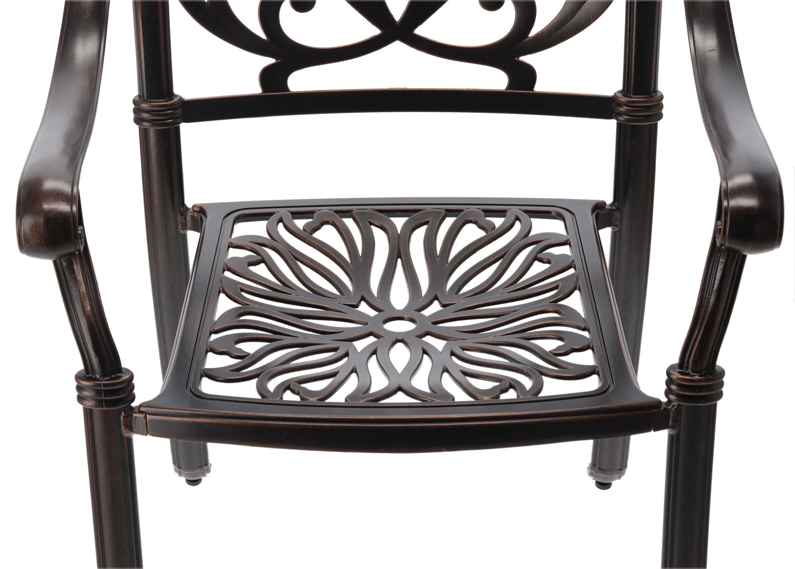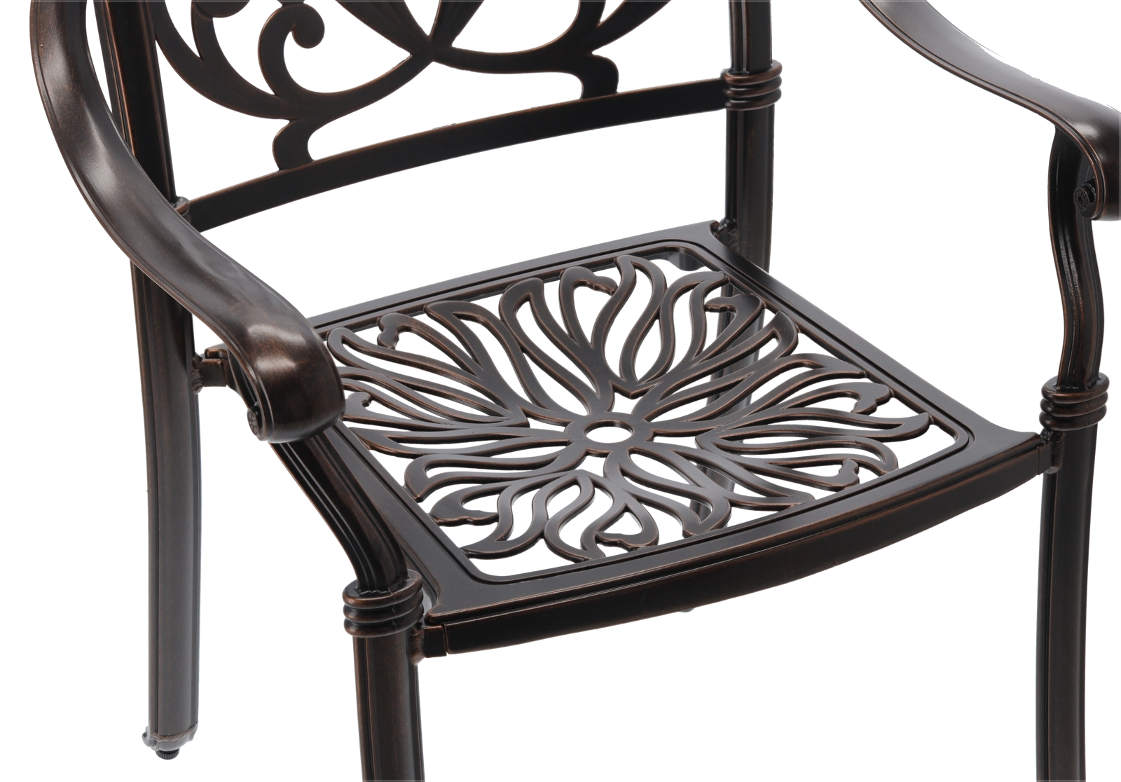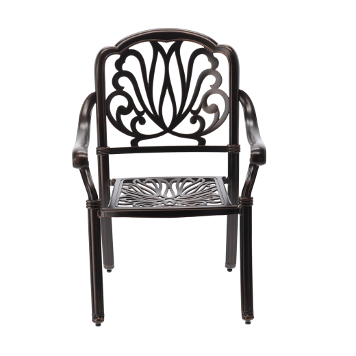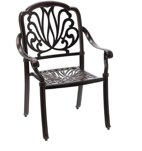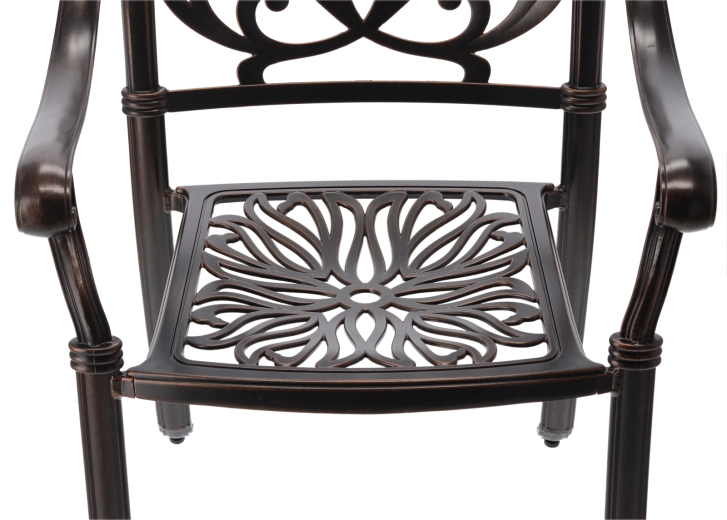 En slidstærk overflade i en elegant nuance af antik bronze beskytter mod vejrpåvirkninger og ridser og understreger samtidig stolens klassiske udtryk.