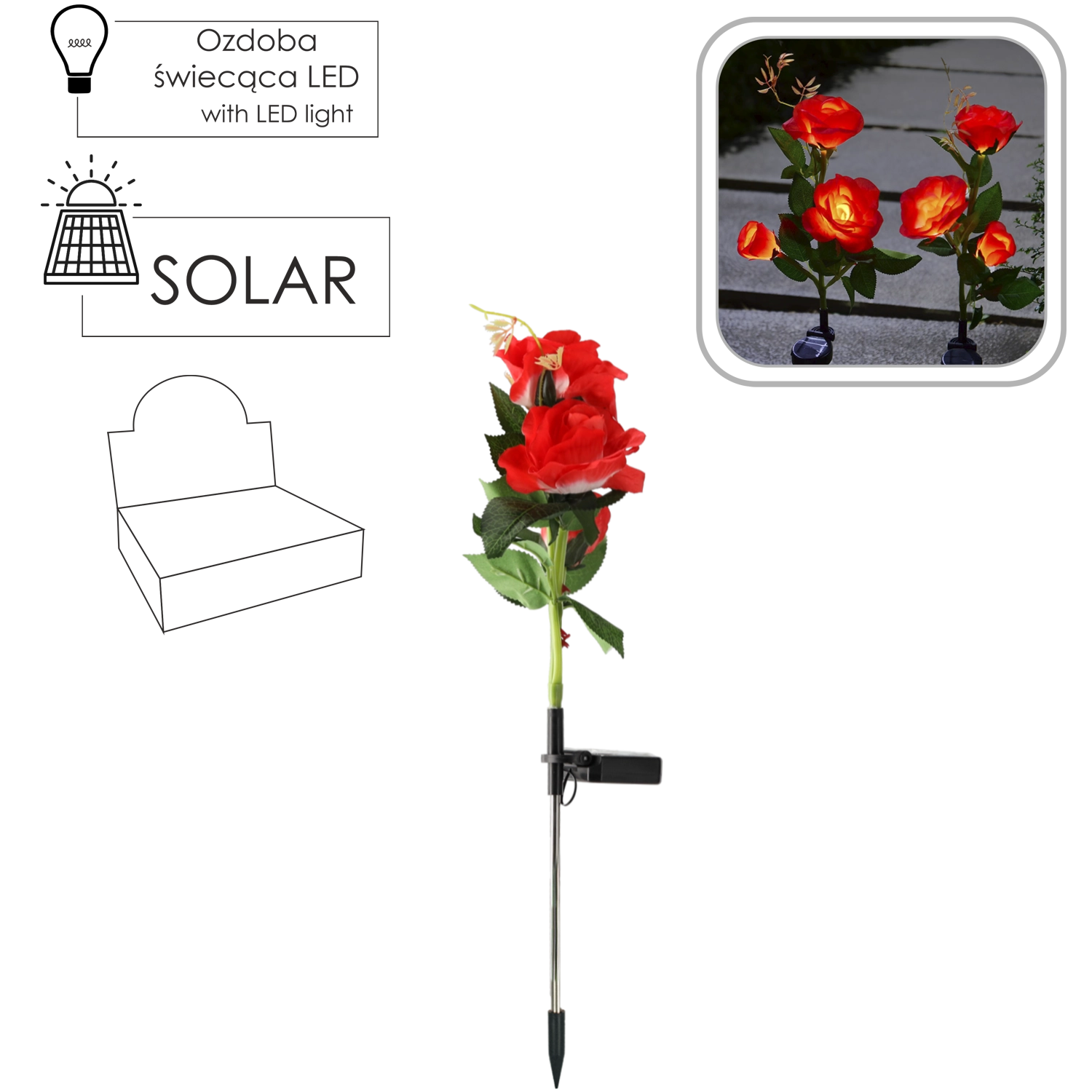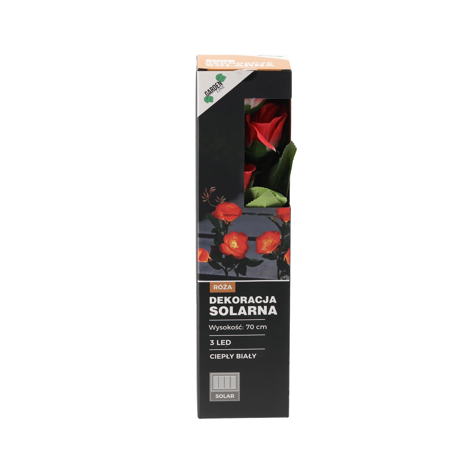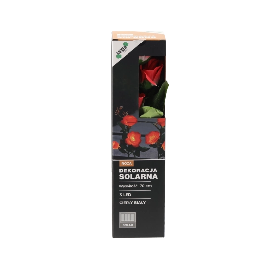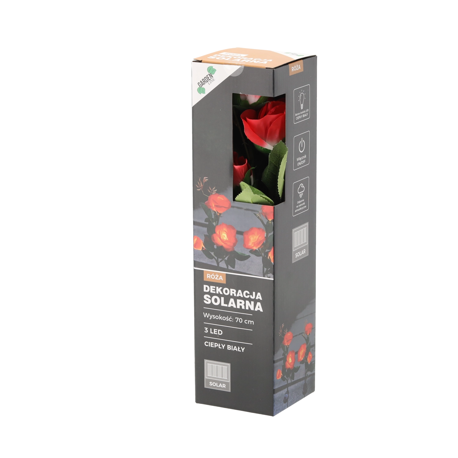 Dekorativ solcellelampe formet som en rose med en højde på 70 cm, der oplyser din have med et blidt skær. Den tilbyder 3 blomster med varmt hvidt lys, automatisk opladning fra solen og energibesparende drift takket være LED-teknologi. Med kapslingsklasse IP44 er den velegnet til udendørs brug hele sæsonen.
