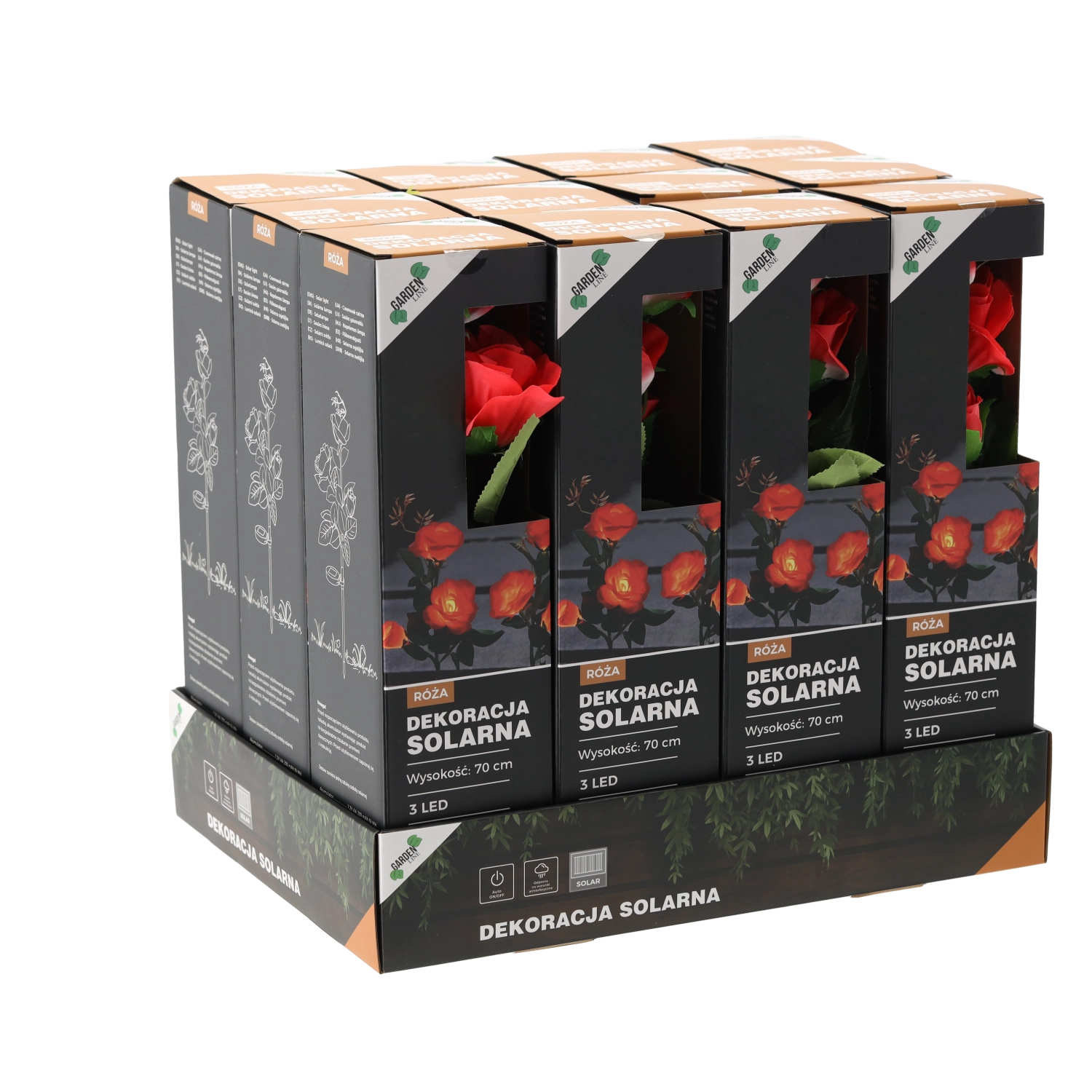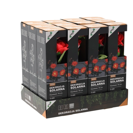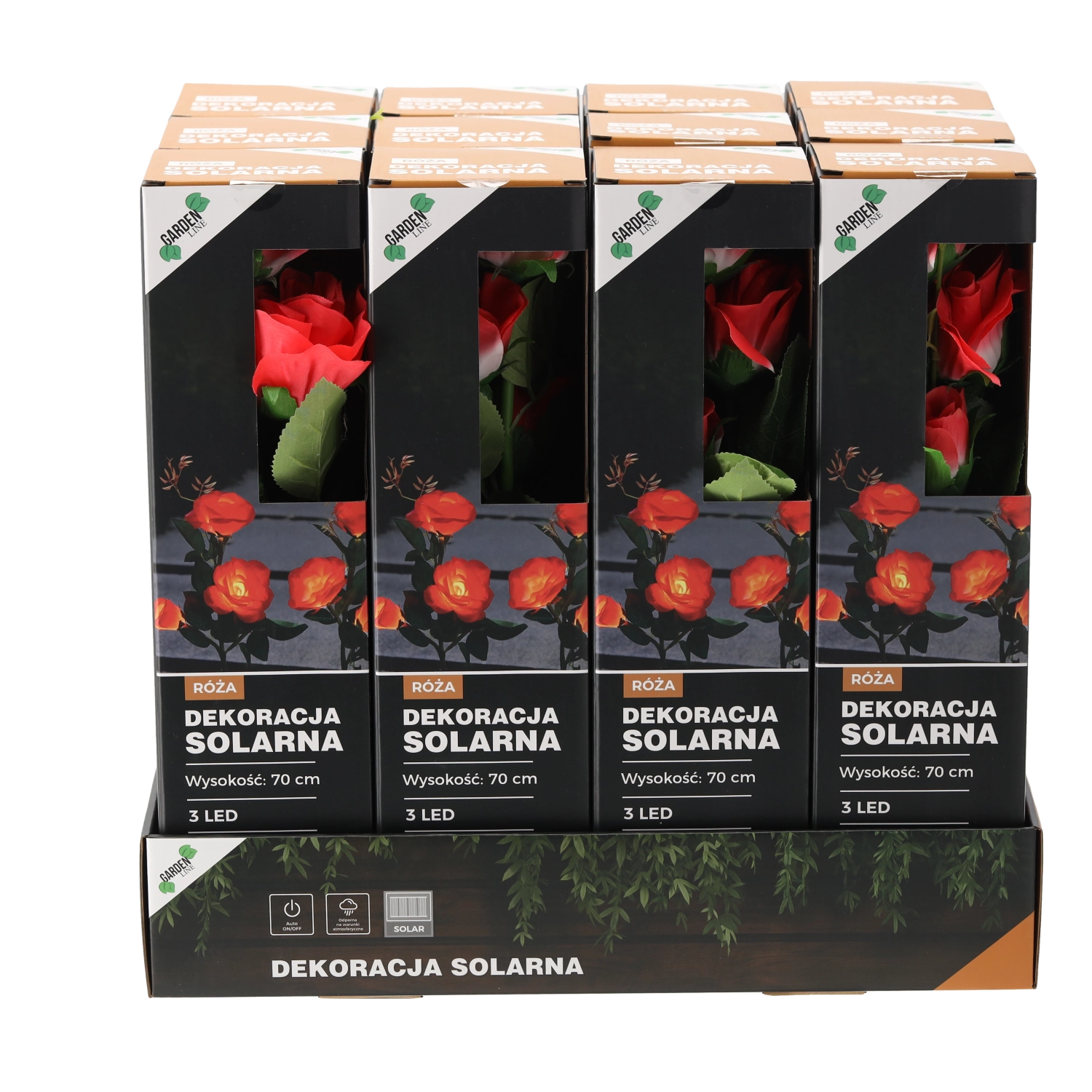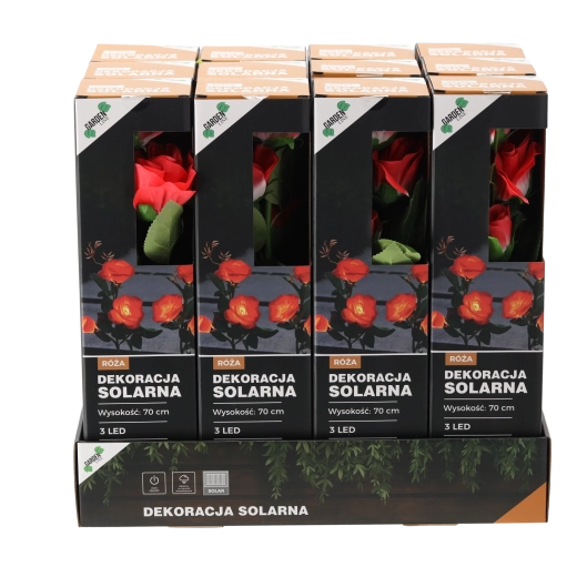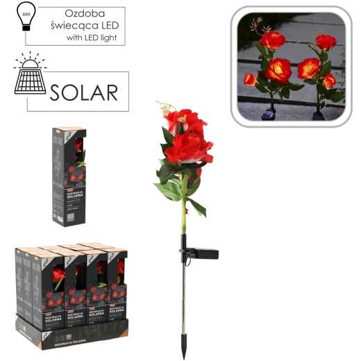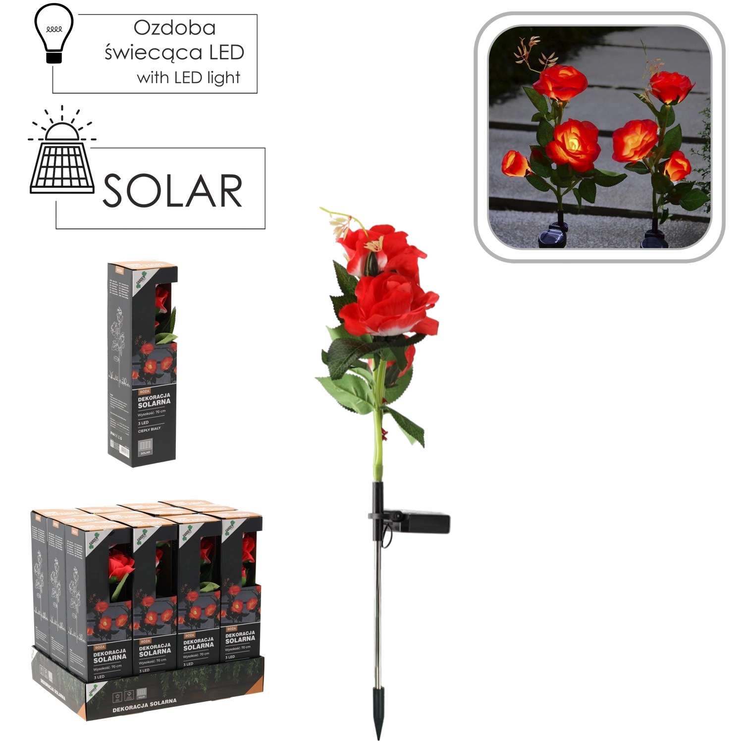 Dekorativ solcellelampe formet som en rose med en højde på 70 cm, der oplyser din have med et blidt skær. Den tilbyder 3 blomster med varmt hvidt lys, automatisk opladning fra solen og energibesparende drift takket være LED-teknologi. Med kapslingsklasse IP44 er den velegnet til udendørs brug hele sæsonen.