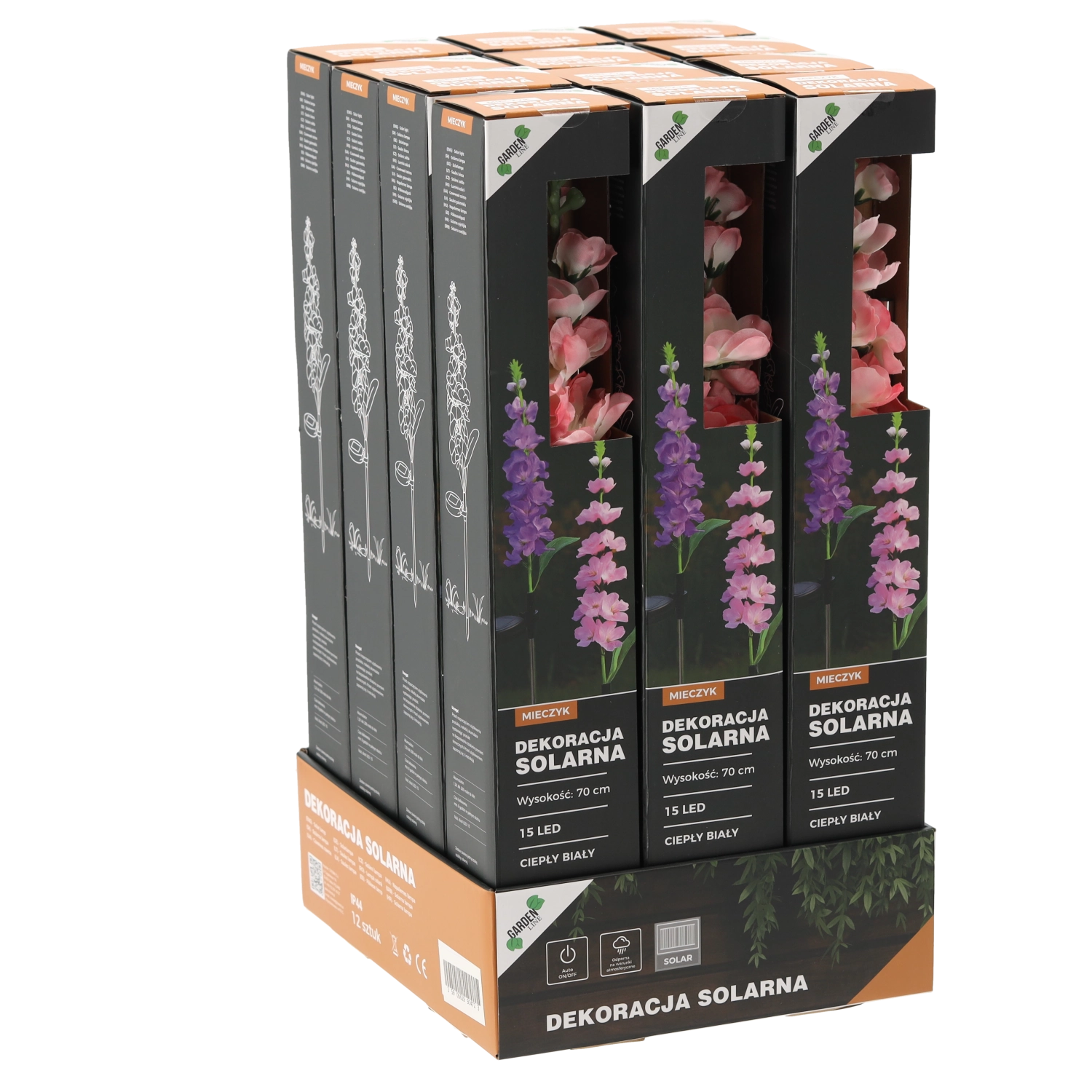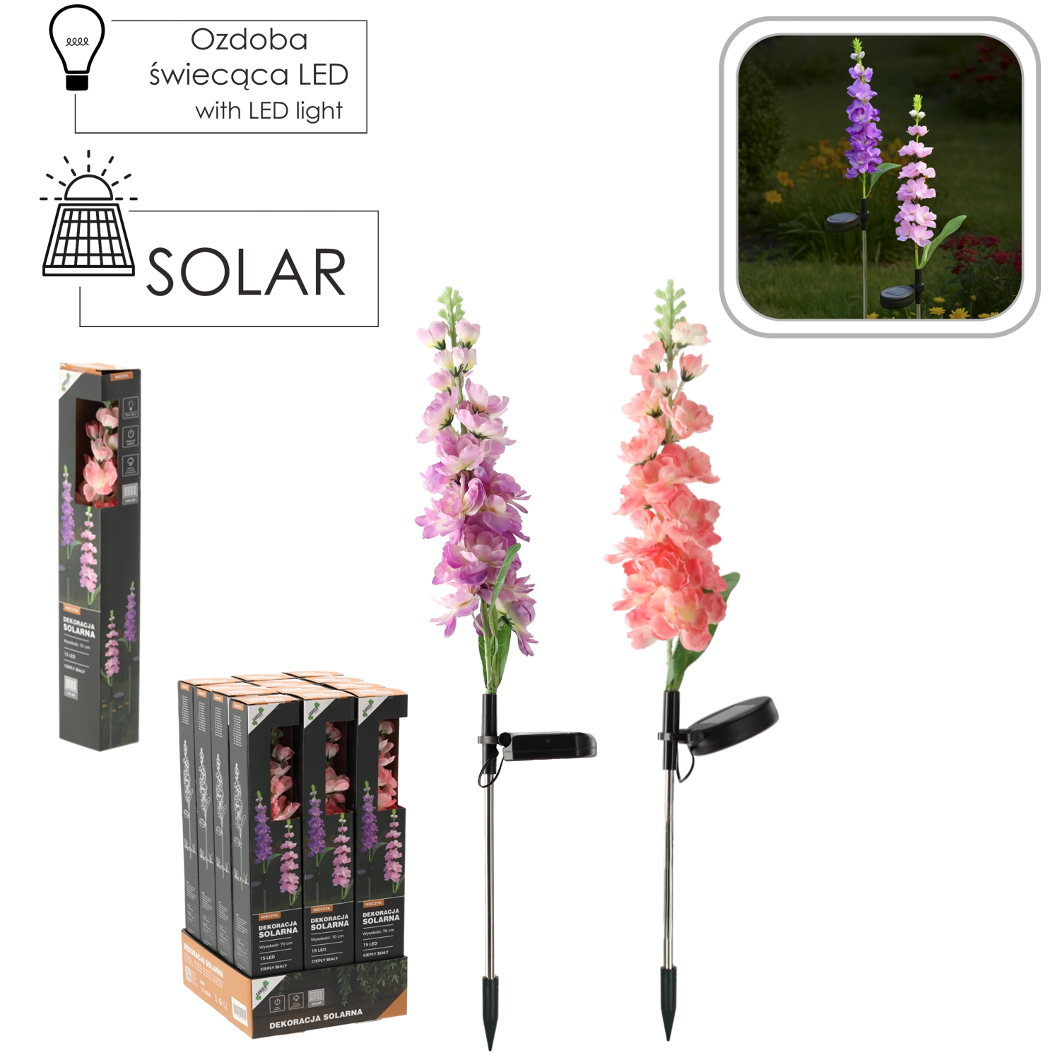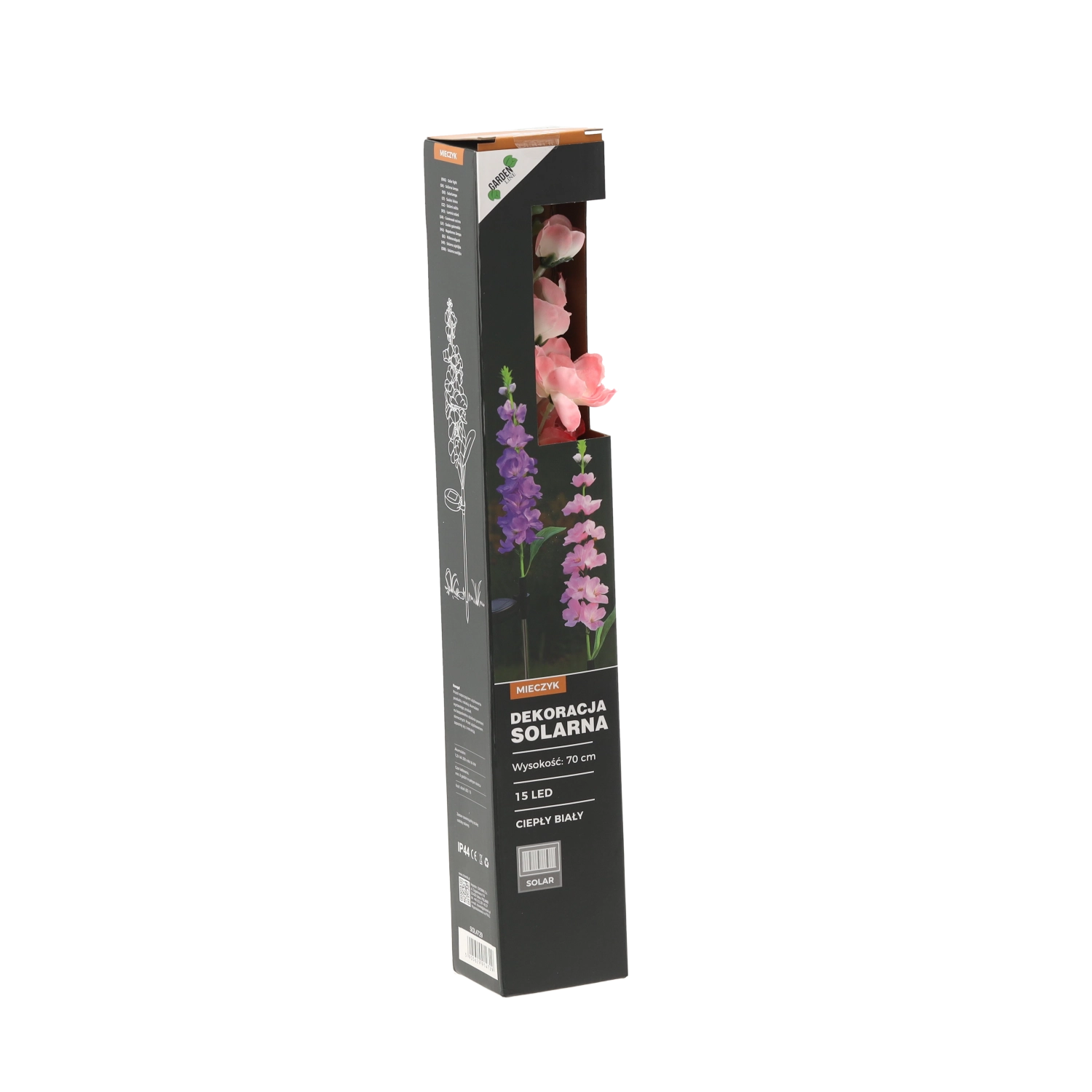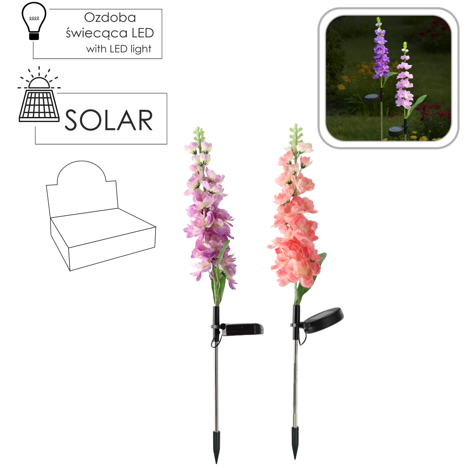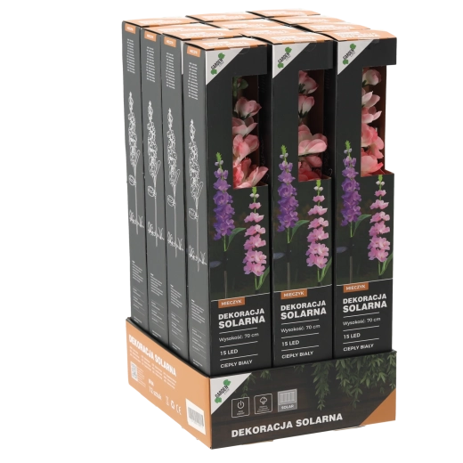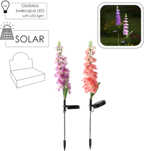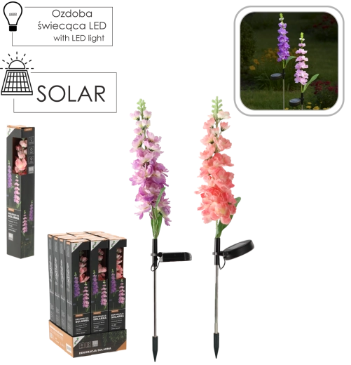 Takket være IP44 tåler den almindelige vejrforhold. Installationen er enkel – stik bare pinden i jorden eller altankassen, tænd, og lad solen klare resten. Fås i mix af blomsterfarver: lyserød eller lilla, som frisker enhver blomsterbed og udendørs dekoration op.