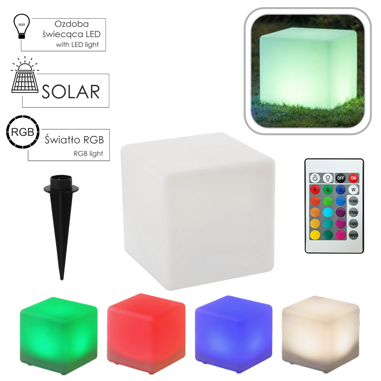 Takket være det robuste materiale af polyethylen og IP65-klassificering er terningen klar til udendørs forhold. I pakken finder du også en fjernbetjening til nem ændring af farver og tilstande samt en monteringsspids til let forankring i jorden.