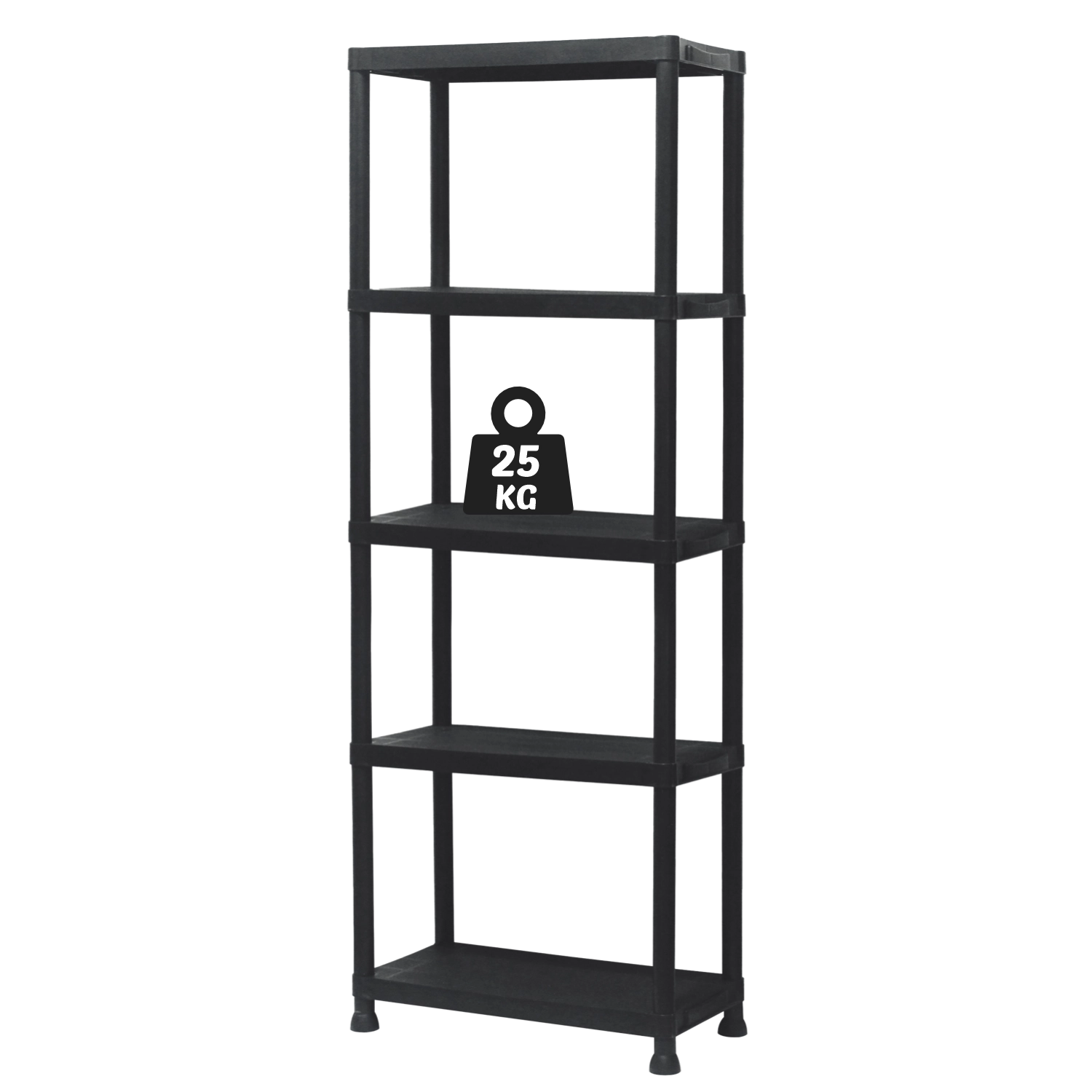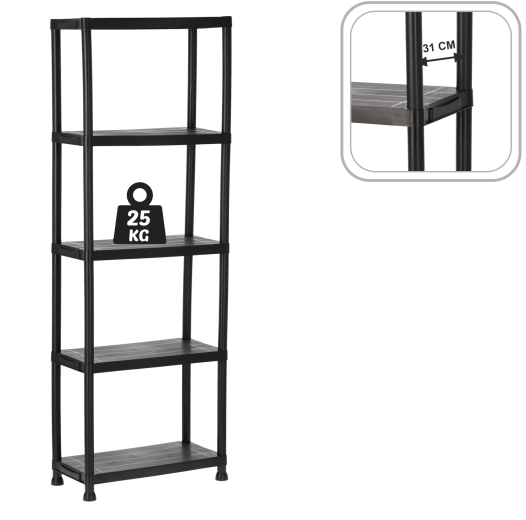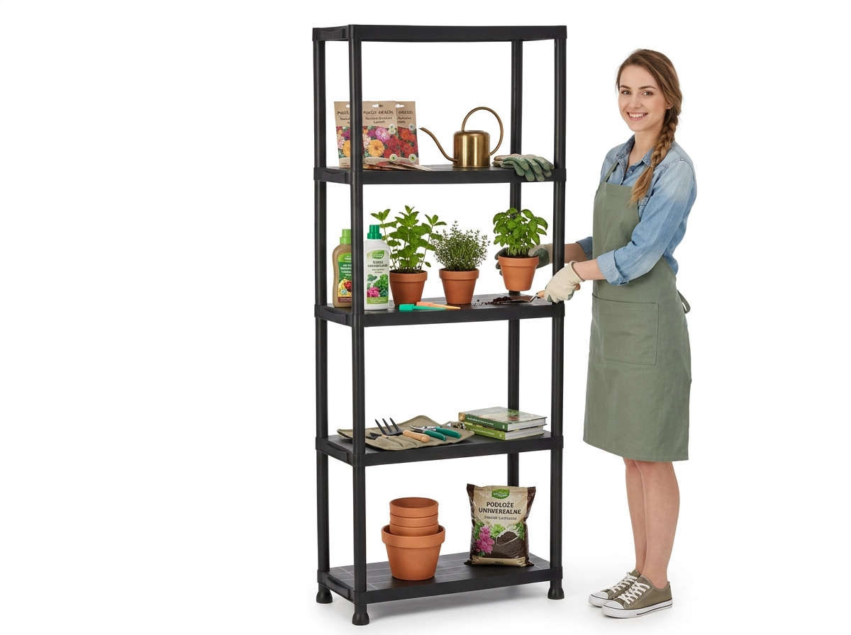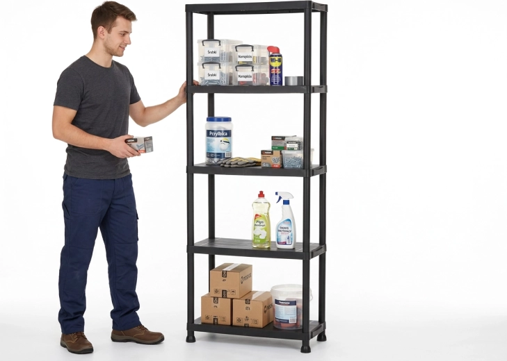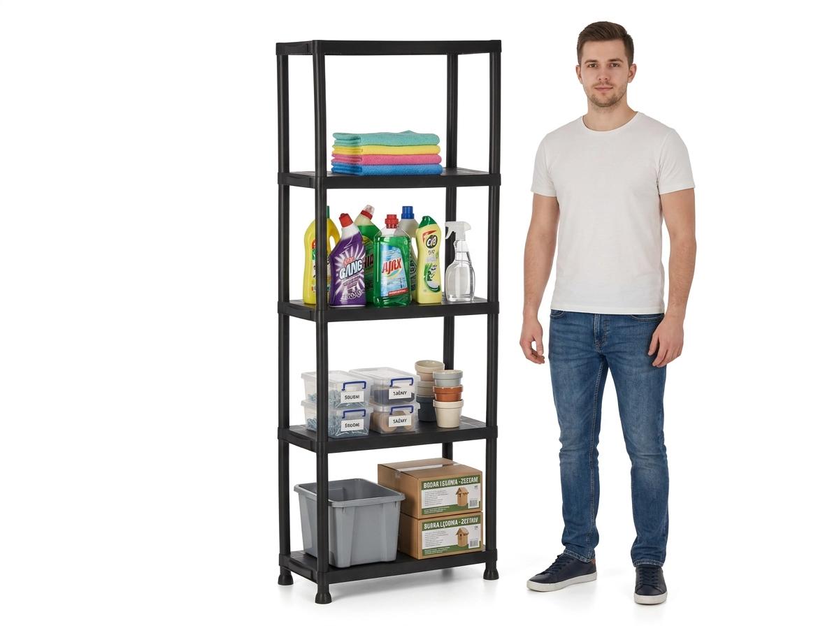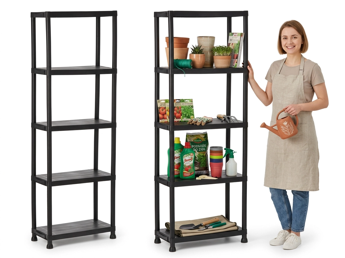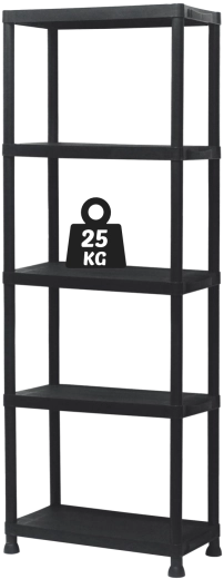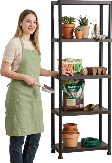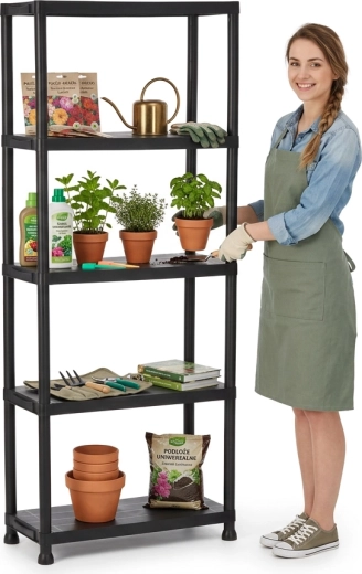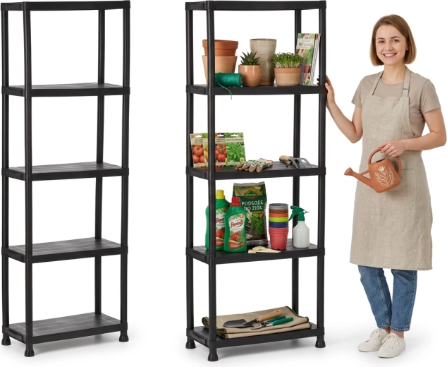 Praktisk og holdbar plastreol med 5 hylder, der giver pladsbesparende vertikal opbevaring til værksted, garage, kælder og viktualierum. Hver hylde bærer op til 25 kg, den åbne konstruktion sikrer nem adgang og god ventilation. Takket være den lette, men stabile konstruktion monteres reolen hurtigt, er nem at vedligeholde og hjælper med at holde orden i ethvert rum.