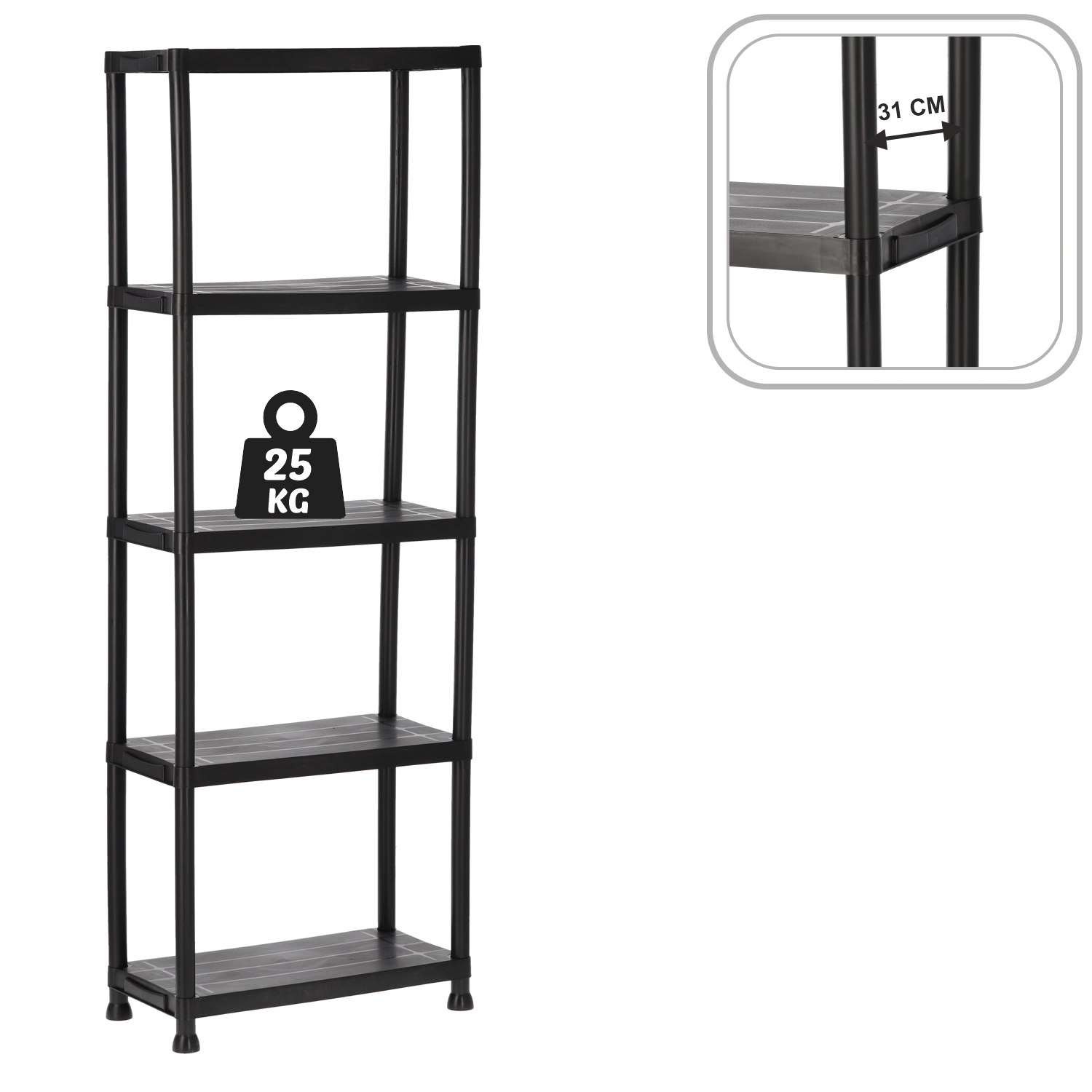 Maksimér pladsen med en 5‑etagers plastreol i målene 61 × 31 × 171 cm. Det smalle fodaftryk sparer plads, mens de robuste hylder med en bæreevne på 25 kg sikkert bærer værktøj, rengøringsmidler, kasser, potter og husholdningsartikler. Det åbne stel gør håndteringen nem og forbedrer luftcirkulationen, så indholdet forbliver overskueligt og lige ved hånden.