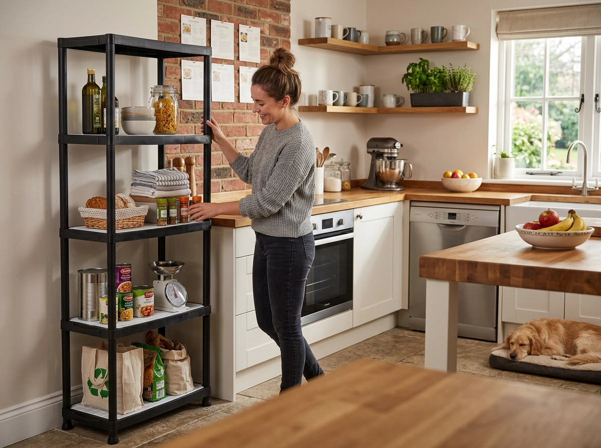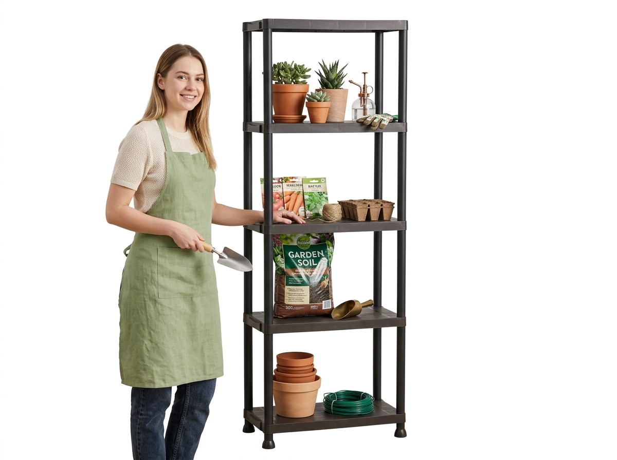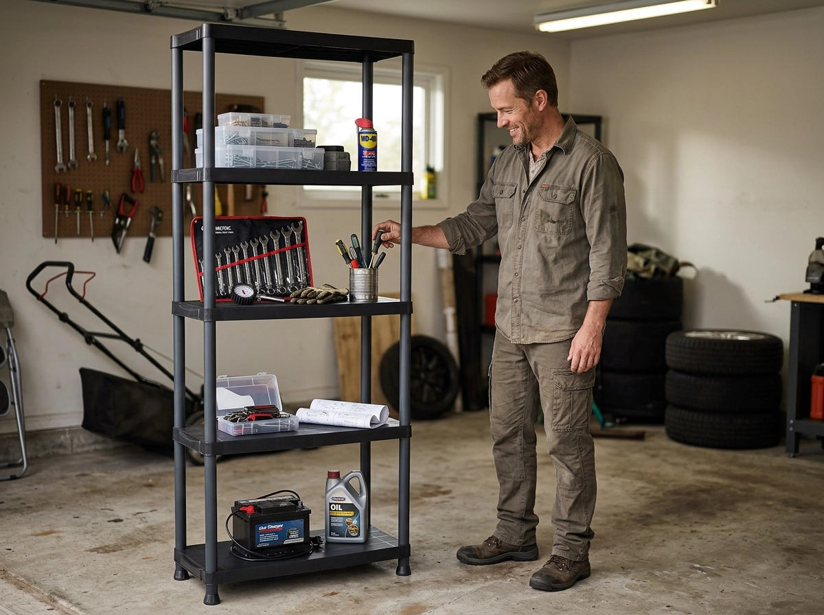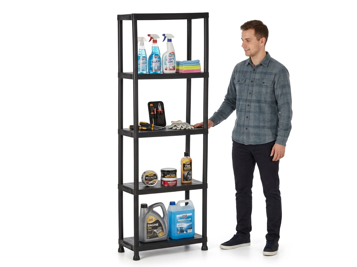 Plastkonstruktionen er stabil, fugtbestandig og let at rengøre – ideel til garage, kælder og husholdning.