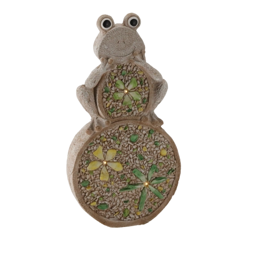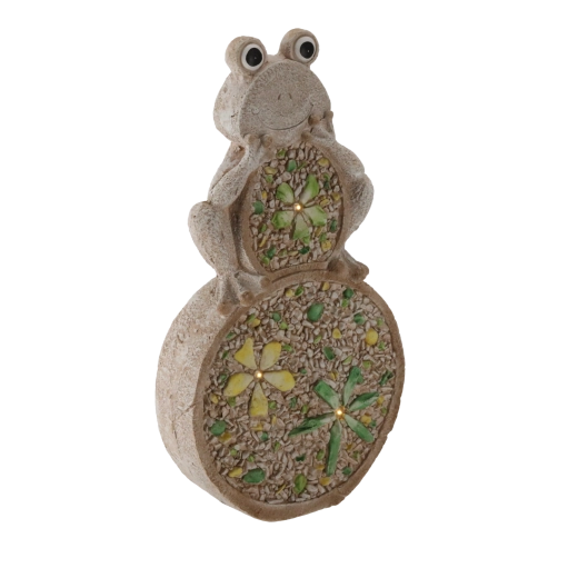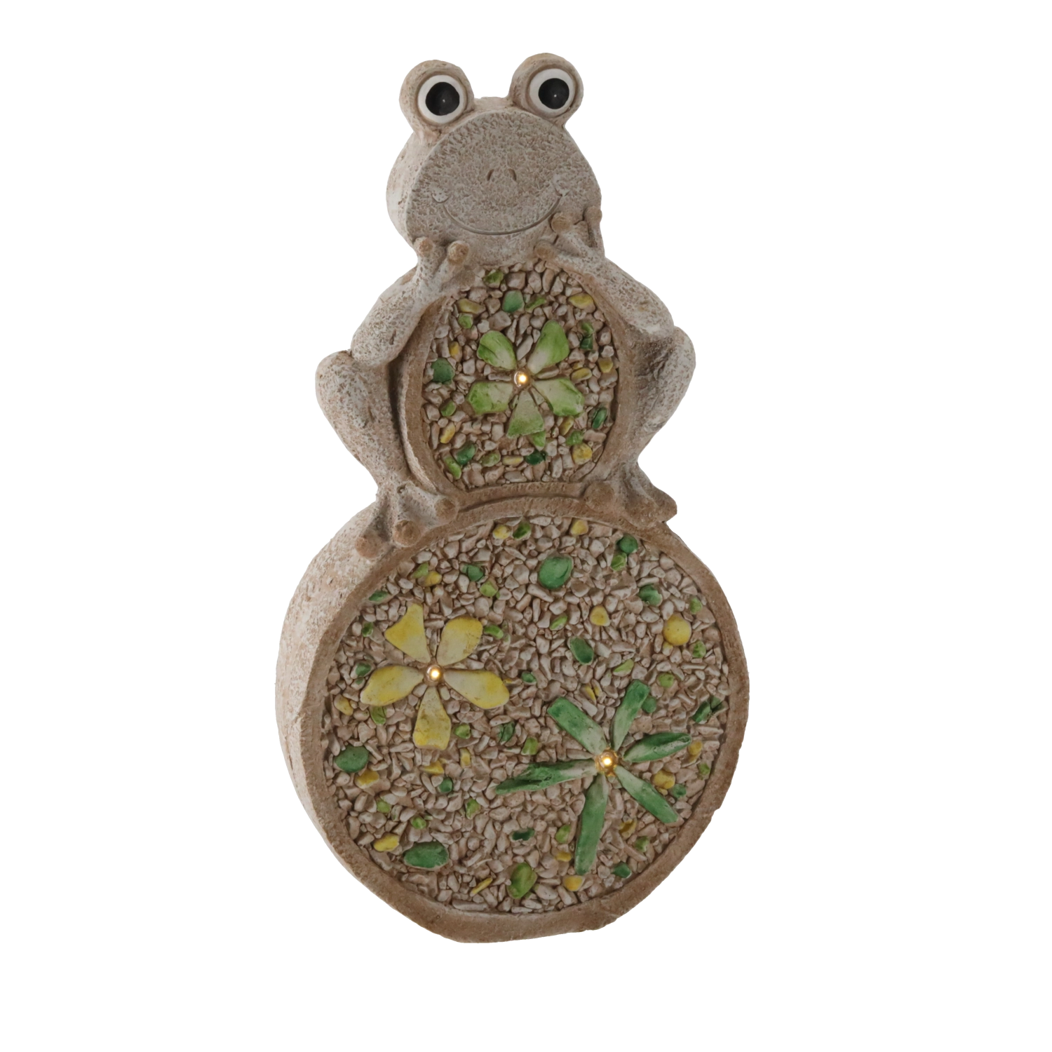 Overfladen med stenstruktur og farvede mosaikindlæg giver frøfiguren et autentisk udtryk, der fanger blikket med det samme.
