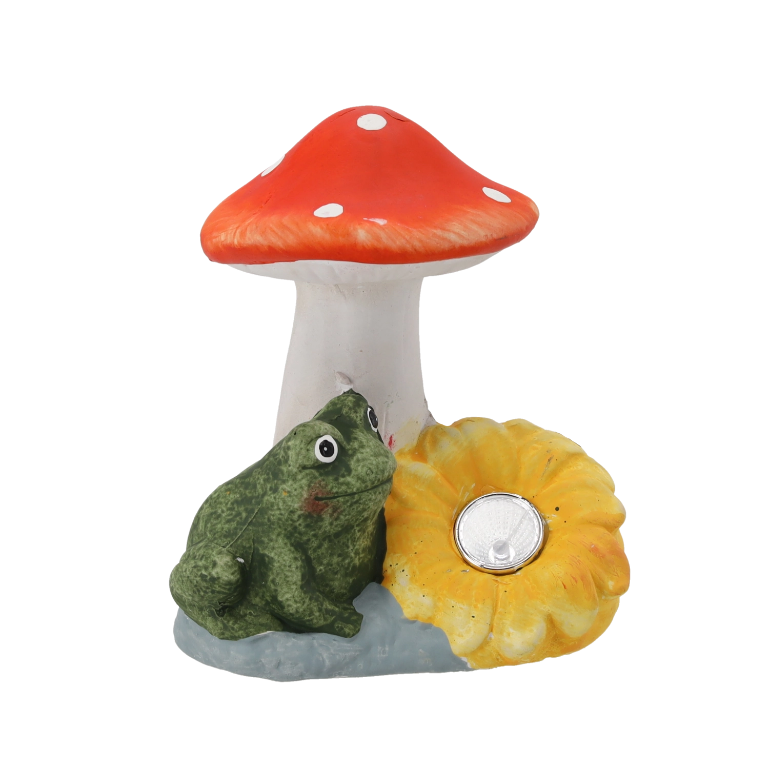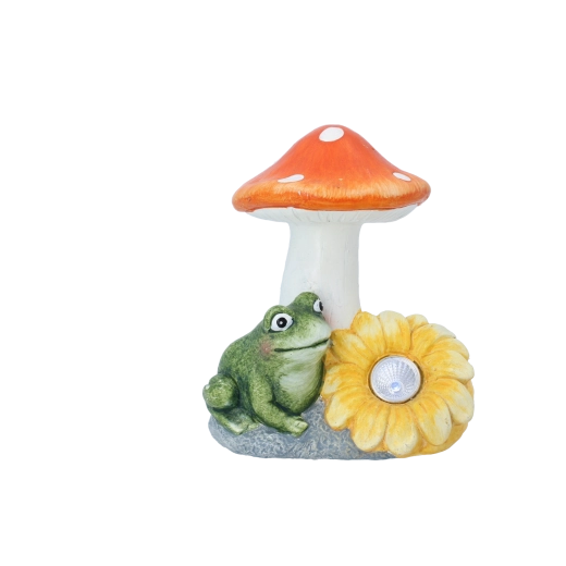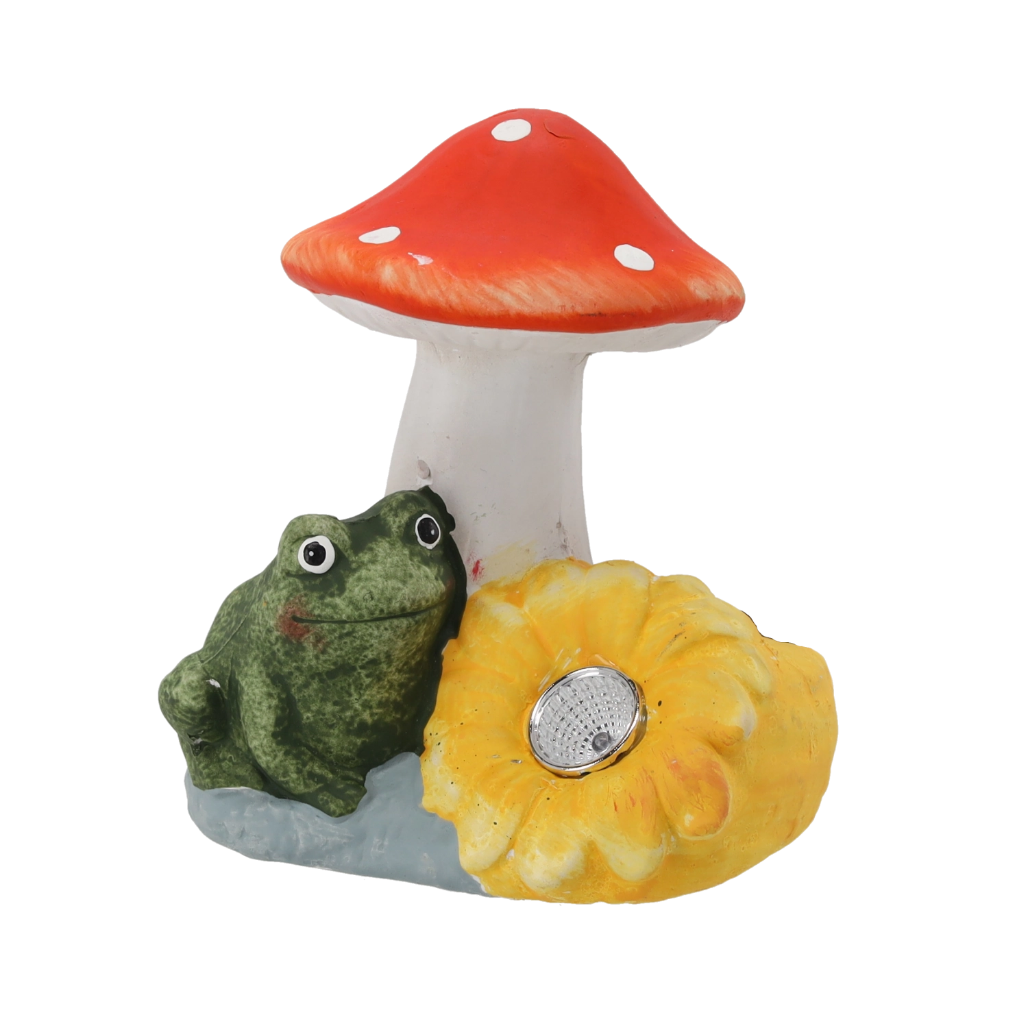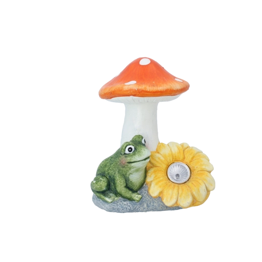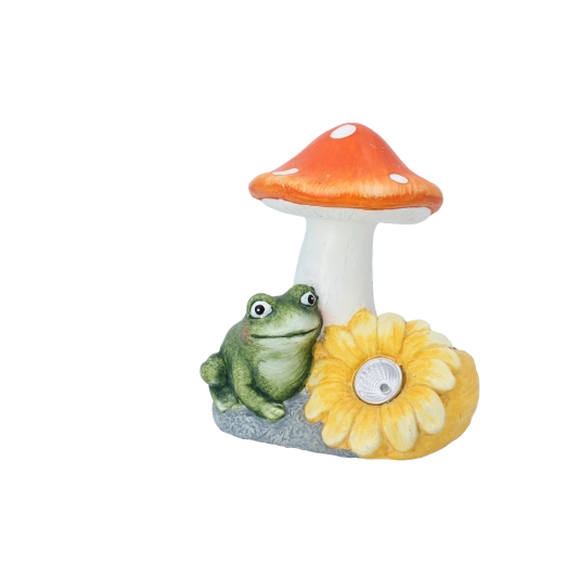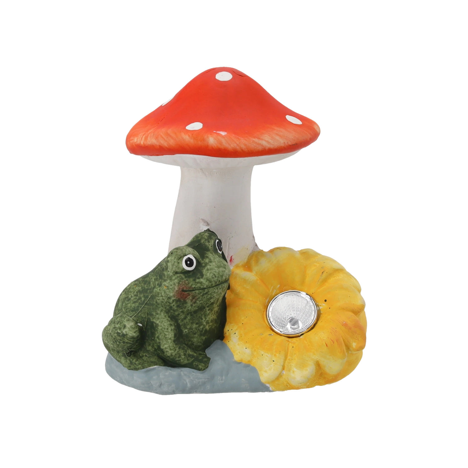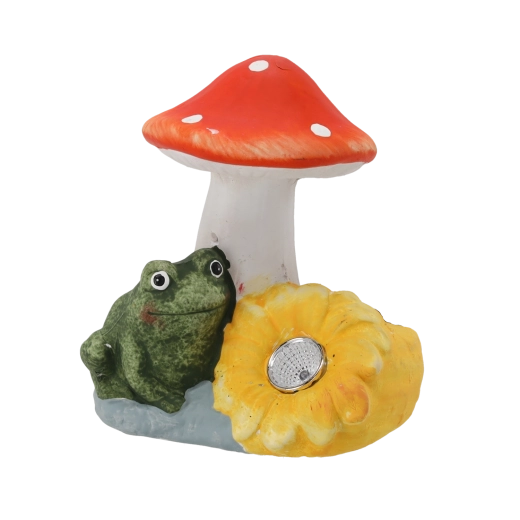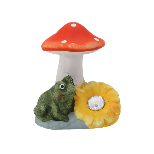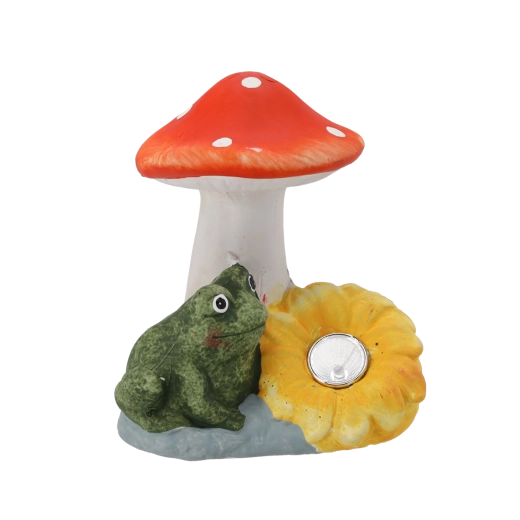 Denne charmerende havefigur kombinerer et dekorativt element med praktisk accentbelysning. Realistiske detaljer af frøen, fluesvampen og blomsten giver et legende udtryk og liver ethvert hjørne af haven, blomsterbedet, indgangen eller udendørs siddeområde op. Det indbyggede LED-lys er energieffektivt og ideelt til blid belysning af dekorationen.