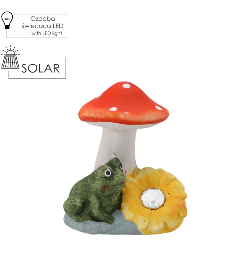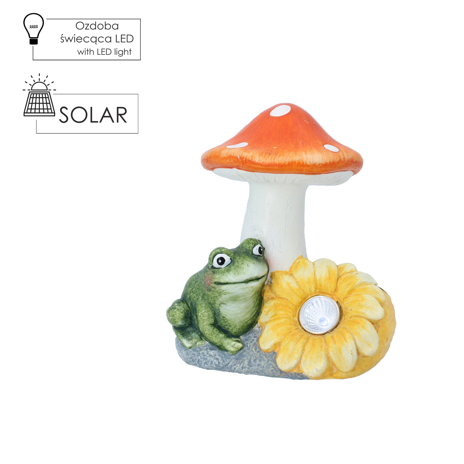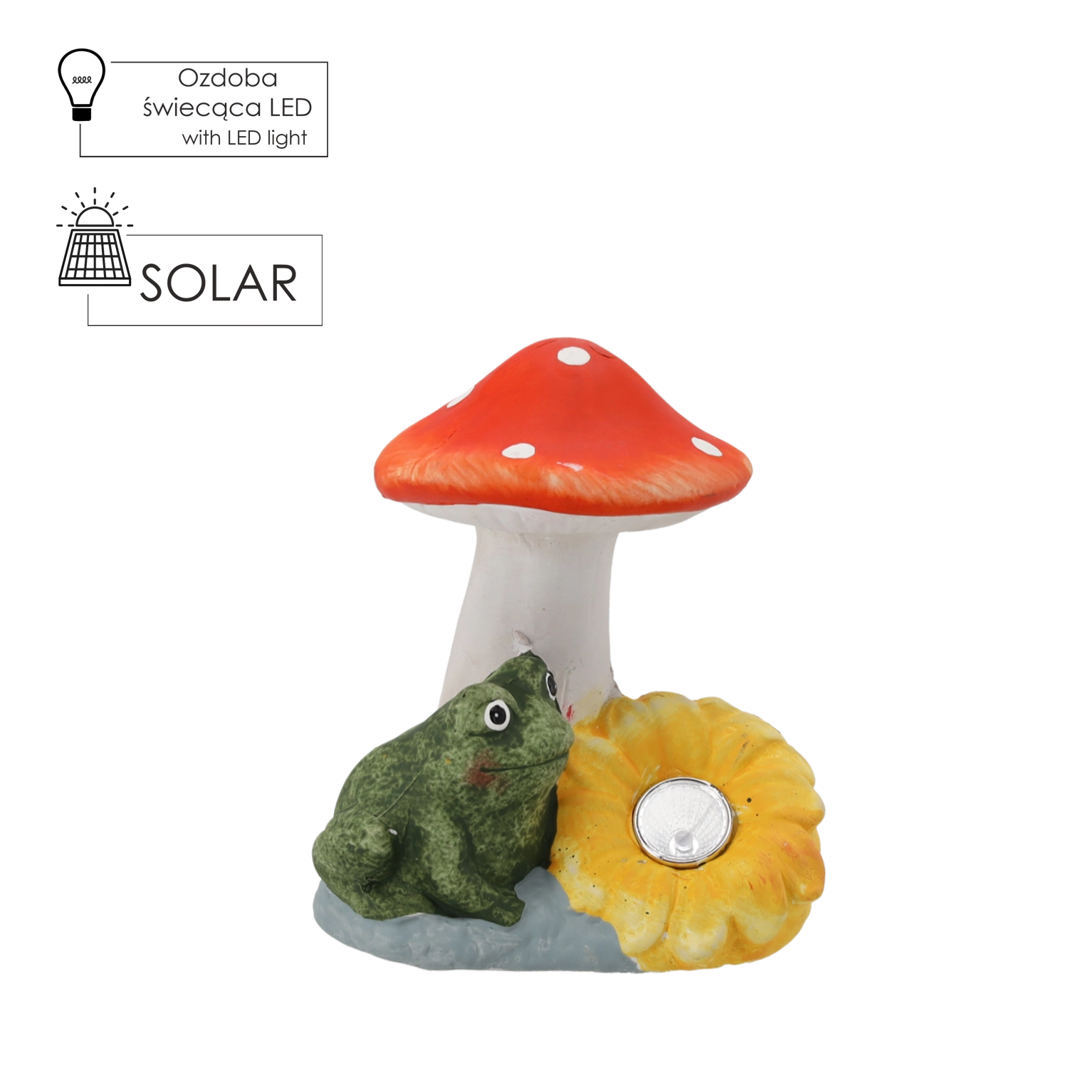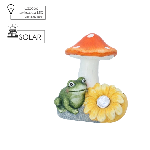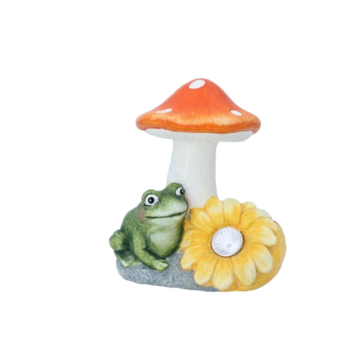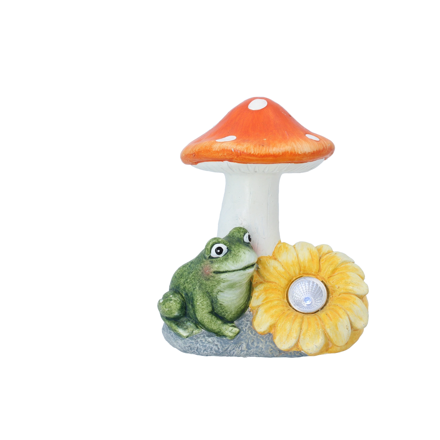 Denne charmerende havefigur kombinerer et dekorativt element med praktisk accentbelysning. Realistiske detaljer af frøen, fluesvampen og blomsten giver et legende udtryk og liver ethvert hjørne af haven, blomsterbedet, indgangen eller udendørs siddeområde op. Det indbyggede LED-lys er energieffektivt og ideelt til blid belysning af dekorationen.