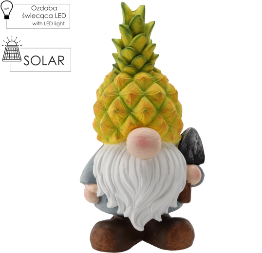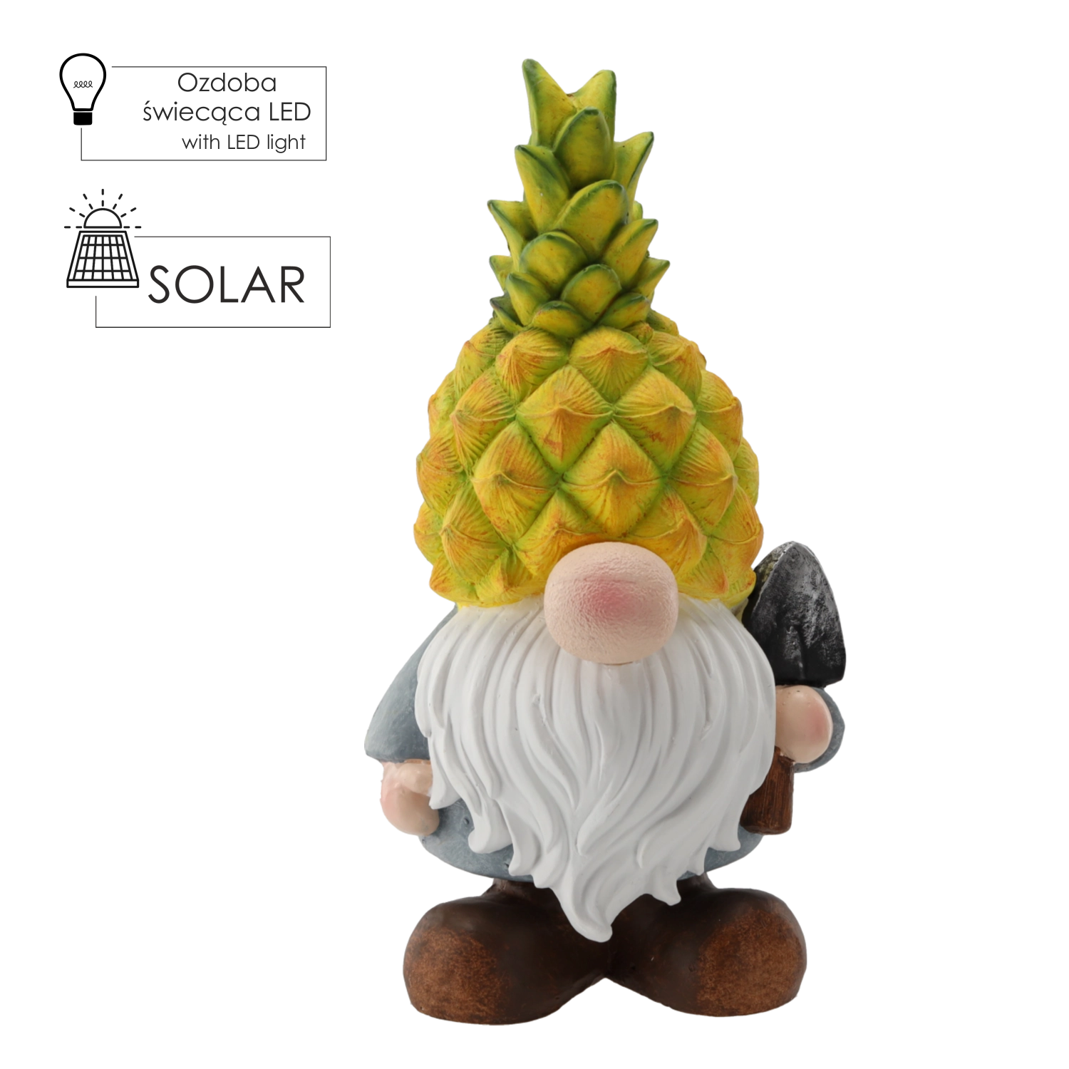 Denne charmerende nisse med ananashue er en dekoration, der gør sig bemærket både dag og nat. Det indbyggede solcelledrevne LED-lys oplades af solen i løbet af dagen og skaber en hyggelig atmosfære efter mørkets frembrud uden behov for tilslutning til elnettet.