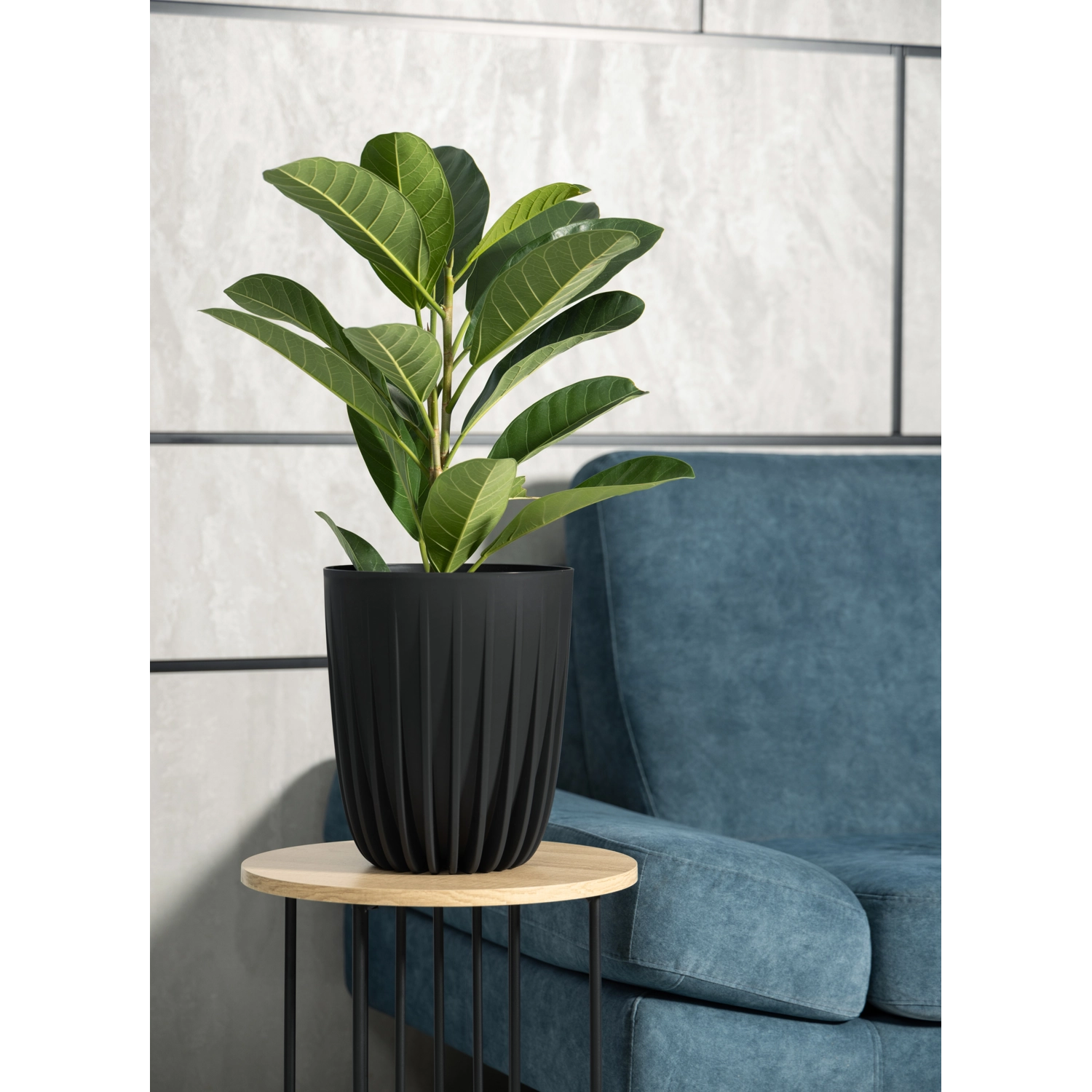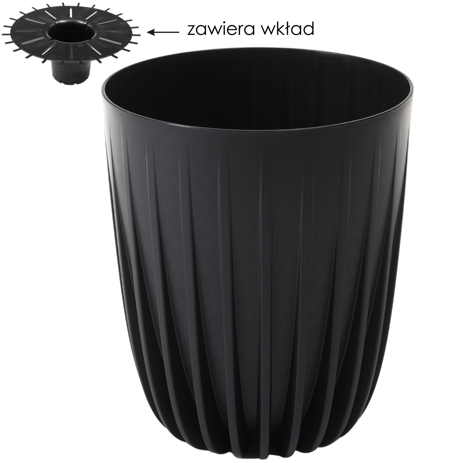 Stilfuld blomsterkrukke af 100% genanvendt plast med en diameter på 39 cm i elegant sort. Takket være den matte overflade og lodrette riller passer den perfekt til både moderne og skandinaviske interiører. Den tilspidsede form giver et slankere og let udtryk, og indsatsen i pakken sparer jord og understøtter optimal vanding. Tåler frost og UV-stråling – ideel til både indendørs brug og til terrasse eller altan.