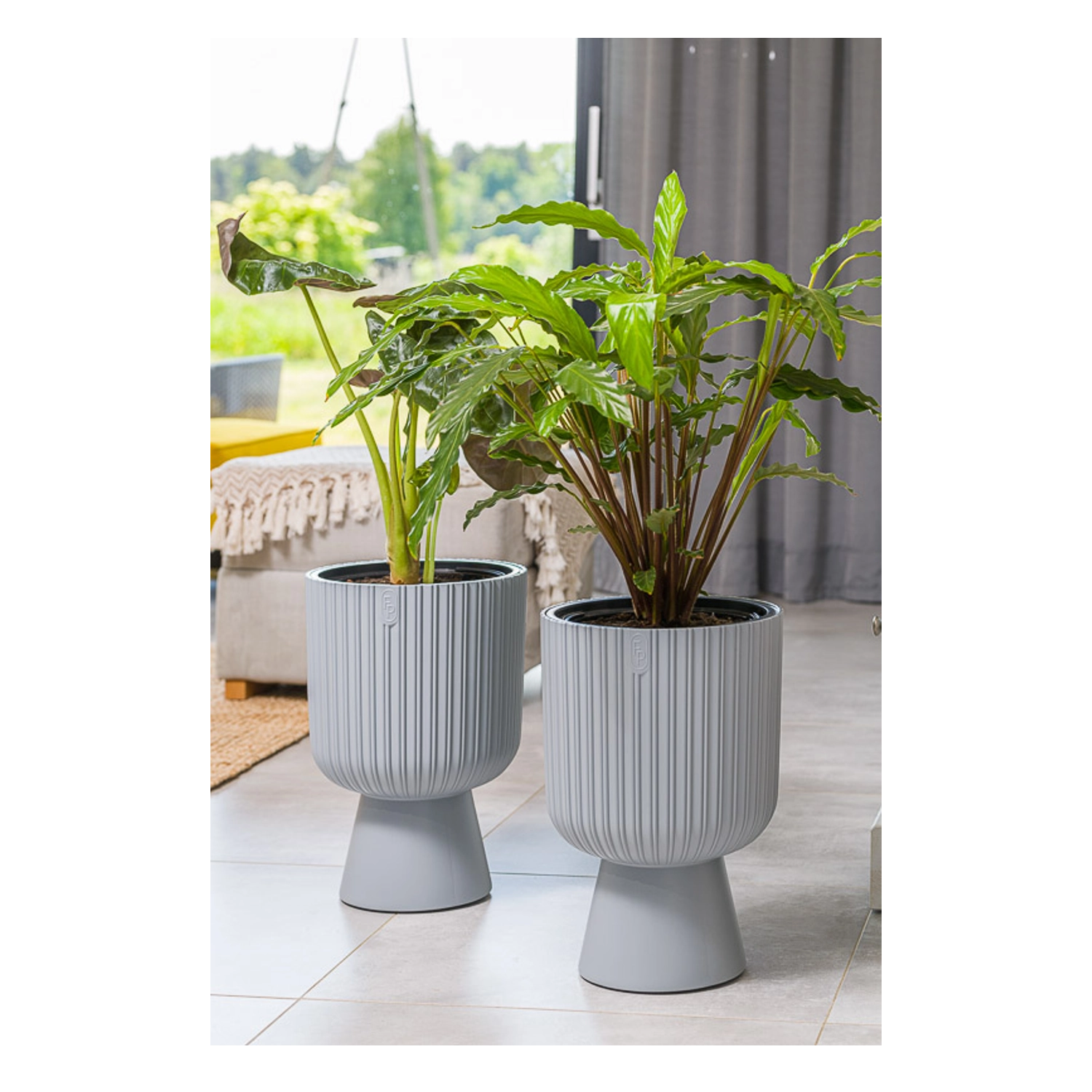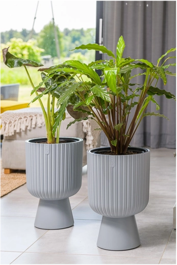 Den elegante blomsterkrukke Keli Mika 30 i platinfarve kombinerer moderne design og høj holdbarhed. Den er fremstillet af kvalitetsplast, der er modstandsdygtig over for frost og UV-stråling, så den er ideel til både indendørs og udendørs brug. Medfølger gør en aftagelig indsats med volumen på 5,5 l for nem plantning. Moderne look, holdbart materiale, praktisk indsats med greb og egnet til både inde- og udendørs brug gør den til et fremragende valg til altaner, terrasser og haver.