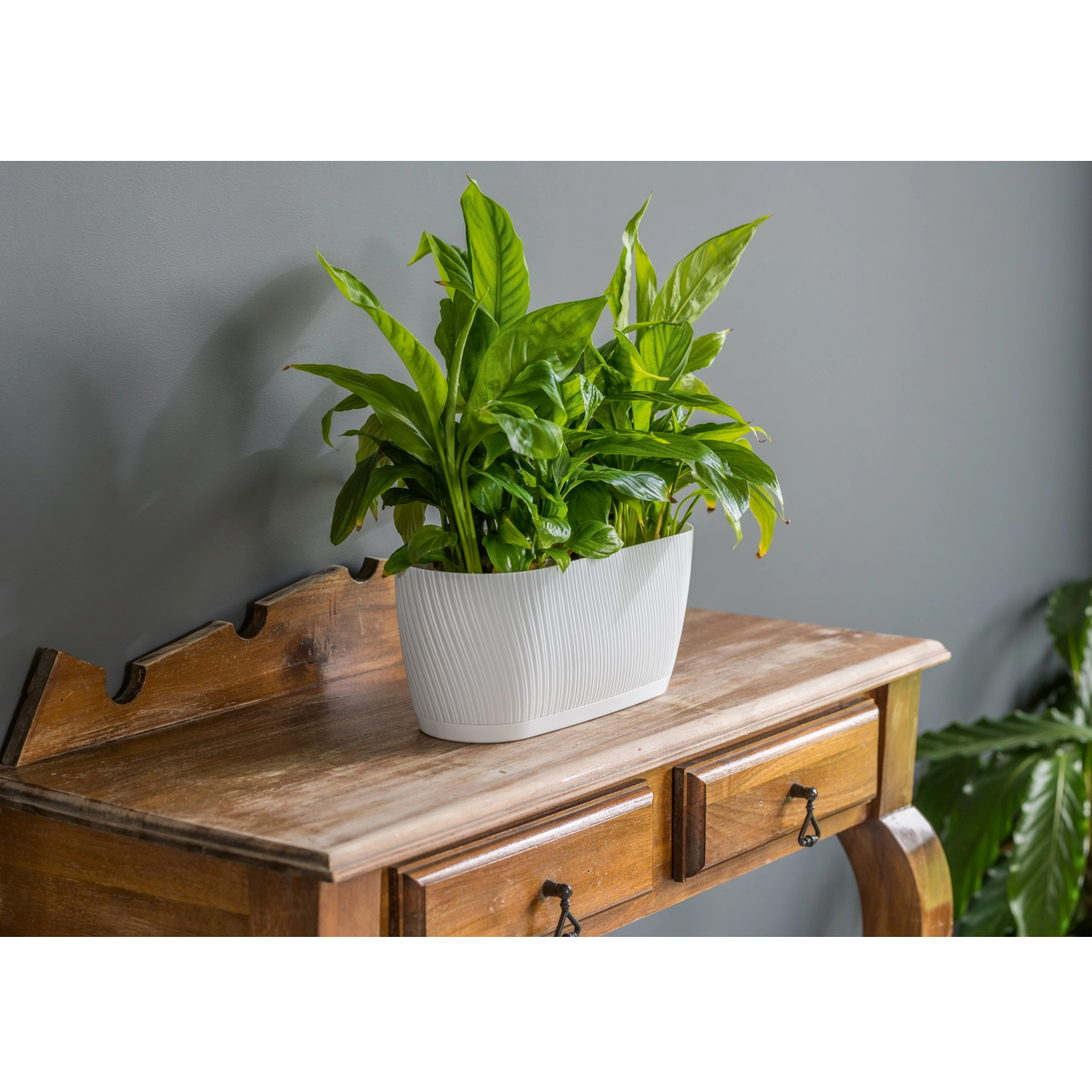 MIKA 27 cm ECO Recycled i hvid kombinerer et rent, moderne design med fine striber og hensyn til naturen. Fremstillet af genanvendt plast, hvilket giver lang levetid og lav vægt, så den er nem at flytte og rengøre. Den integrerede underbakke forbedrer planteplejen og holder omkringliggende overflader tørre.