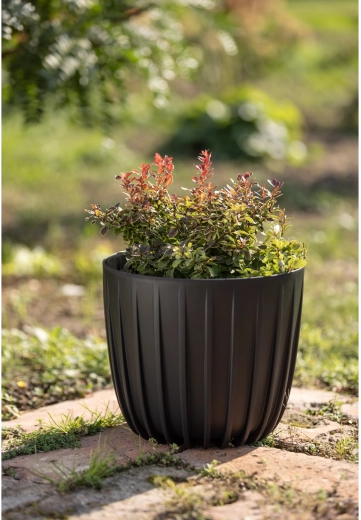 Den elegante urtepotte Mira i sort imponerer med sin moderne, nedadtil tilspidsede form og lodrette riller, som giver den et unikt udtryk. Den er fremstillet af 100% genanvendt plast, er let, modstandsdygtig over for ridser og vejr og egner sig til både indendørs og udendørs brug. Ideel til blomstrende og grønne planter.