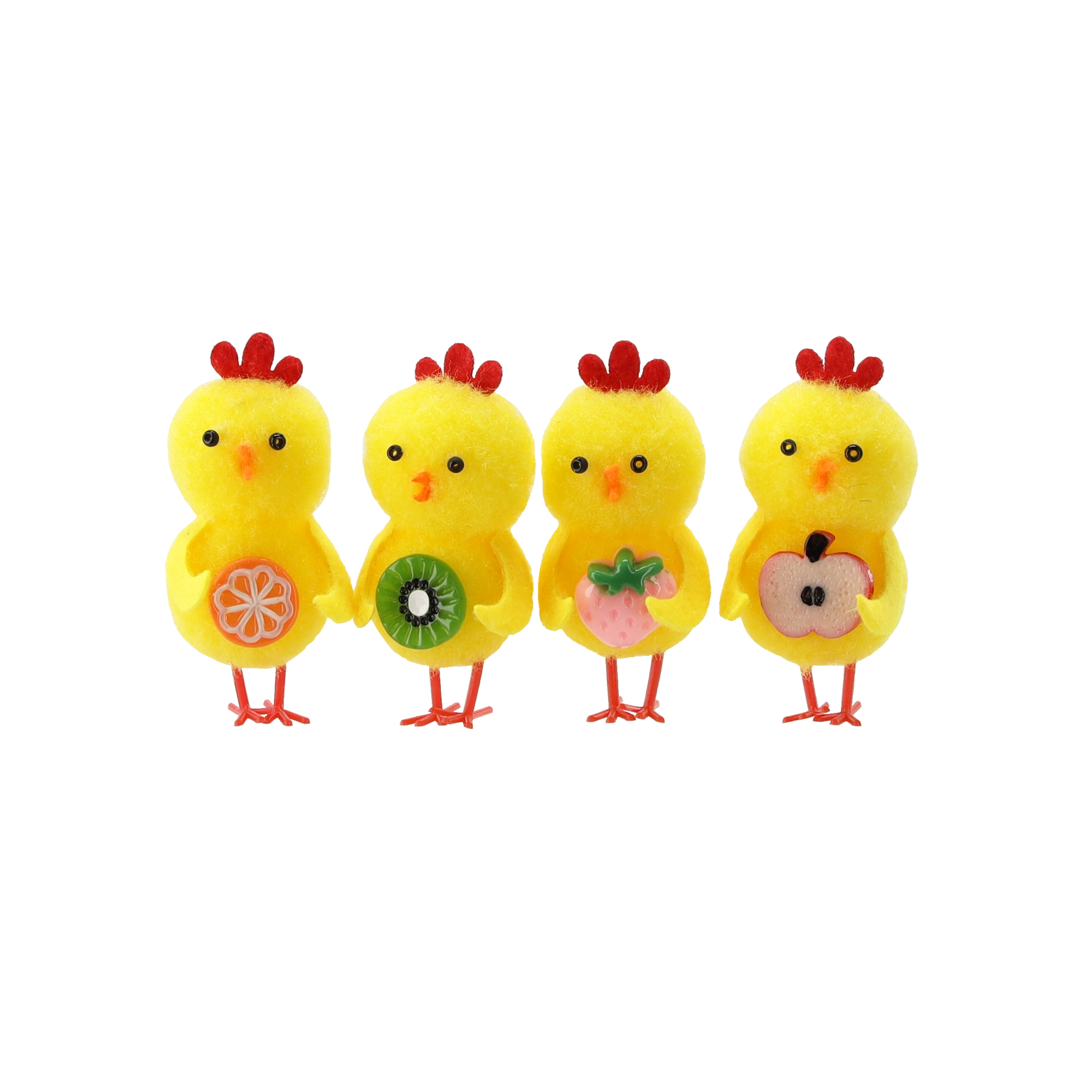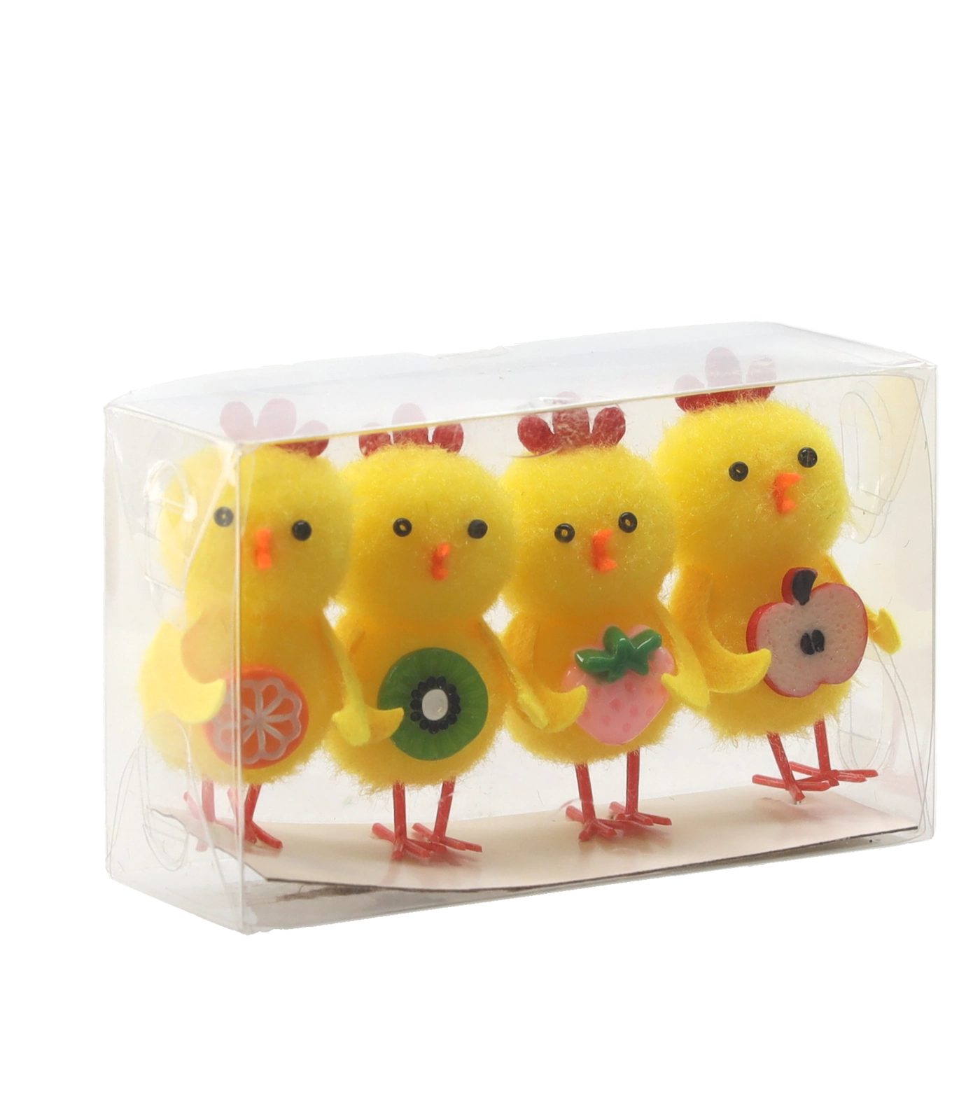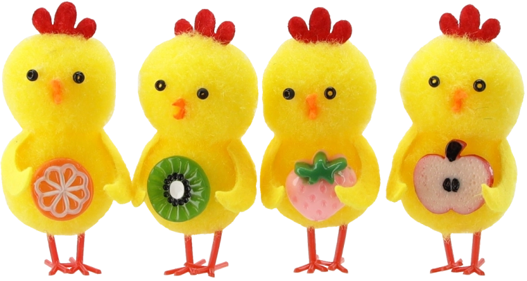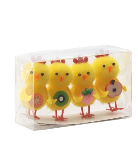 Et stilfuldt sæt med 4 dekorationer vil glæde alle, der elsker forårstemaer. Hver kylling holder frugt, som symboliserer overflod og en ny begyndelse, og de passer perfekt til påskebordet, vindueskarmen og forårsarrangementer. Takket være farvemikset matcher du nemt ornamenterne med den øvrige pynt.