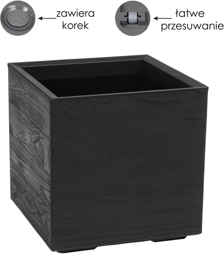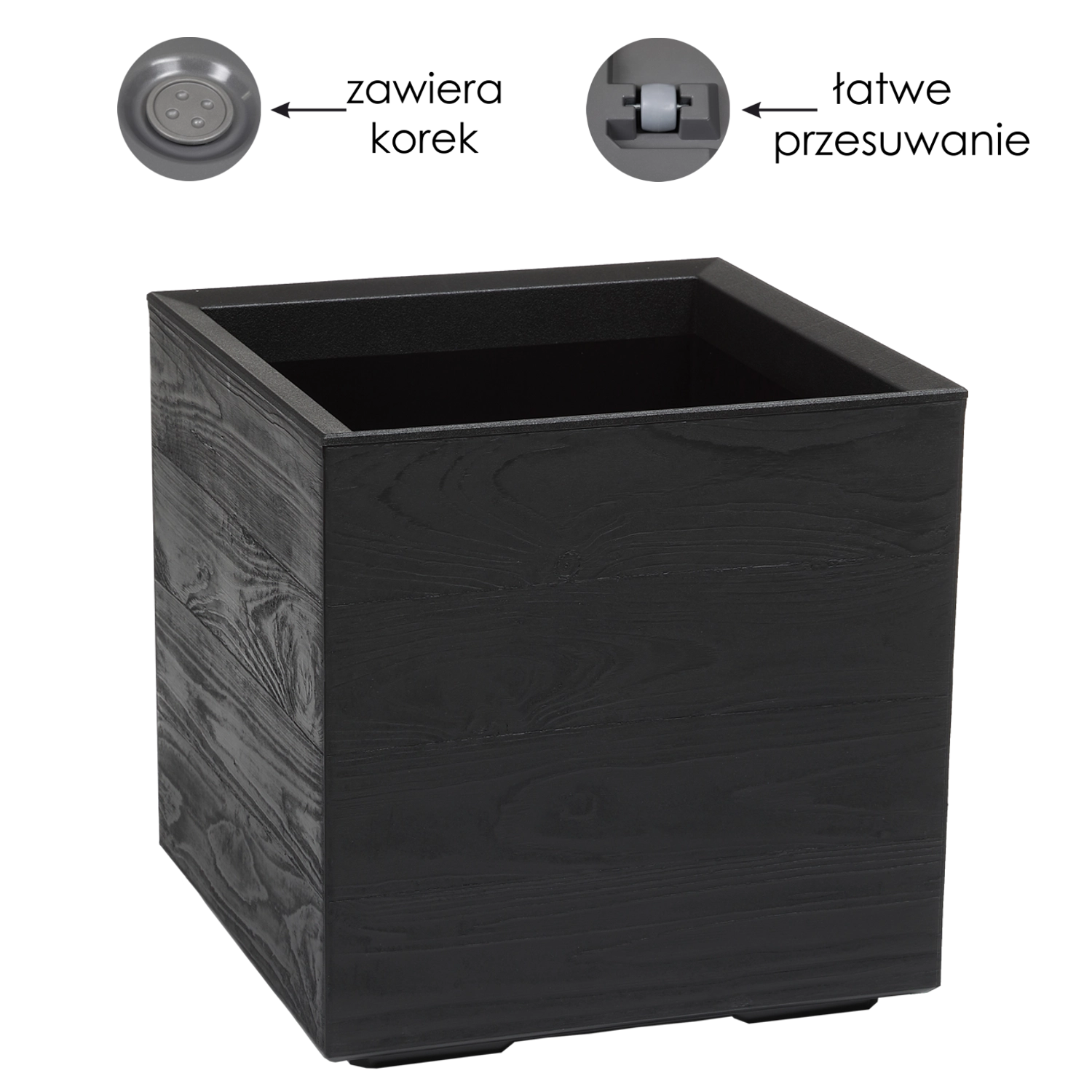 Den moderne plantekrukke Lamela Karo er en stilfuld og miljøvenlig løsning til både inde og ude. Den efterligner troværdigt beton, men er let takket være produktion af genanvendte materialer. Den tilbyder integreret vandafledning med prop, praktiske hjul for nem flytning og en elegant sort overflade med træimitation, som passer til mange indretningsstile.