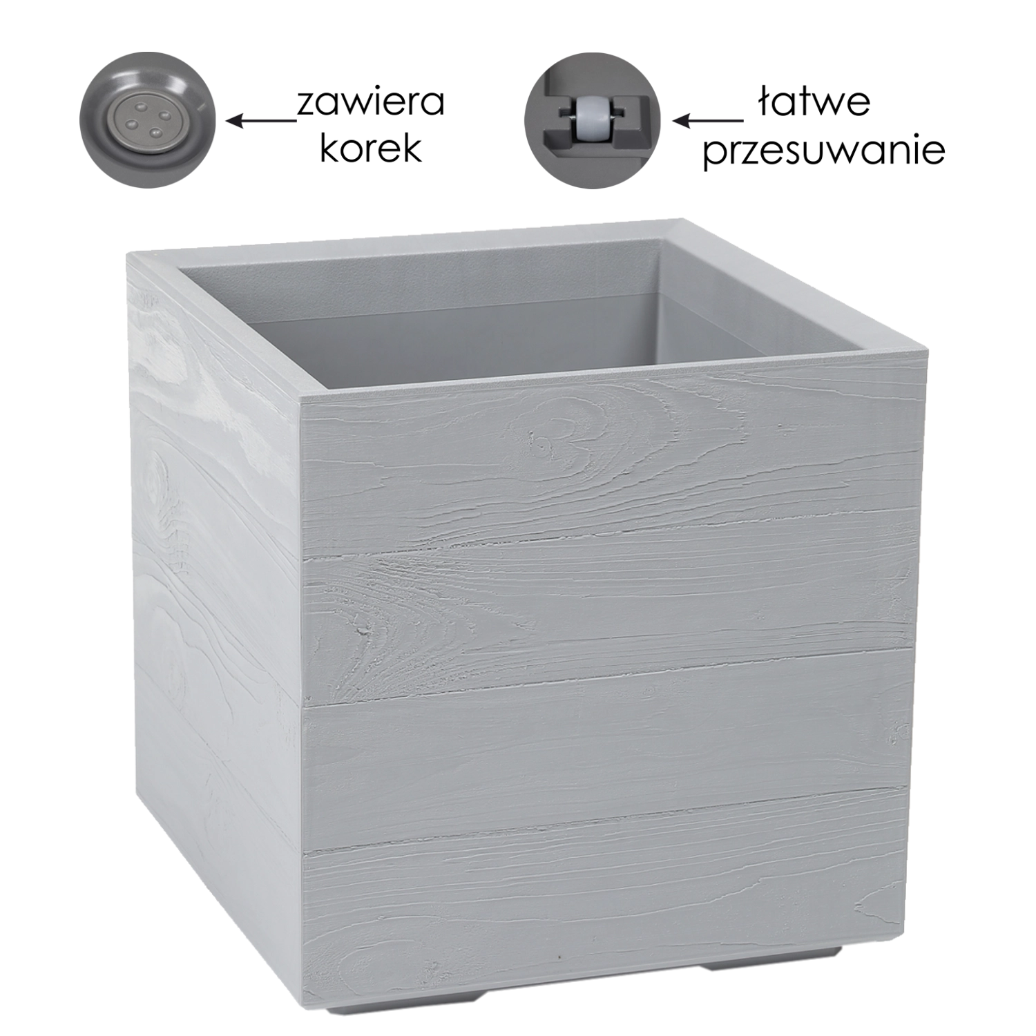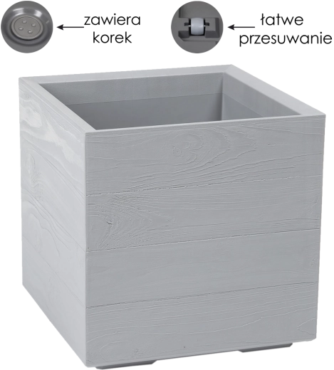 Den praktiske udrustning omfatter integreret dræn med aftagelig prop for nem regulering af vanding samt hjul, der gør det bekvemt at flytte selv en fuldt beplantet potte. Ideel til altaner, terrasser og opholdsrum.