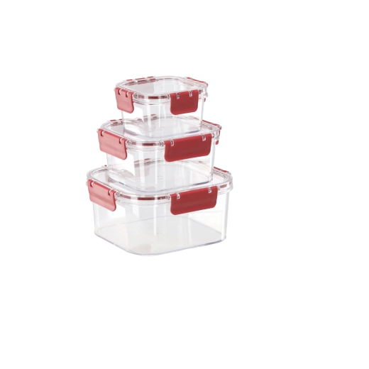 Hold orden i køkkenet med et sæt af tre indbyrdes stabelbare firkantede beholdere. De forskellige størrelser 0,4 l, 0,9 l og 1,8 l dækker alt fra snacks og rester til større portioner. De gennemsigtige sider giver øjeblikkeligt overblik uden at åbne, og de tætsluttende låg med klips beskytter mod lugtudslip og udtørring.